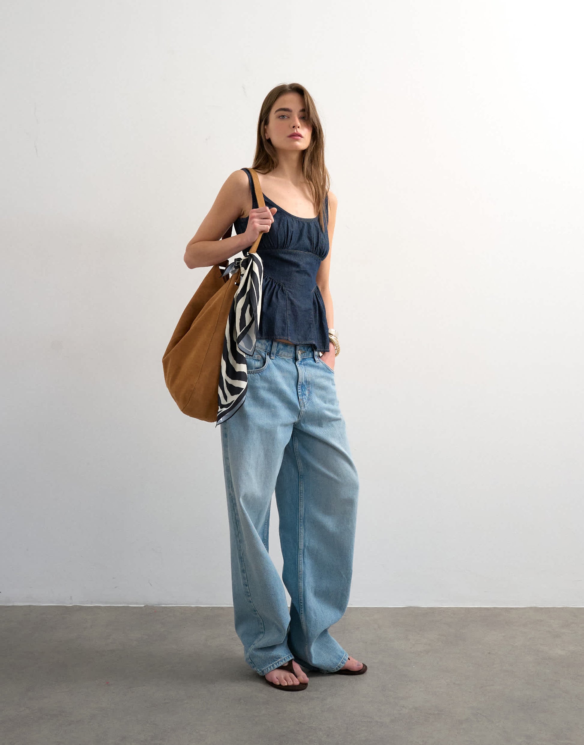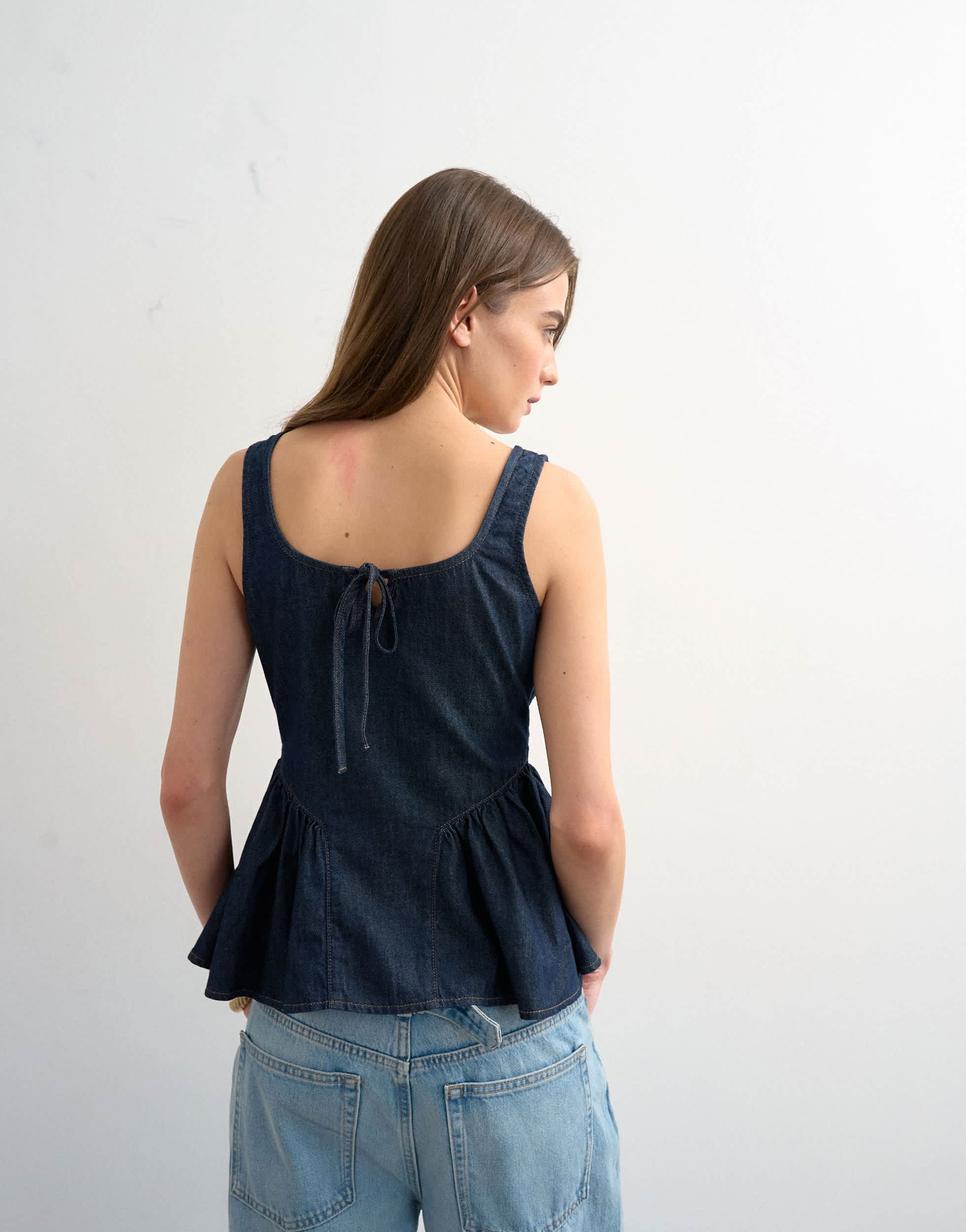 Tops by TopshopThis top is crafted from non-stretch denim in a mid-blue shade. Featuring a scoop neck, fixed straps and a peplum hem, this style fastens with a tie to the back and is cut to a regular fit.
