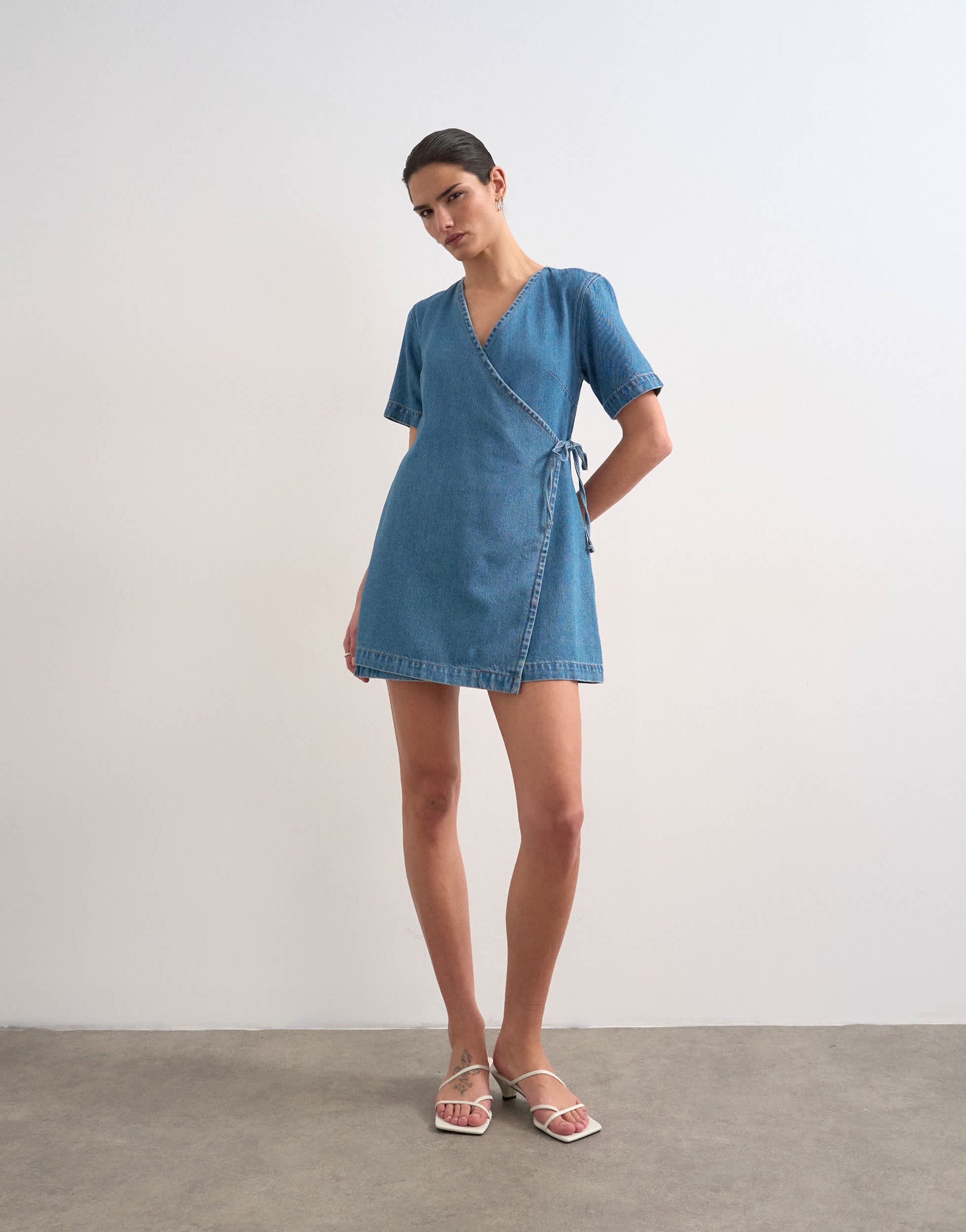 Dresses by TopshopThis wrap dress is cut from lightweight, non-stretch denim. It has a V-neck, short sleeves and ties to the side.