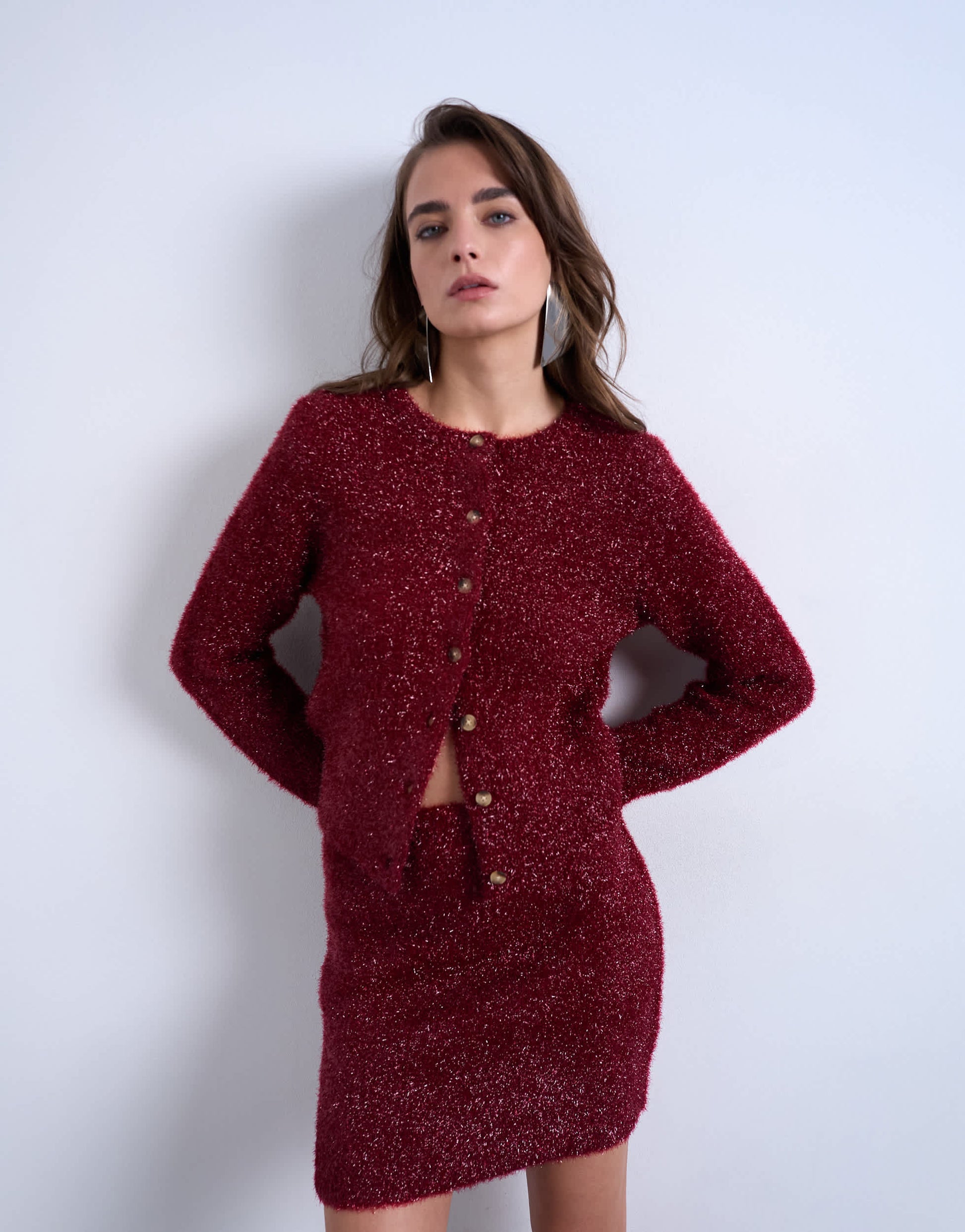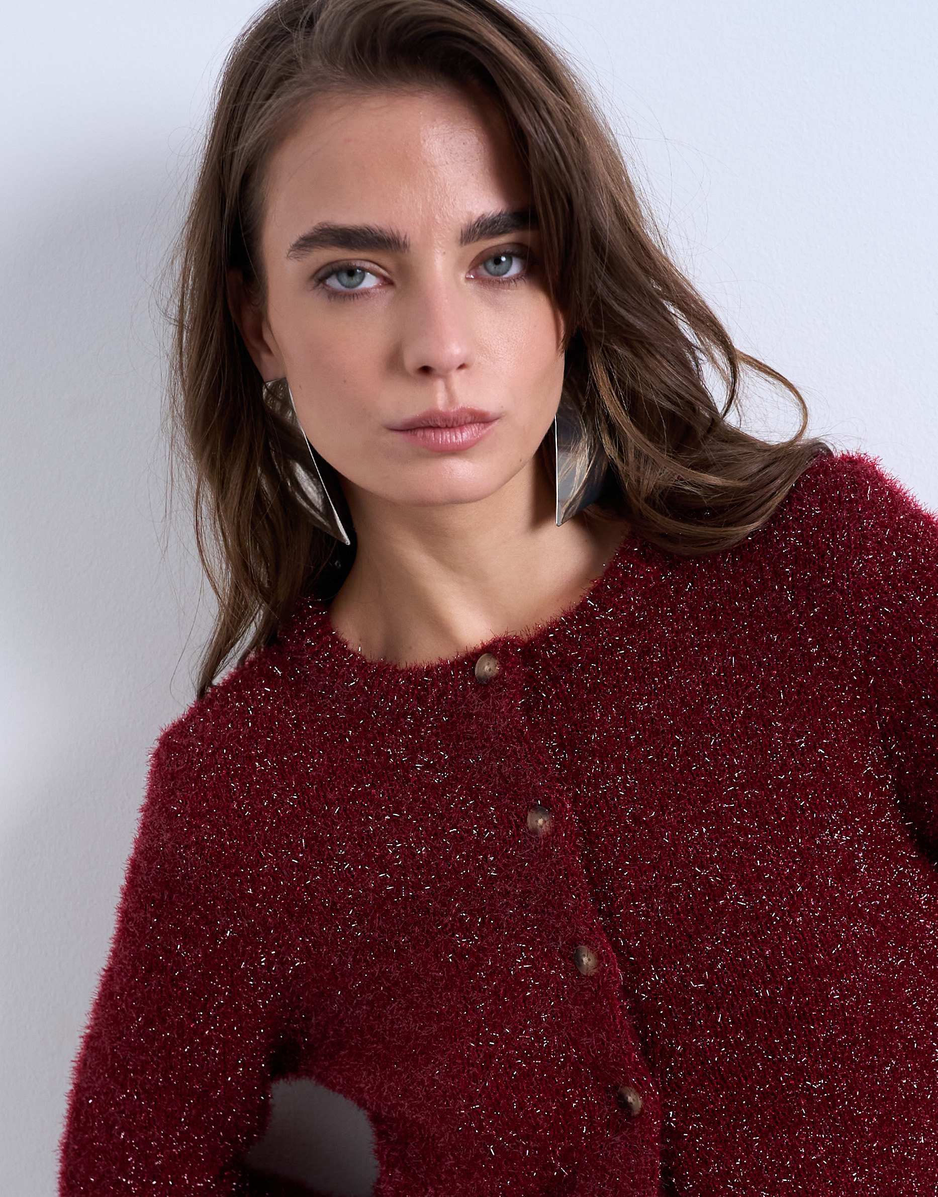 Jumpers & Cardigans by TopshopThis cardigan is crafted from a shimmer knit in a burgundy shade. It features a round neck, button placket and long sleeves. It is cut to a slim fit for a tailored feel.
