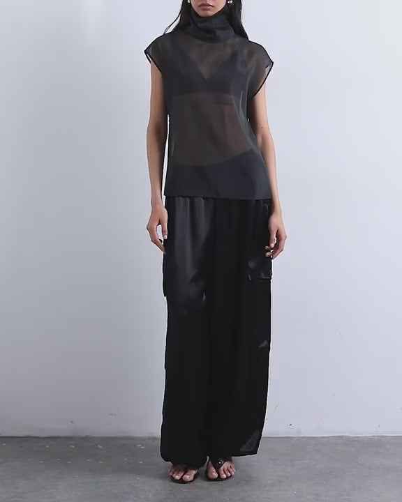 These cargo trousers are crafted from soft, satin-style fabric in black. Featuring a low-rise waist, this style is complete with functional pockets and a zip to the side. They are cut to a balloon fit for a roomy, oversized finish.