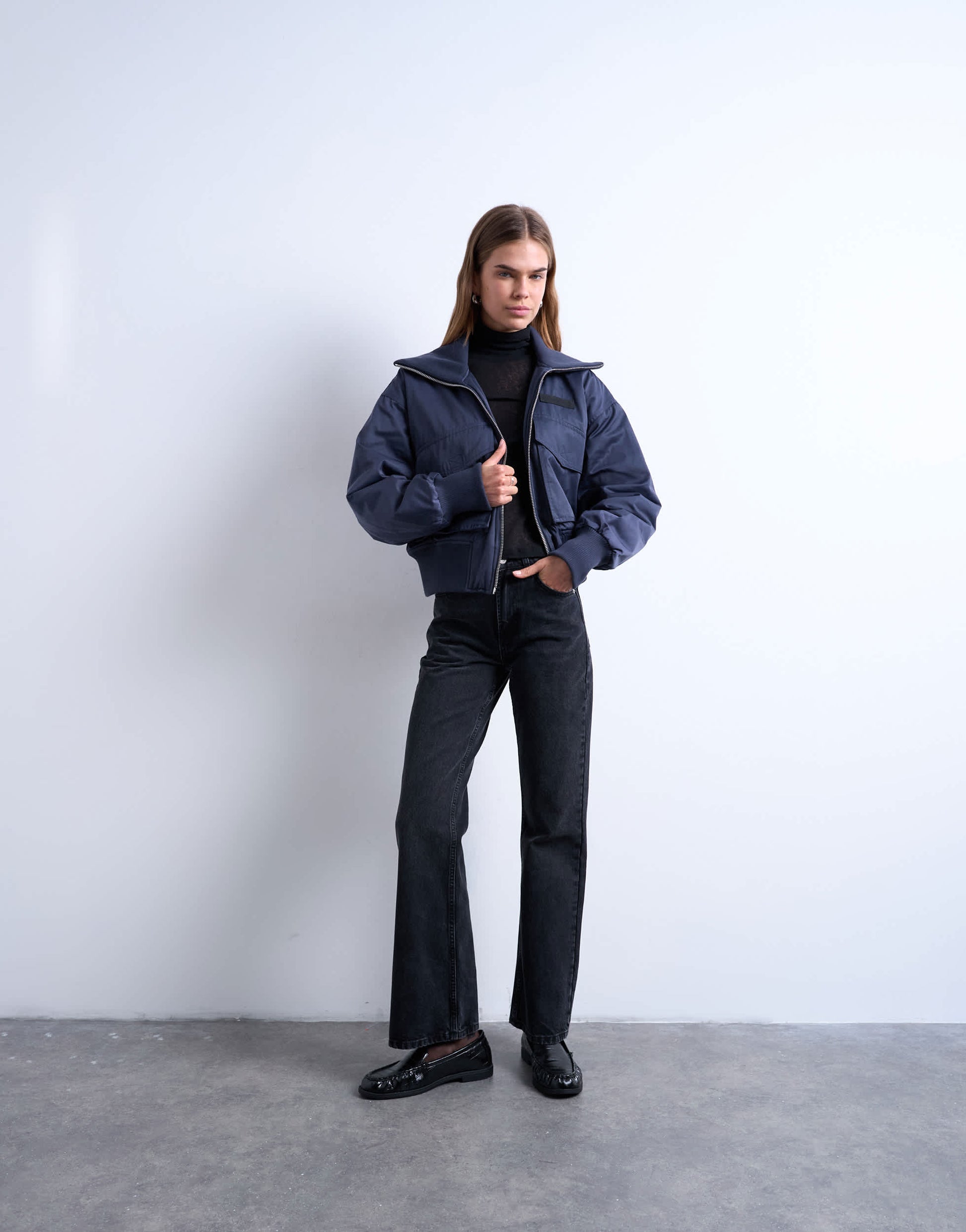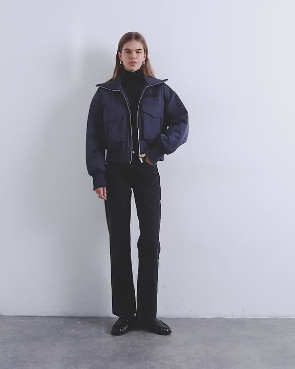 Topshop rib wide collar short bomber jacket in navy