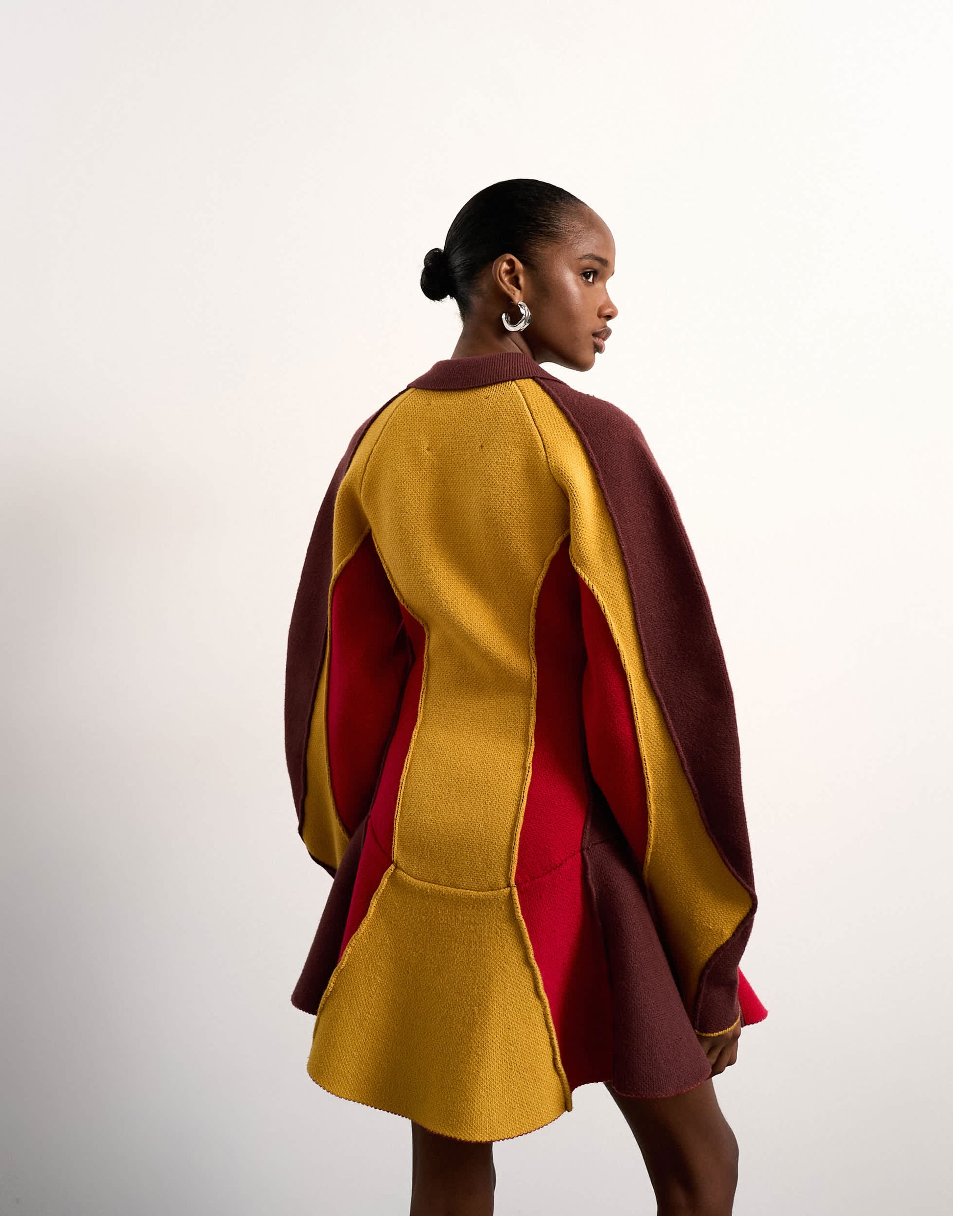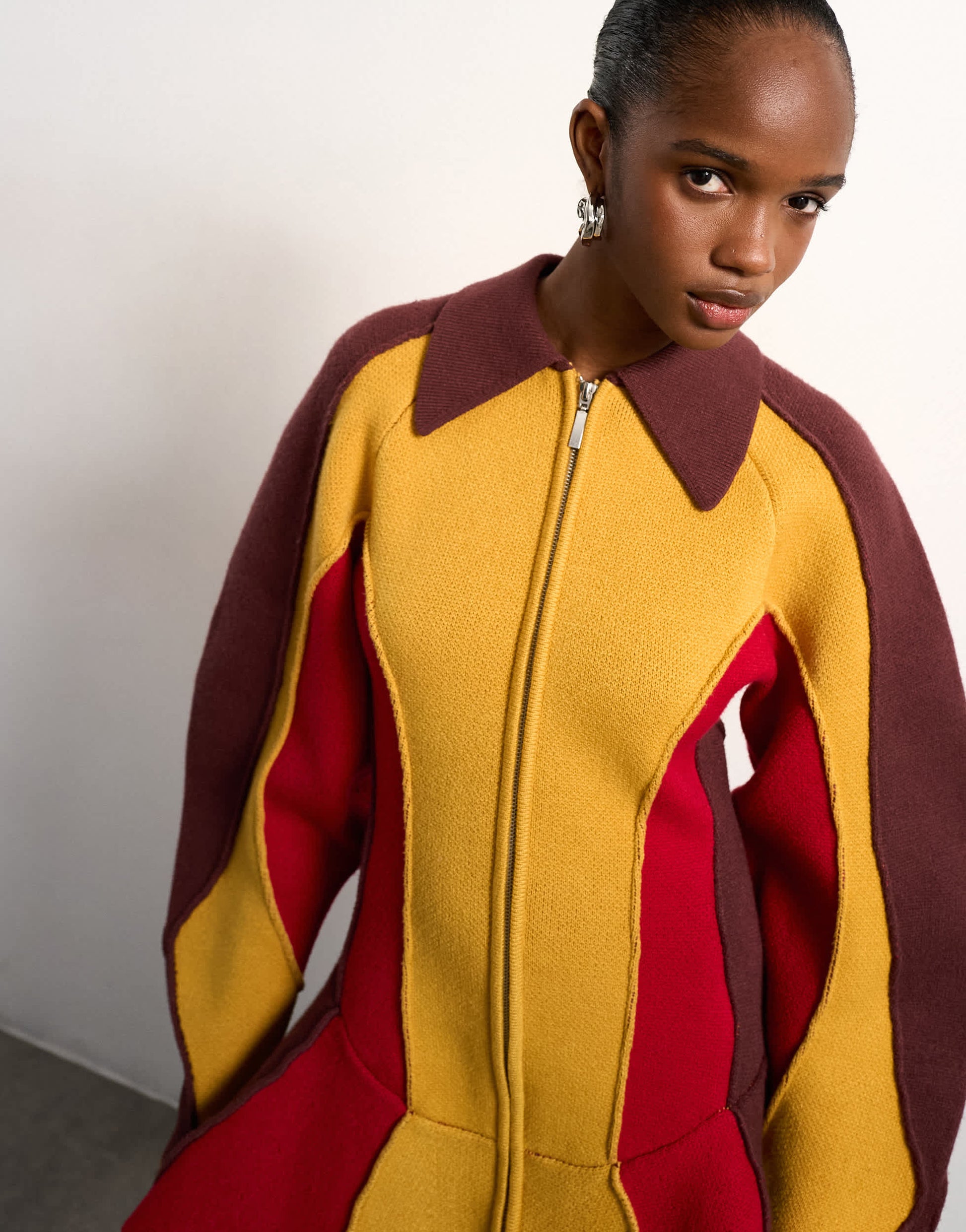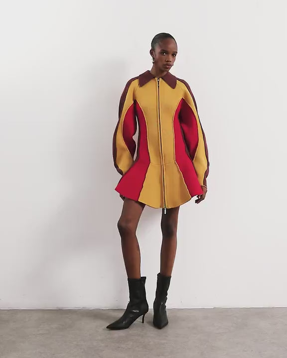 This dress is crafted from a thick, knitted fabric with a colour-block design. It features a structured silhouette with a spread collar, zip fastening, long sleeves and is cut with a regular fit.
