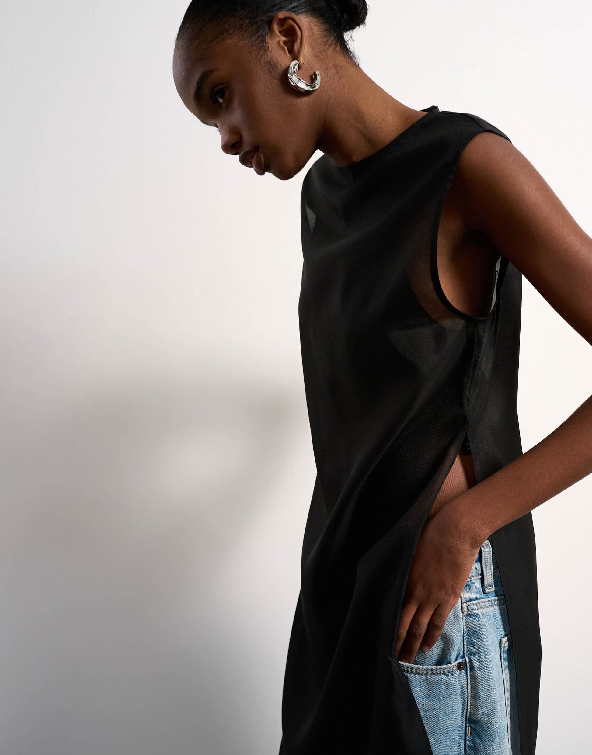 Tops by TopshopThis top is crafted from a lightweight, sheer fabric. The sleeveless style features a round neck, split sides and longline cut.