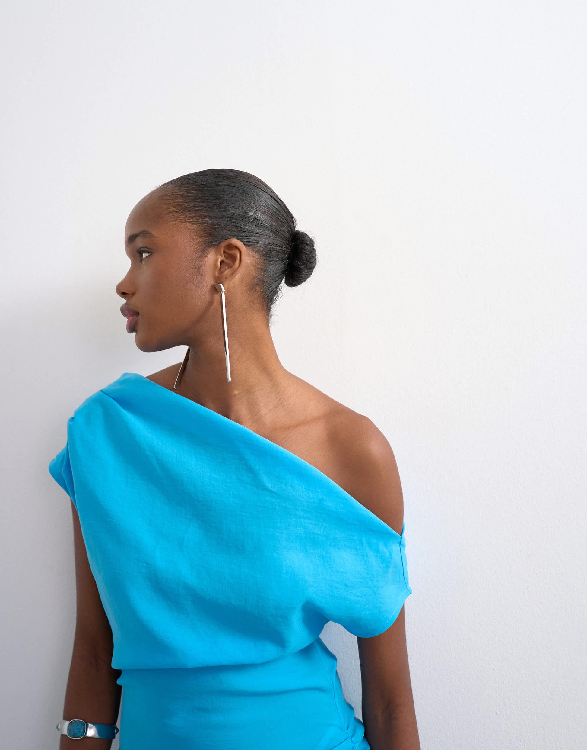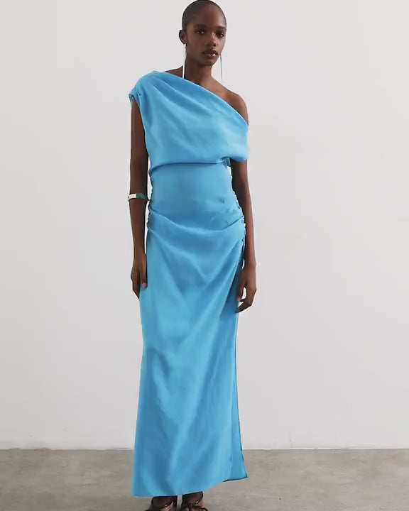 This dress is crafted from woven fabric in an electric blue shade. The one-shoulder design features short sleeves, ruched detailing and a side split on a regular fit.