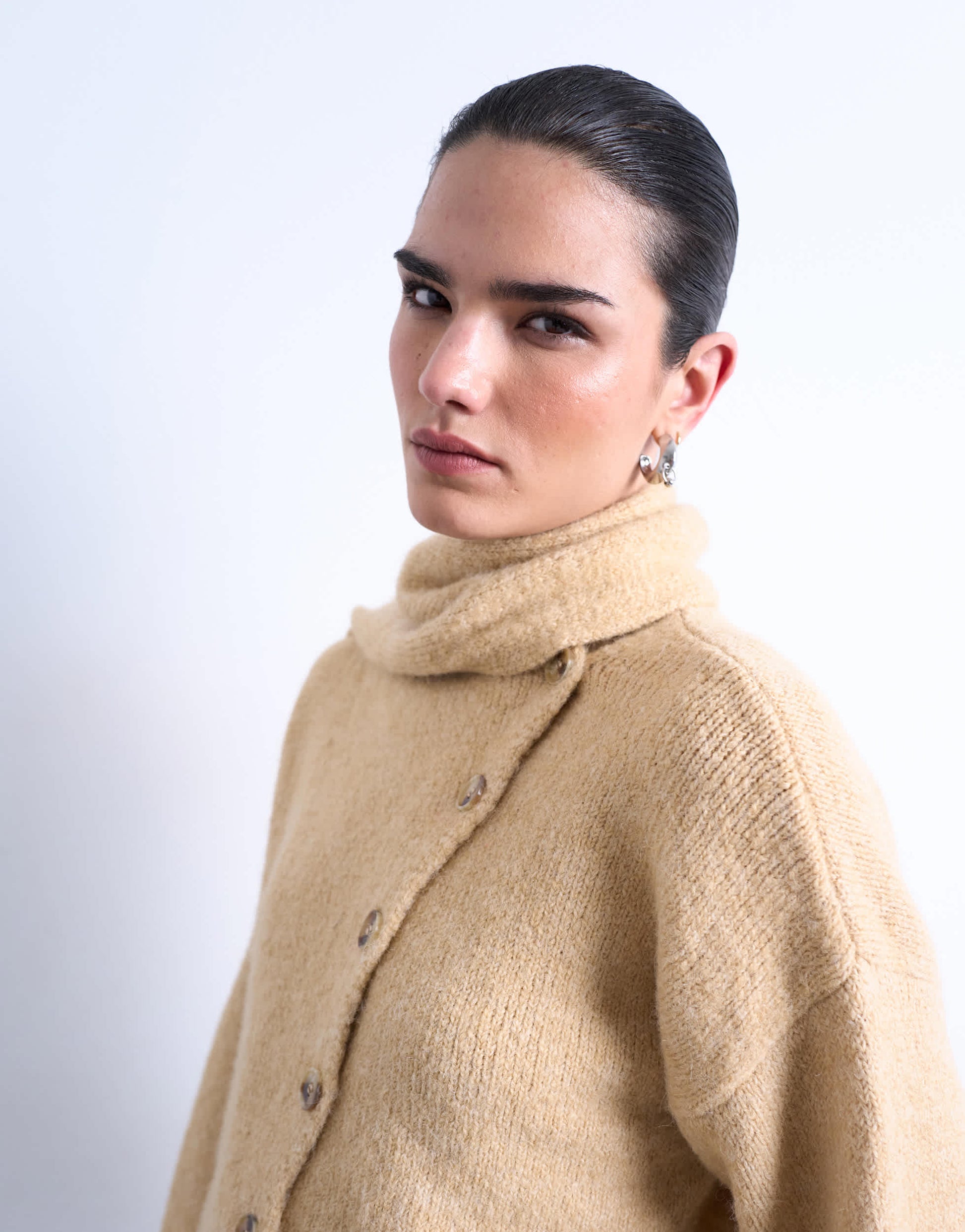 Jumpers & Cardigans by TopshopThis cardigan is made from a soft, mid-weight knit in a cream shade. It features an asymmetric button placket, drop shoulders and a scarf panel on a regular fit.