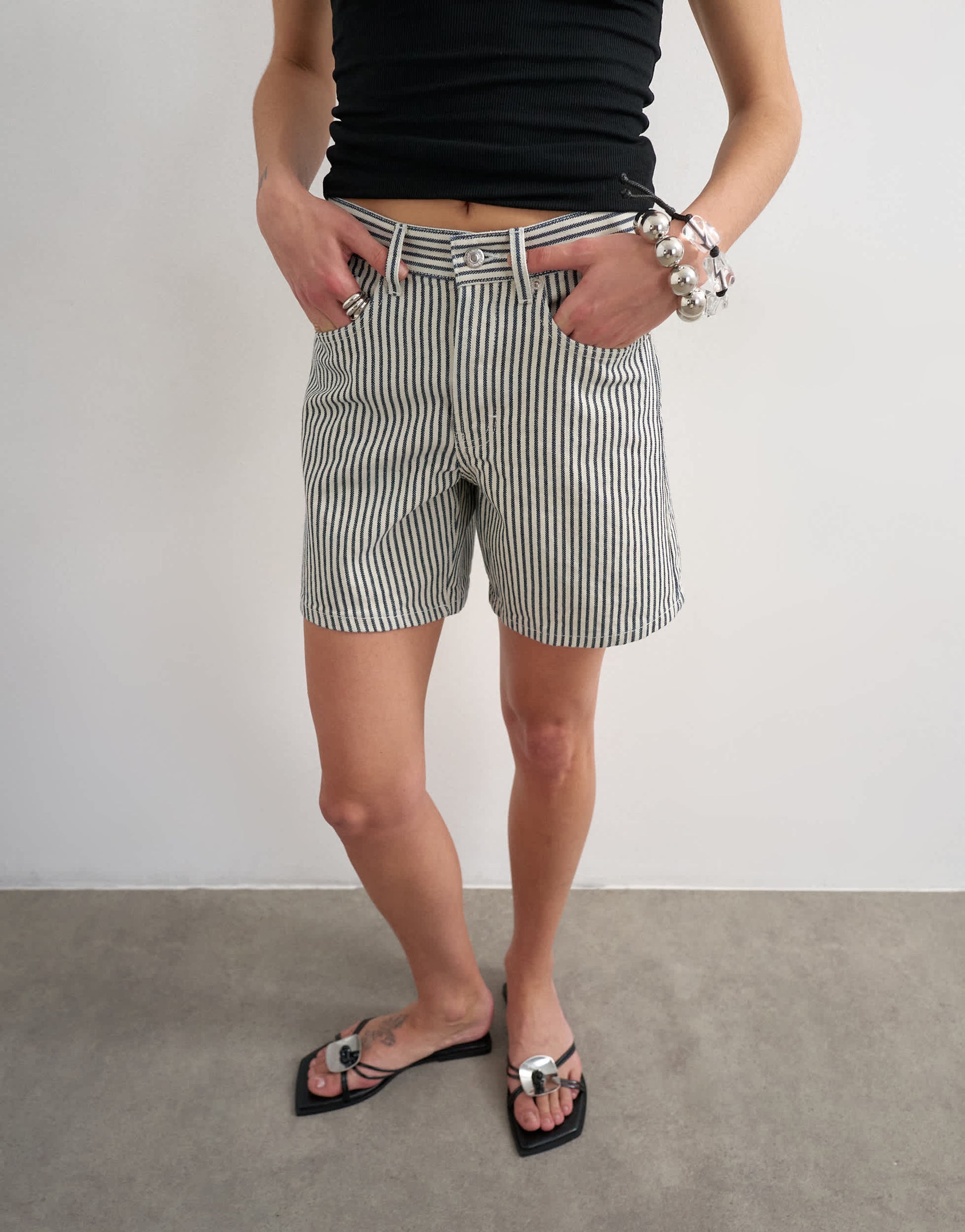 Shorts by TopshopThese shorts are crafted from non-stretch denim in a stripe design. They feature a high-rise waist, belt loops, functional pockets and a branded patch to reverse. They are cut with a regular fit.