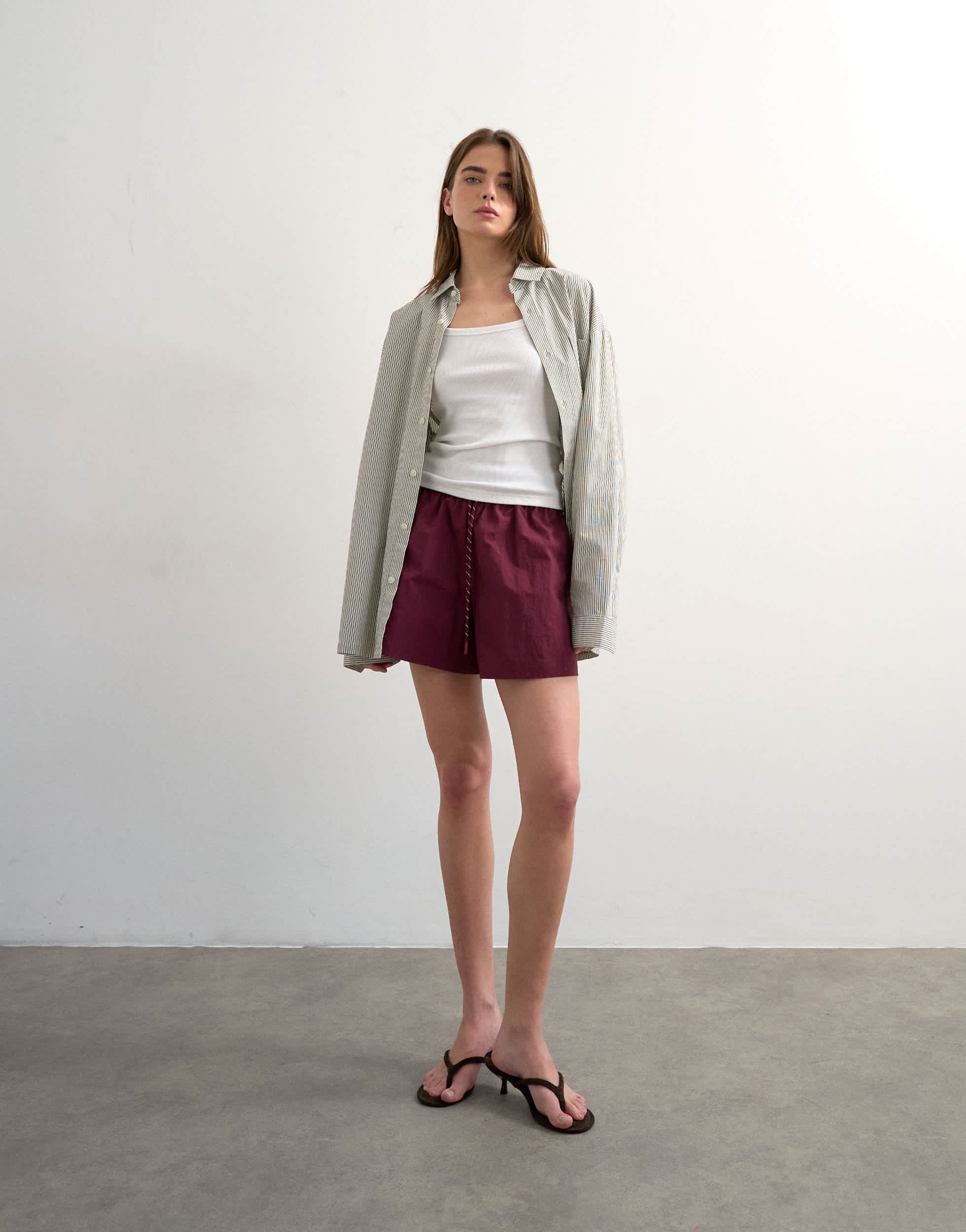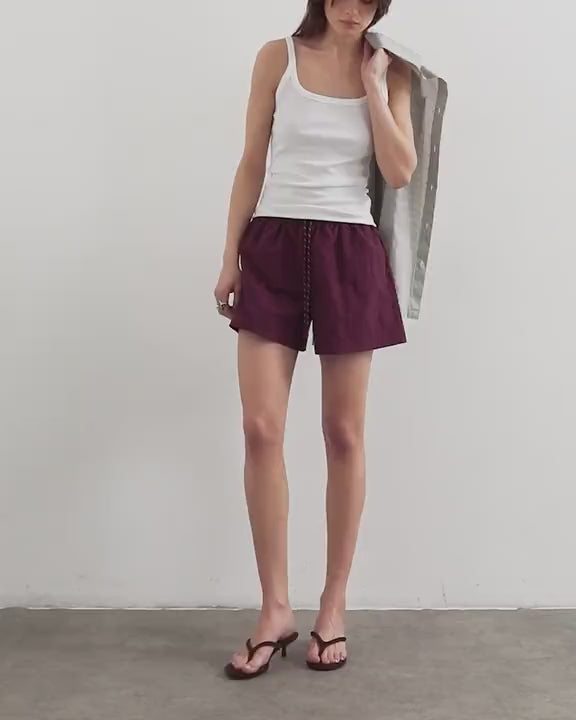 Shorts by TopshopThese shorts are crafted from smooth woven fabric in a burgundy shade. They feature an elasticated drawstring waist and side pockets and are cut to a regular fit.