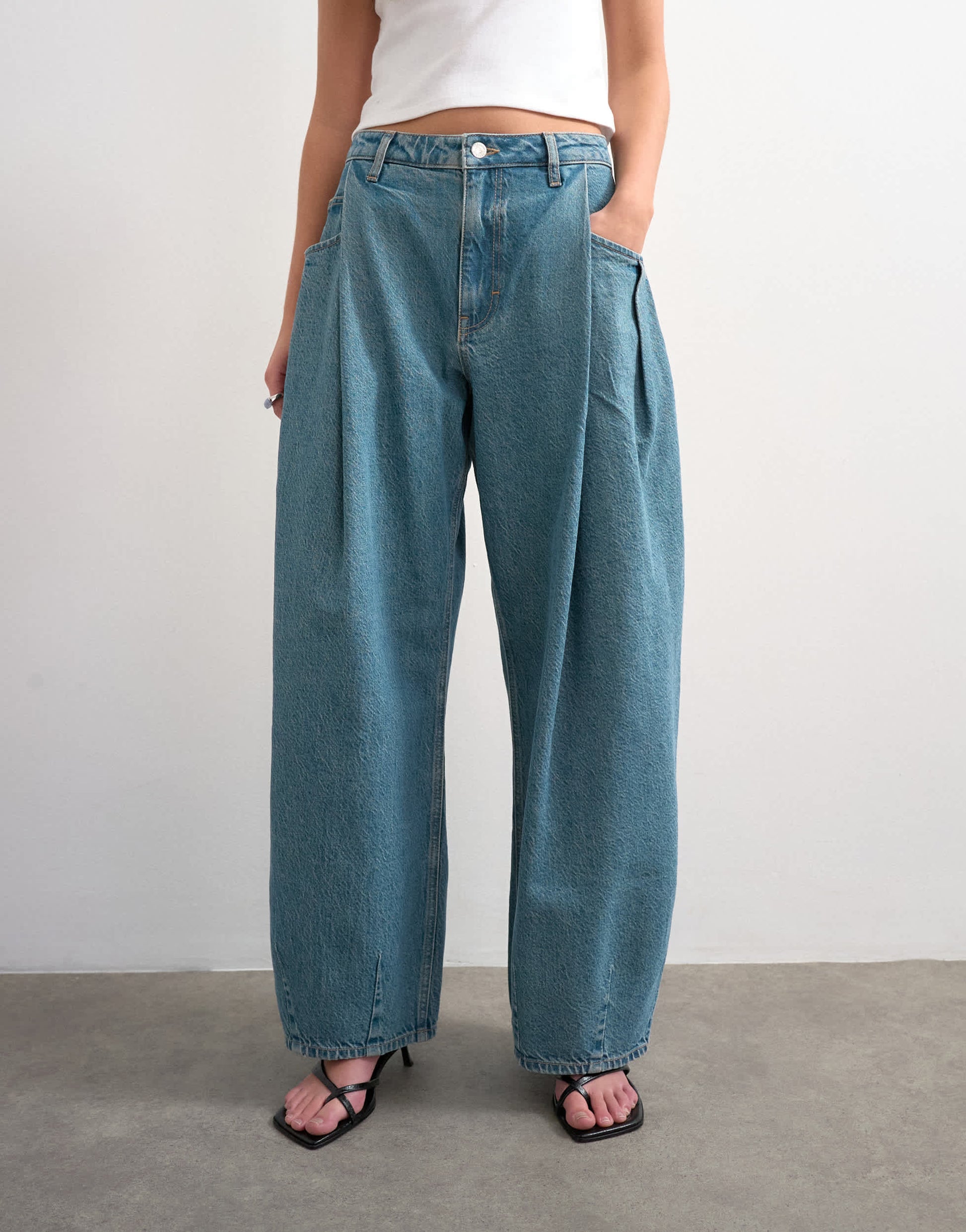 Jeans von TopshopDie Cocoon Barrel Jeans zeichnet sich durch einen mittelhohen Bund und ein markantes, fassförmiges Bein mit Bundfalten aus. Ausgestattet mit Gürtelschlaufen, einem Reißverschluss und vier funktionalen Taschen, ist dieses Modell aus robustem Denim in einer blaugrünen Waschung gefertigt.