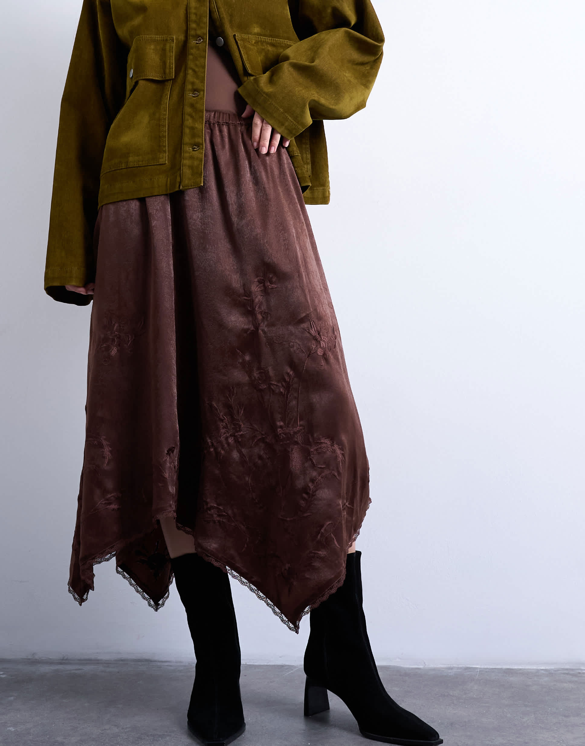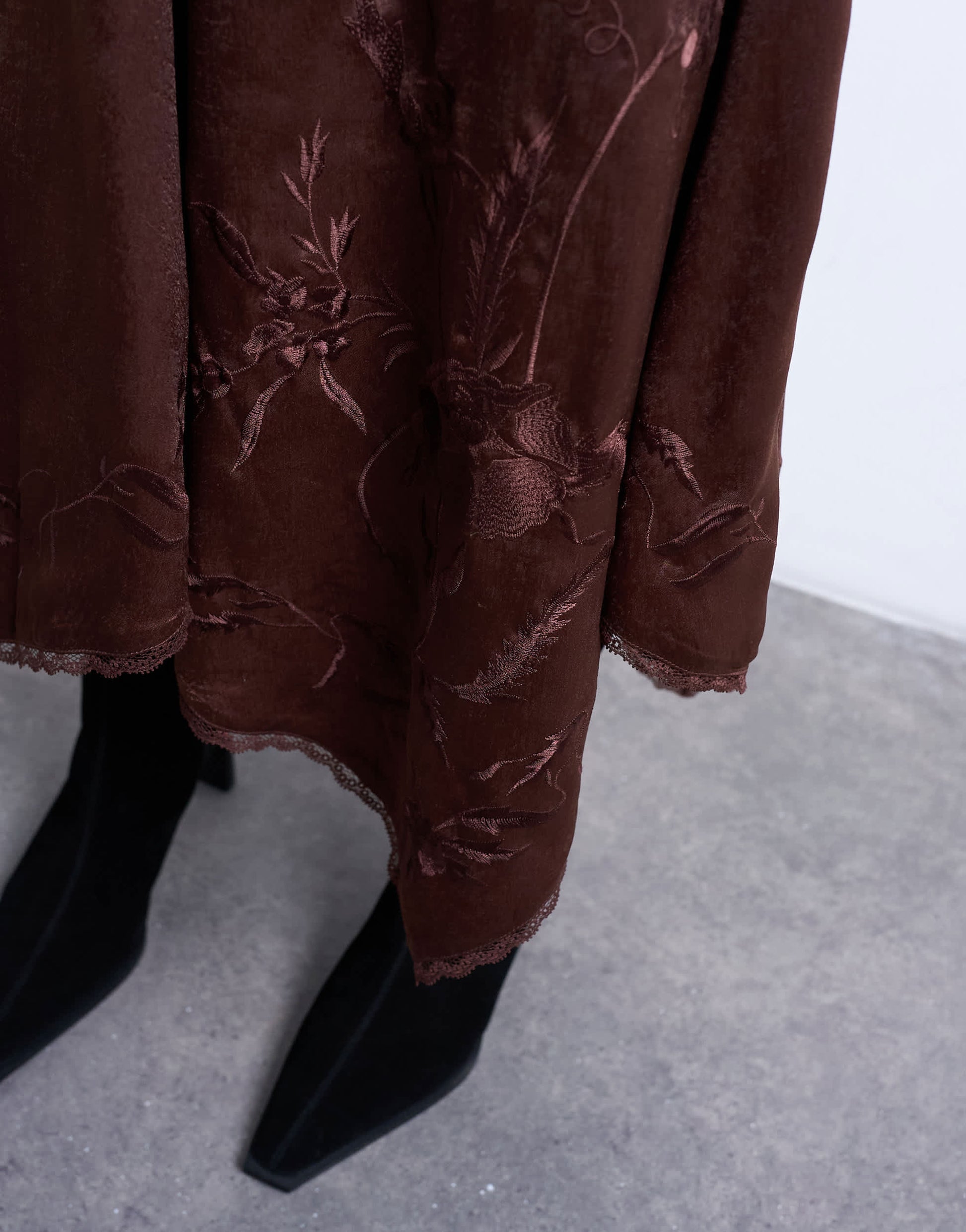 Topshop Satin-Midirock mit asymmetrischem Saum und Spitzenstickerei in Schokoladenbraun