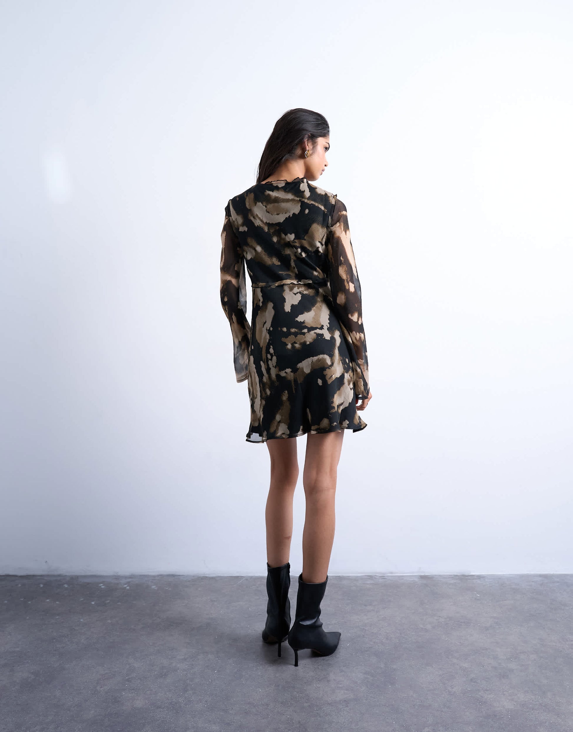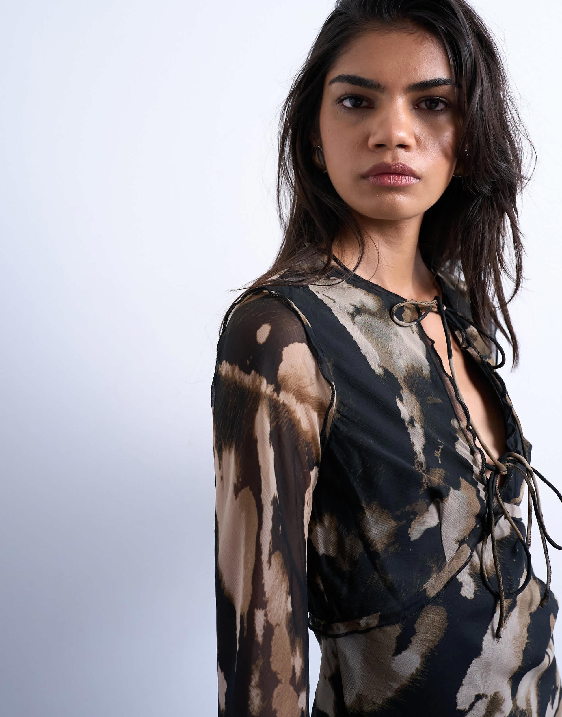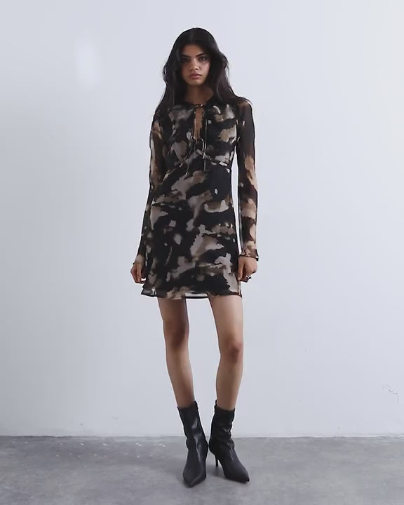 Kleider von TopshopDieses Kleid aus fließendem, transparentem Chiffon besticht durch einen abstrakten Print. Es hat einen Rundhalsausschnitt, Bindebänder vorne, lange Ärmel, einen Wellensaum und eine normale Passform.