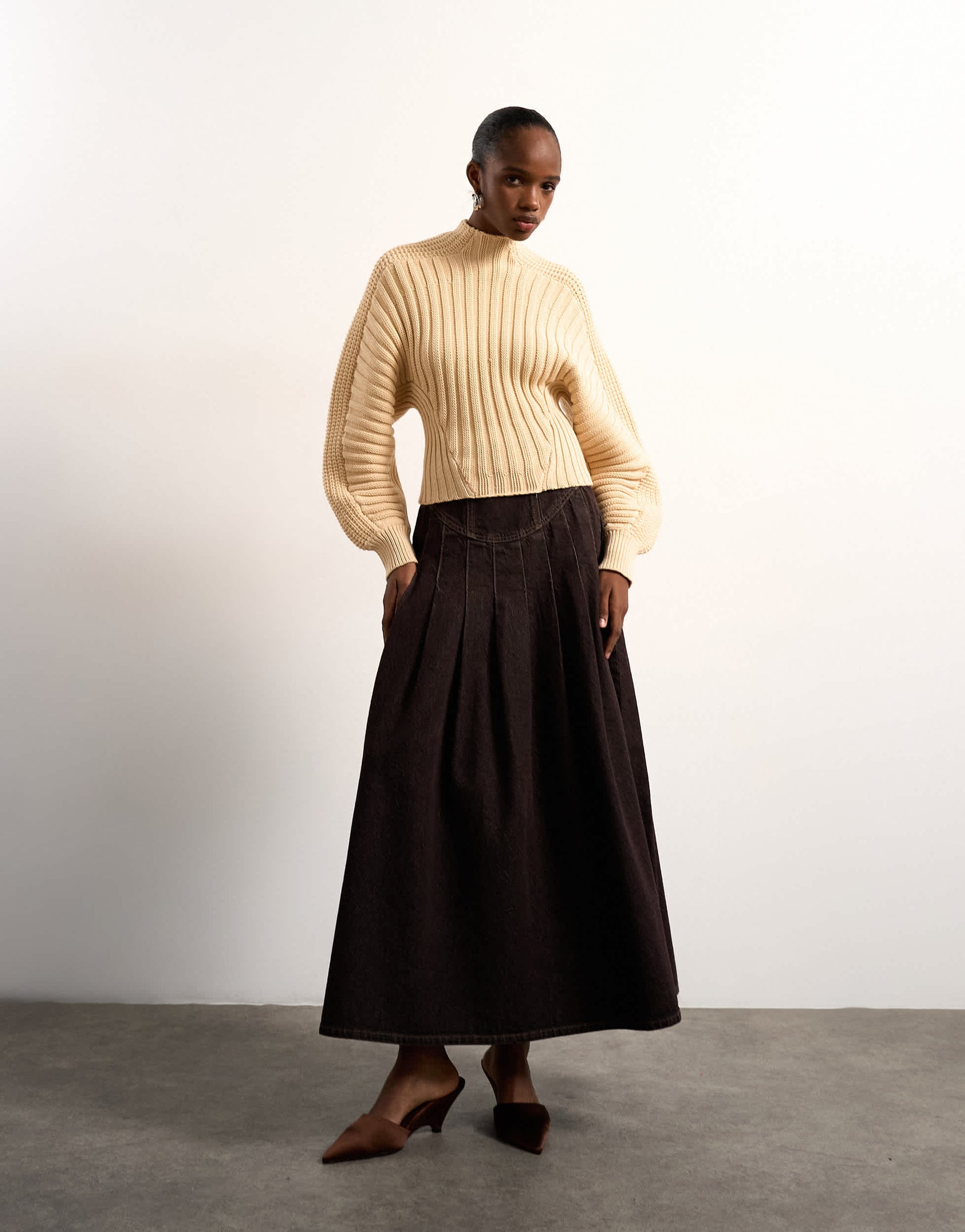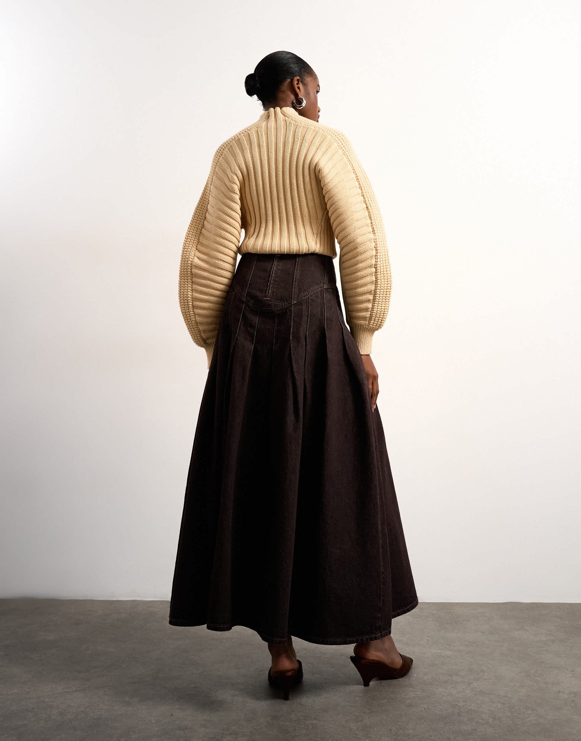 Dieser Rock ist aus nicht dehnbarem Denim in brauner Waschung gefertigt. Er hat einen hohen Bund, einen Reißverschluss, Falten und ist bodenlang geschnitten.
