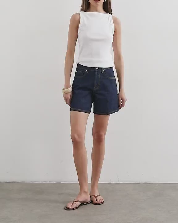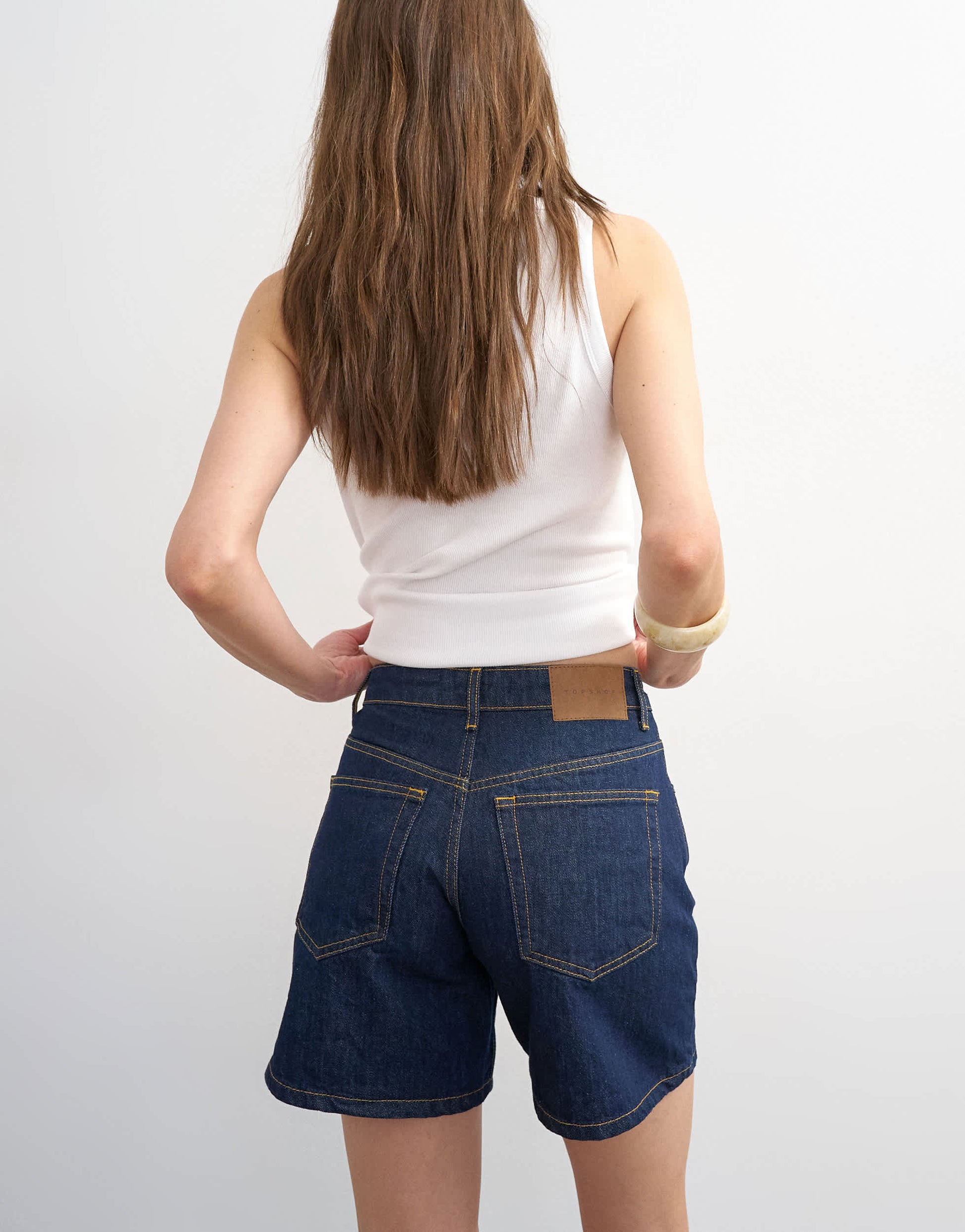 Shorts von TopshopDiese Shorts sind aus nicht dehnbarem Denim in Dunkelblau gefertigt. Sie haben einen hohen Bund, Gürtelschlaufen, praktische Taschen und einen Markenaufnäher auf der Rückseite. Die Passform ist regulär.