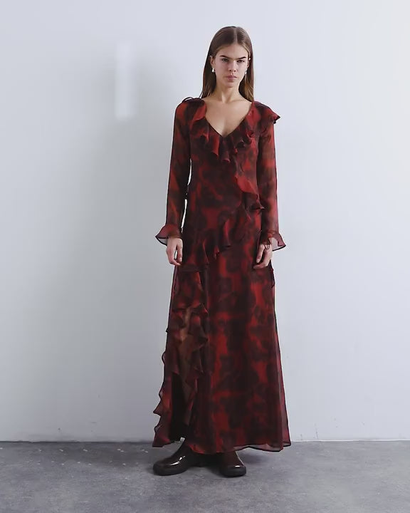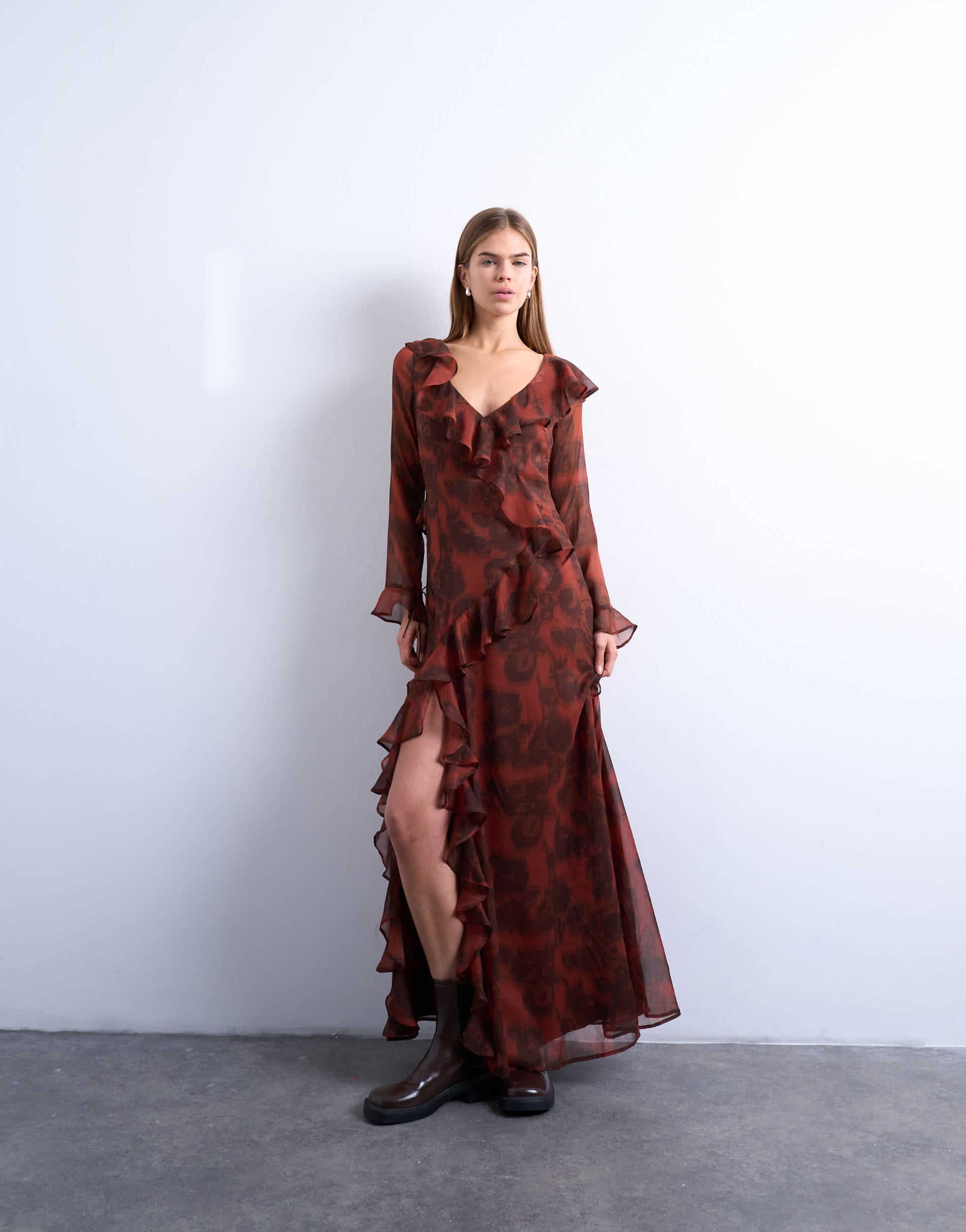 Kleider von TopshopDieses Kleid aus hauchzartem Chiffon mit Blumenmuster besticht durch einen V-Ausschnitt, lange Ärmel und üppige Rüschen. Abgerundet wird das Design durch einen Bindegürtel im Rücken, einen hohen Beinschlitz und eine reguläre Passform.