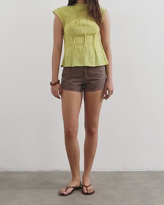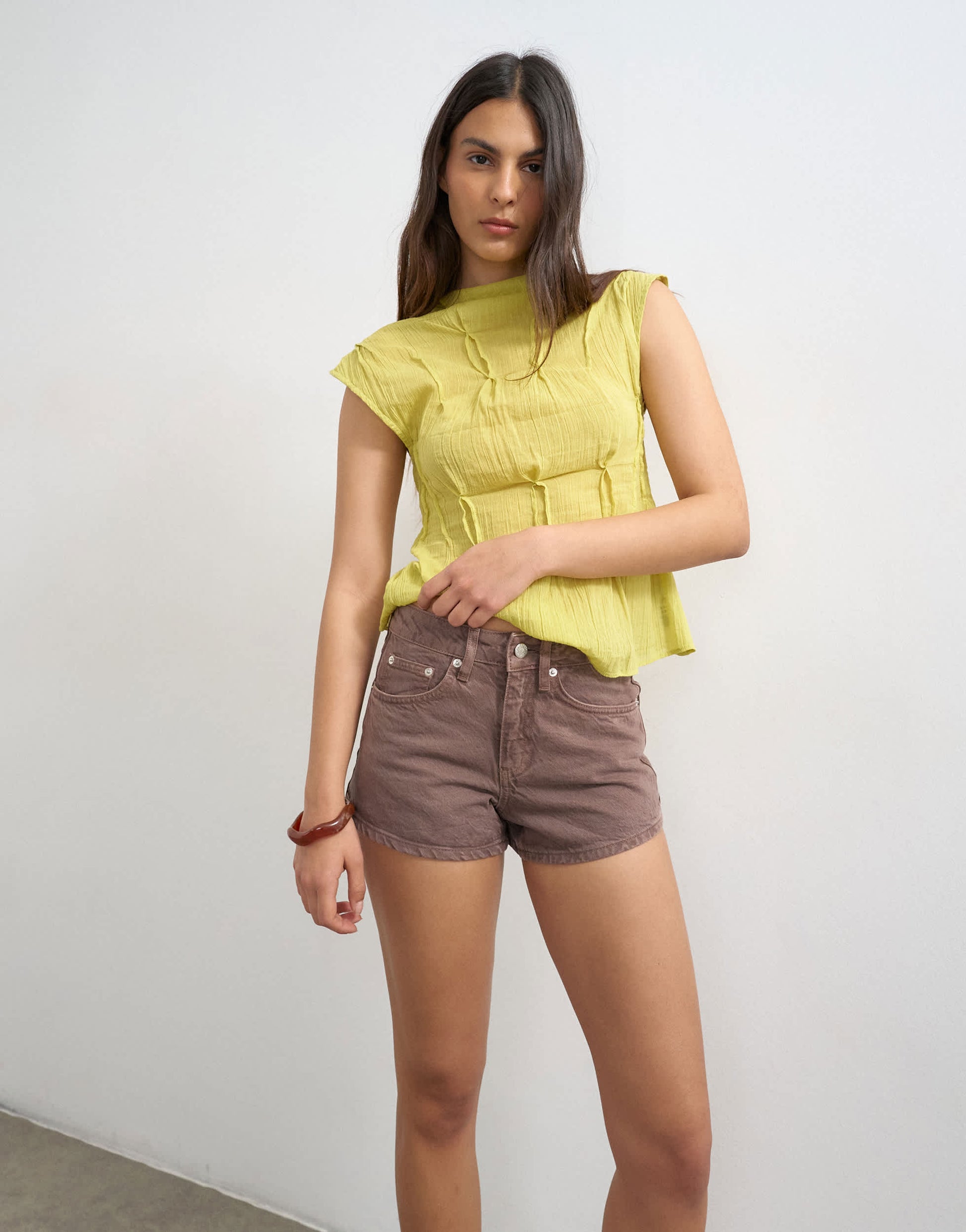 Shorts von TopshopDiese Shorts sind aus einem nicht dehnbaren Denim in brauner Waschung gefertigt. Sie verfügen über eine hohe Taille, Gürtelschlaufen, fünf funktionelle Taschen und eine normale Passform.