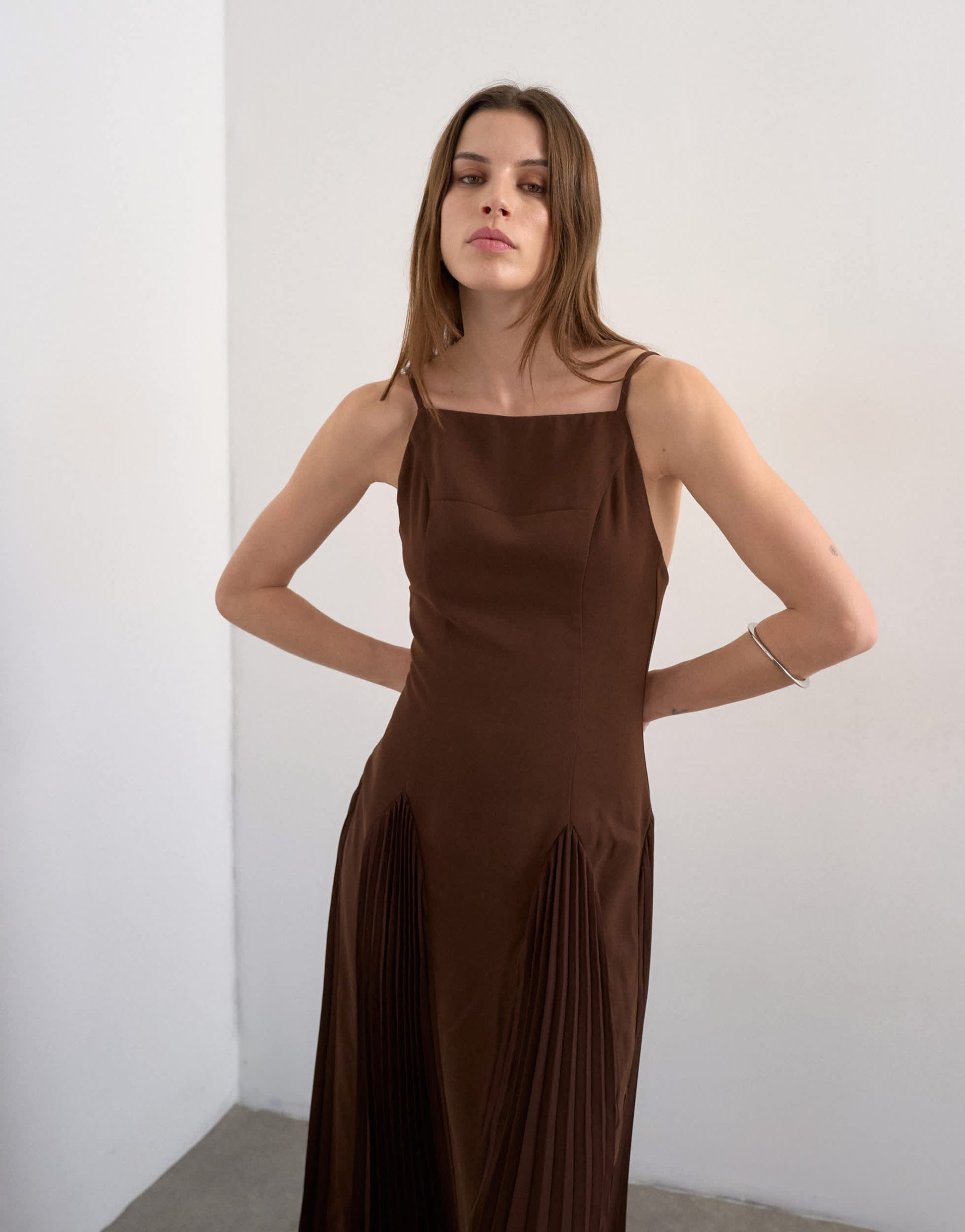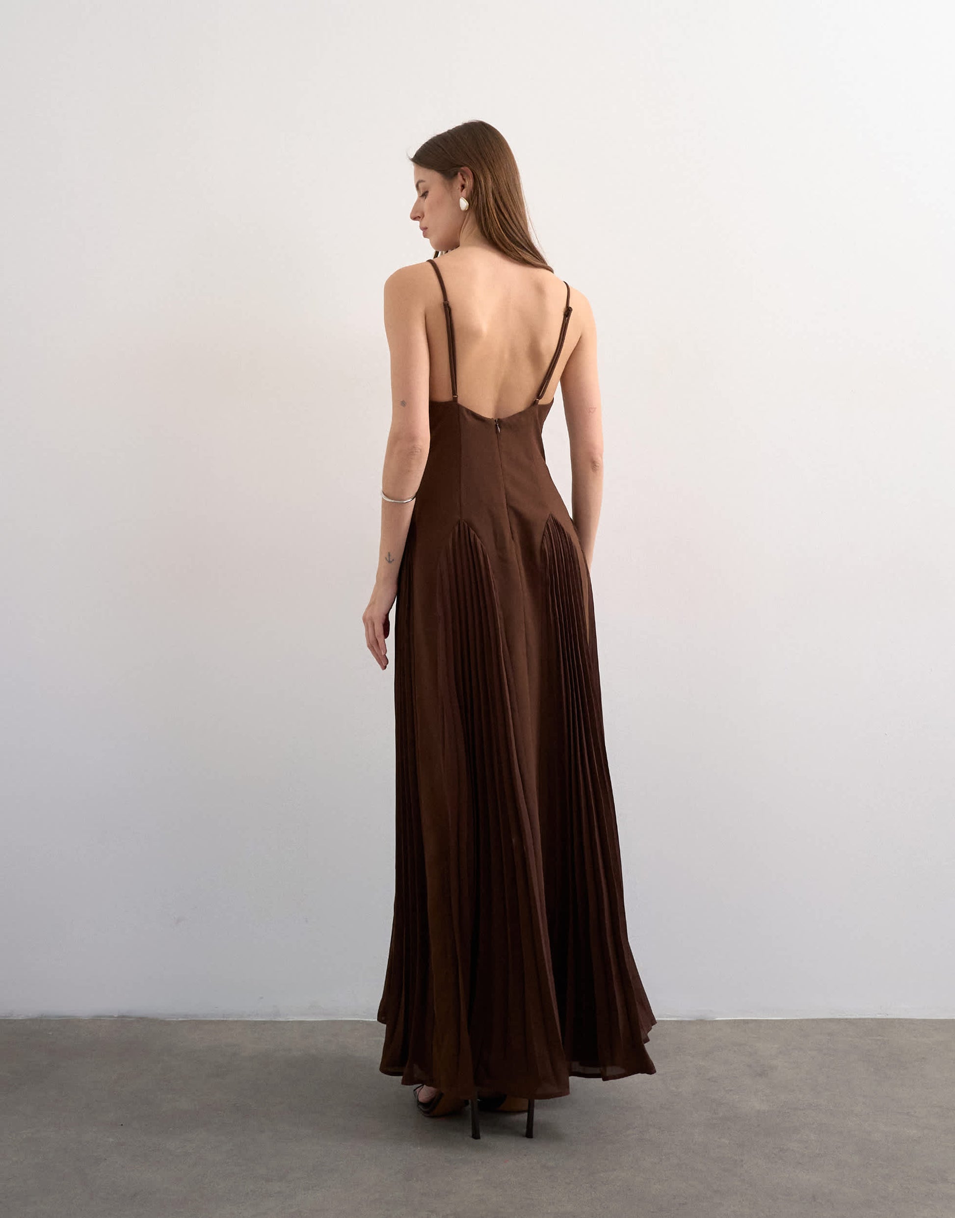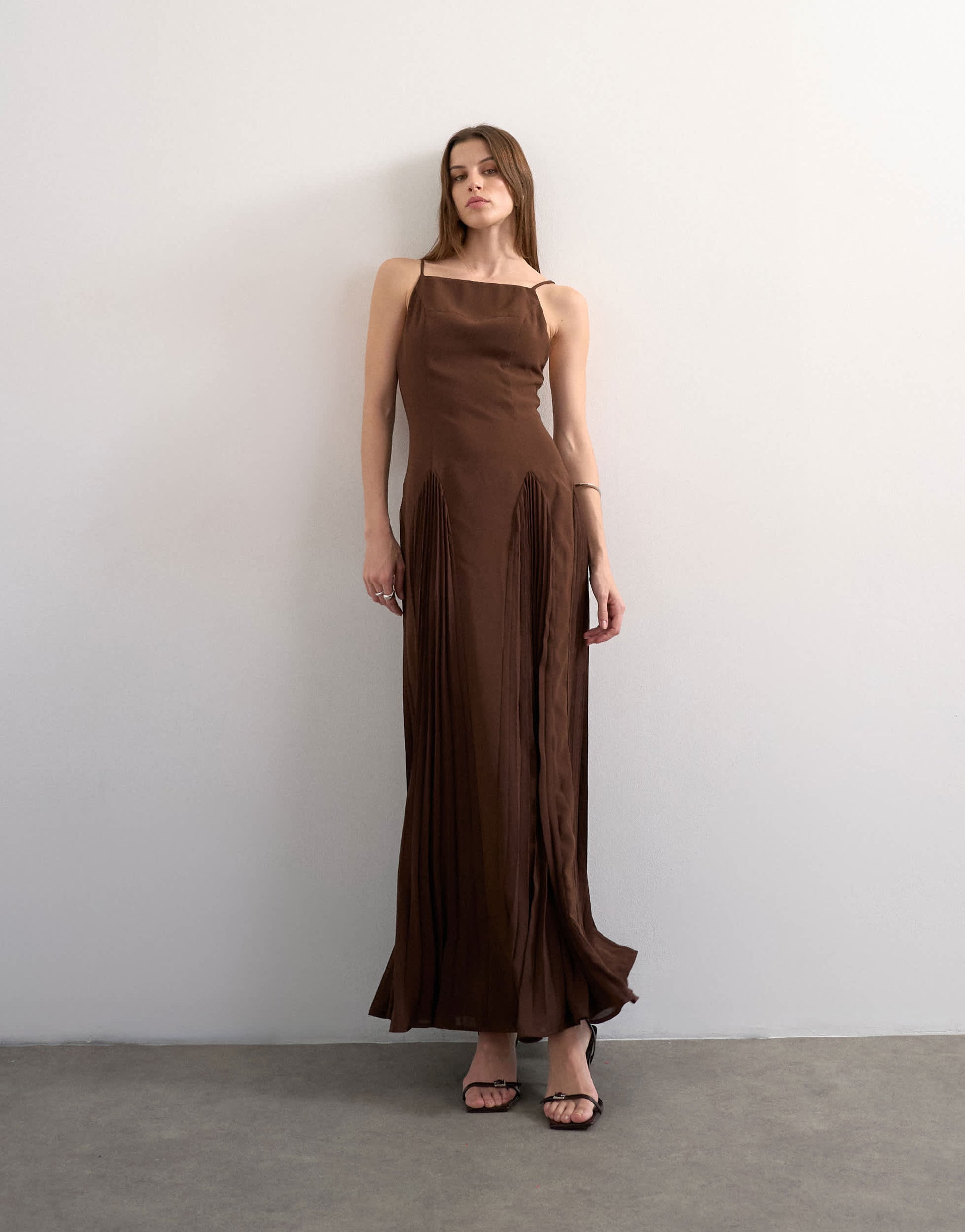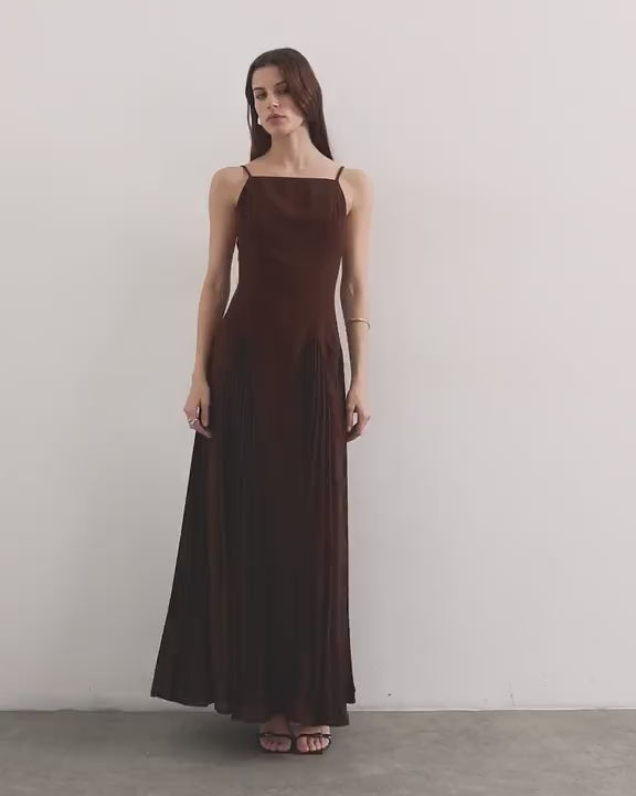 Dieses Kleid aus leichtem, braunem Chiffon hat einen eckigen Ausschnitt, verstellbare Träger und wird hinten mit einem Reißverschluss geschlossen. Die plissierten Godet-Details runden das Design ab. Das Kleid hat eine normale Passform.