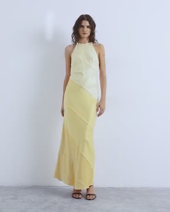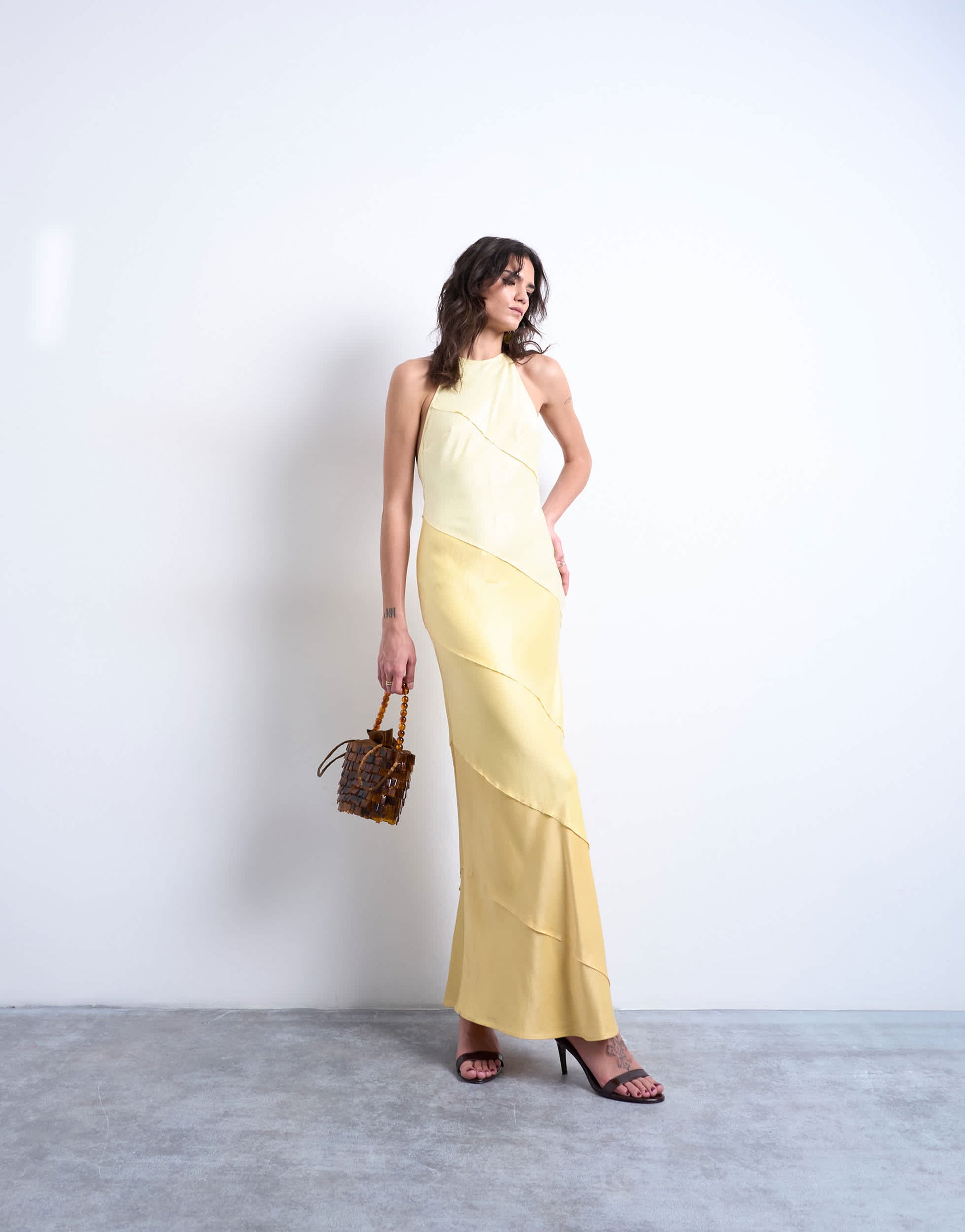 Kleider von TopshopDieses Kleid ist aus glänzendem, satinartigem Stoff in verschiedenen Gelbtönen gefertigt. Es hat einen Neckholder-Ausschnitt, einen offenen Rücken, einen Bindegürtel und eine schmeichelhafte, bodenlange Silhouette.