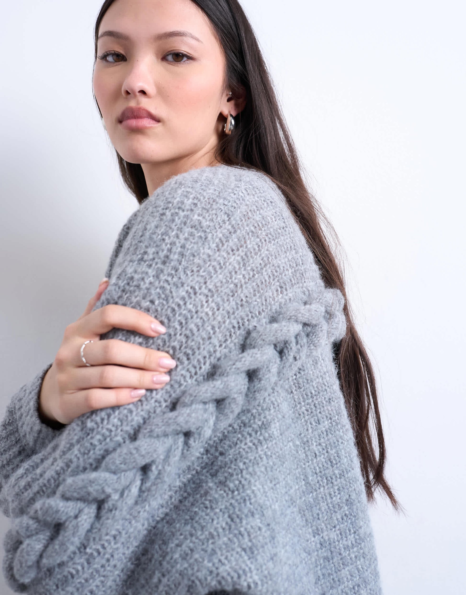 Pullover und Strickjacken von TopshopDiese kuschelige Strickjacke aus grob gestricktem, grauem Material ist die perfekte Ergänzung für Ihre Wintergarderobe. Sie besticht durch einen V-Ausschnitt, eine Knopfleiste und Zöpfe an den Ärmeln.