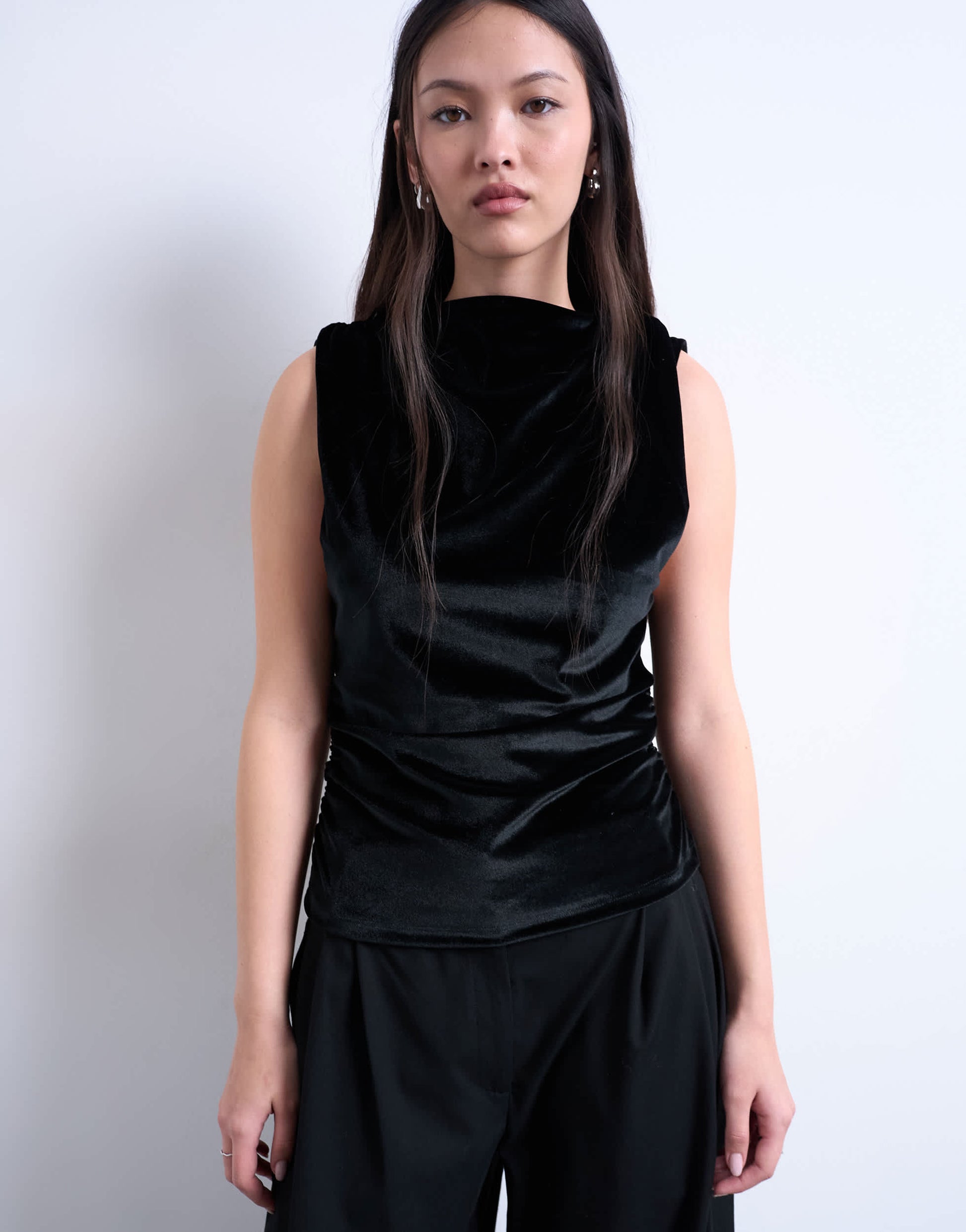 Oberteile von TopshopDieses Top ist aus weichem Samt gefertigt. Das ärmellose Modell hat einen hohen Kragen, Raffungen und eine normale Passform.