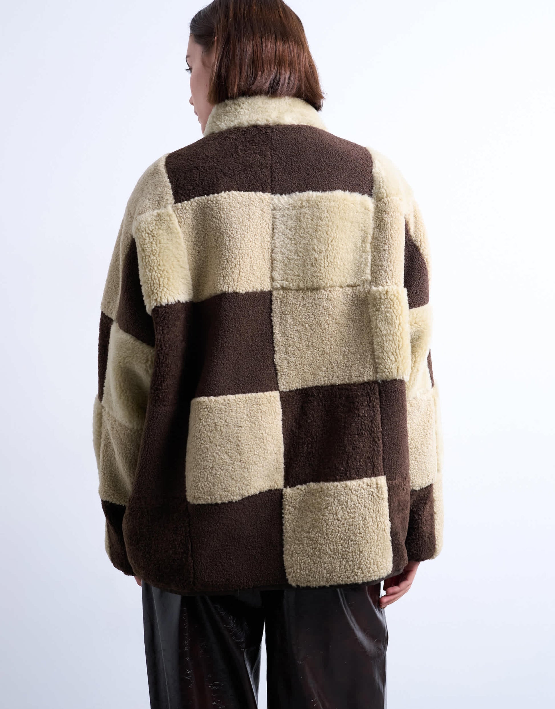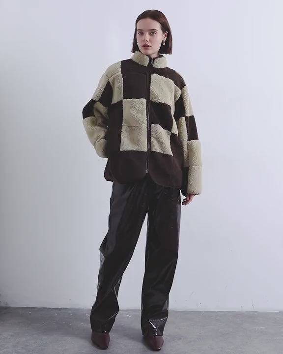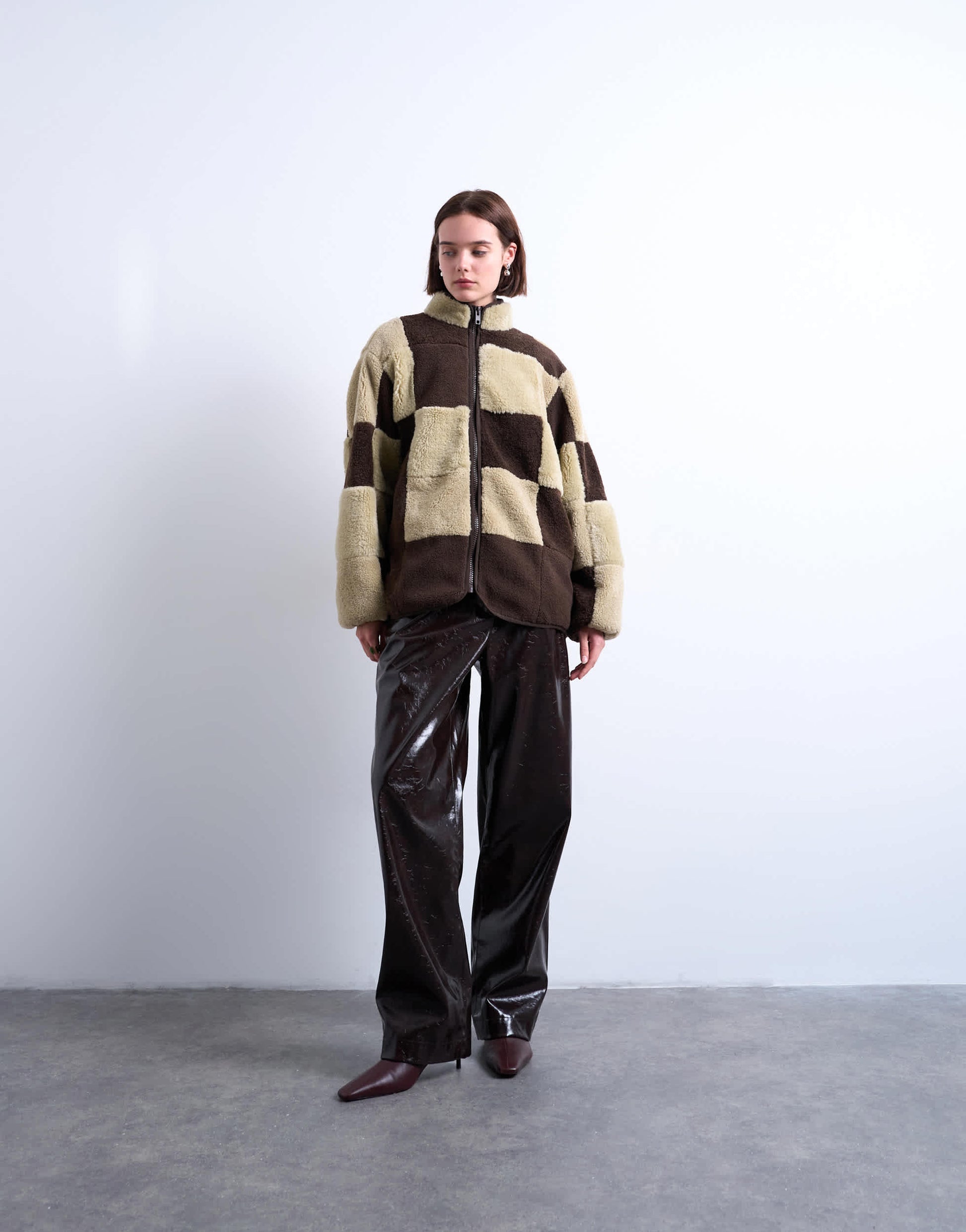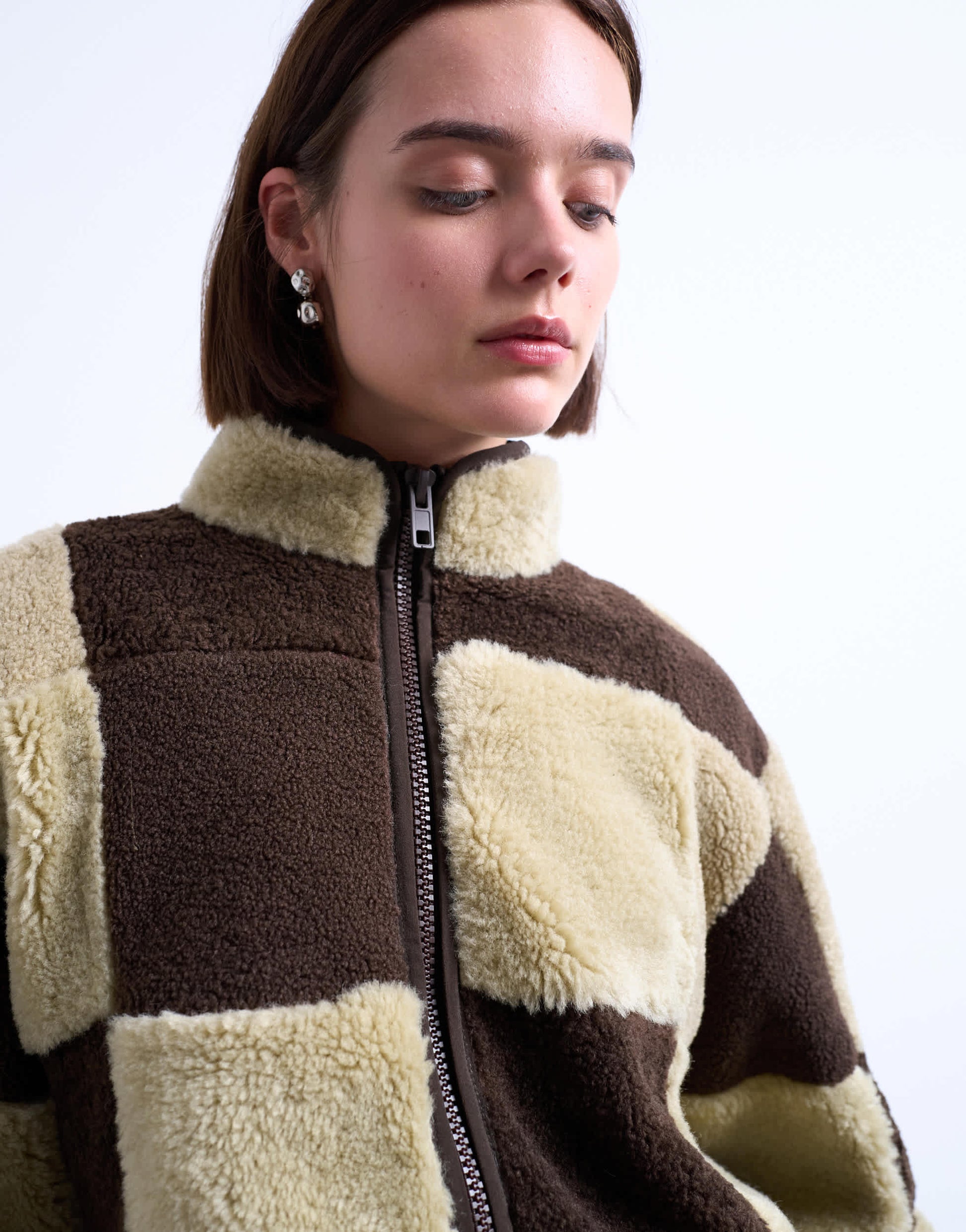 Mäntel und Jacken von TopshopDieser kuschelige Borg-Fleecepullover hat ein neutrales Patchwork-Design. Er verfügt über einen hohen Kragen, einen Reißverschluss und zwei Taschen und ist locker geschnitten.