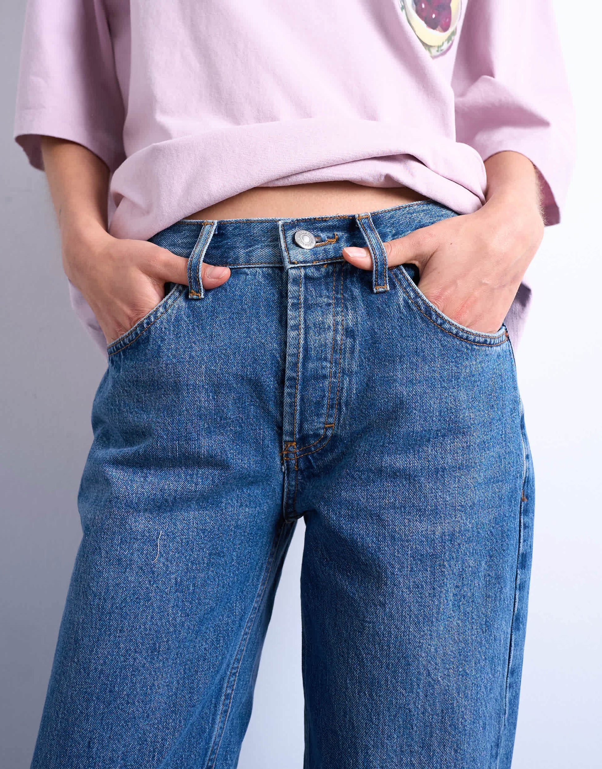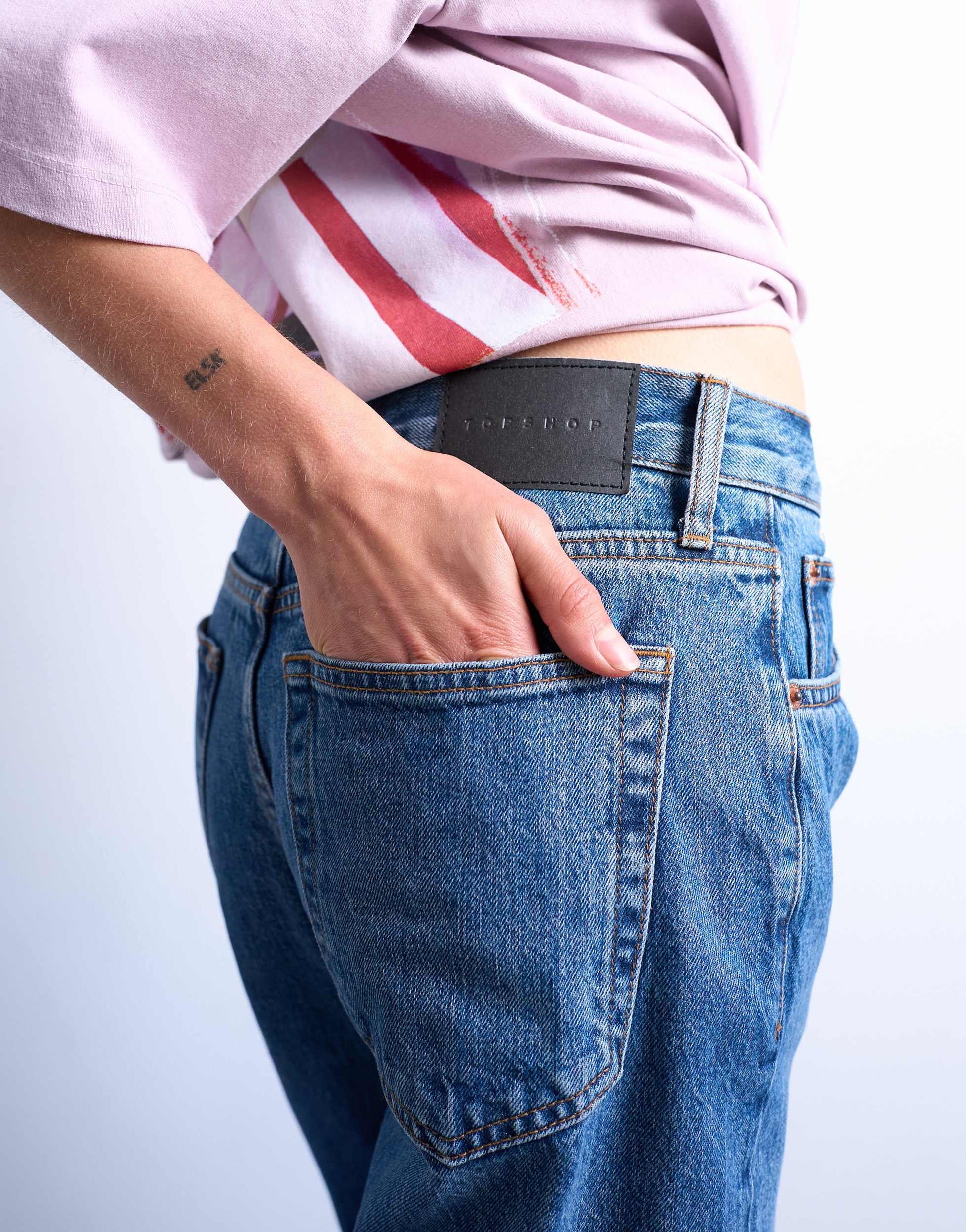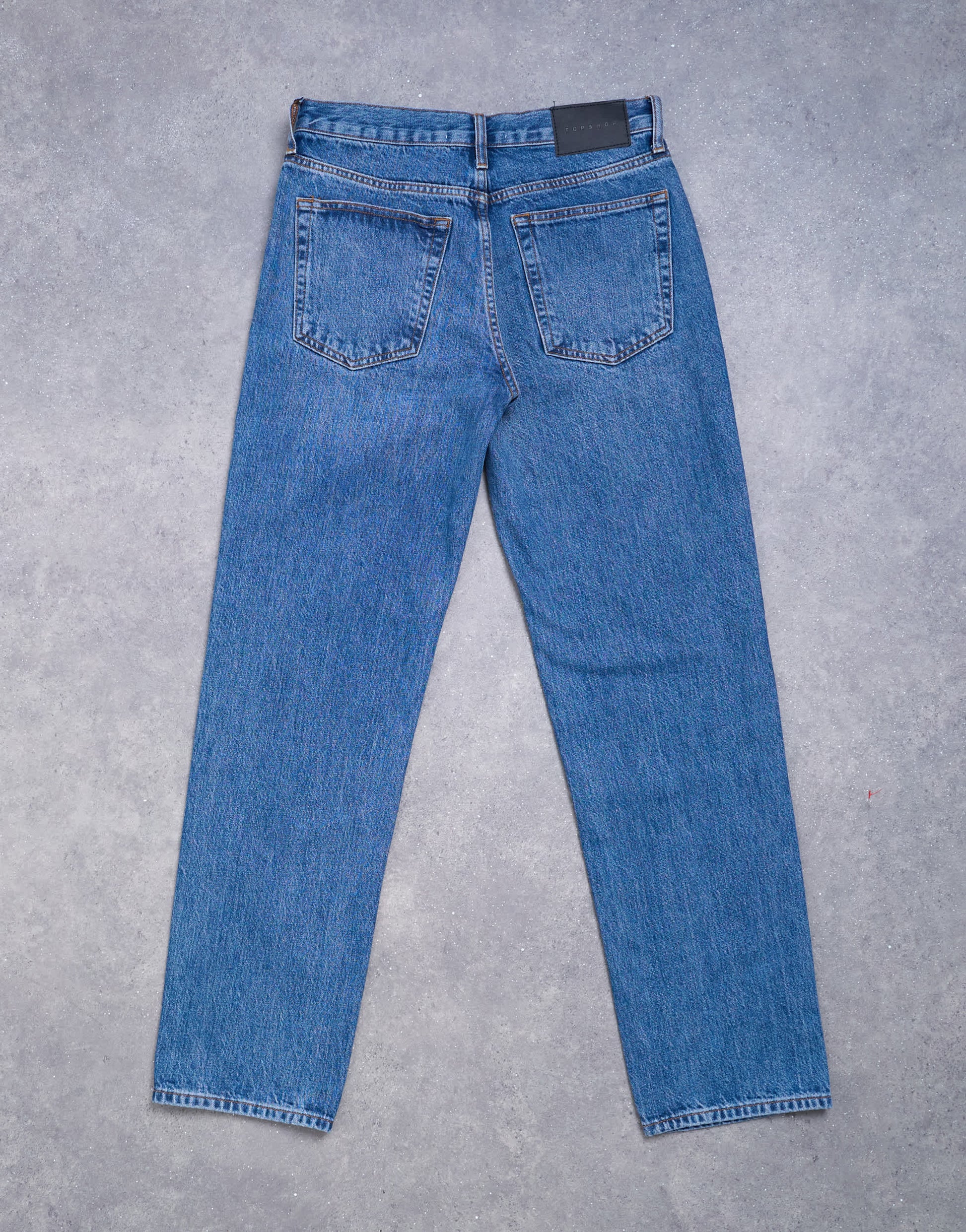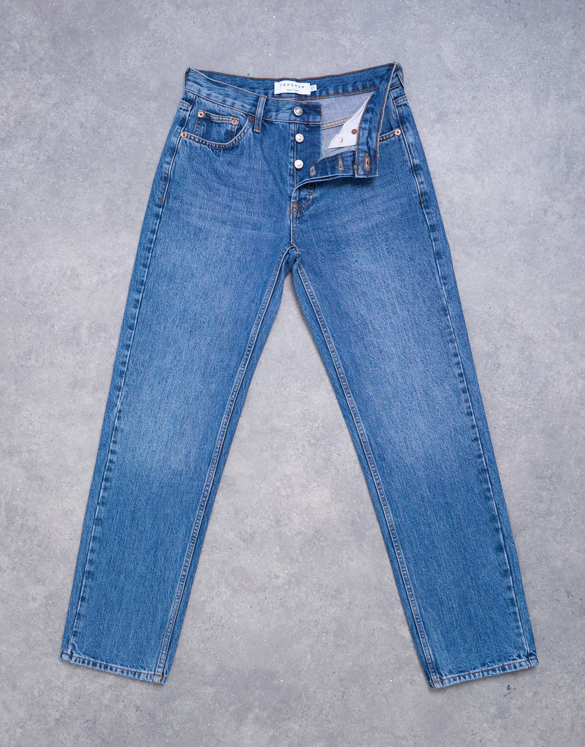 Jeans von TopshopDiese Runway-Jeans haben einen mittelhohen Bund und ein gerades Bein. Sie verfügen über Gürtelschlaufen, fünf funktionale Taschen und einen Markenaufnäher auf der Rückseite und sind aus nicht dehnbarem Denim in einer mittelblauen Waschung gefertigt.