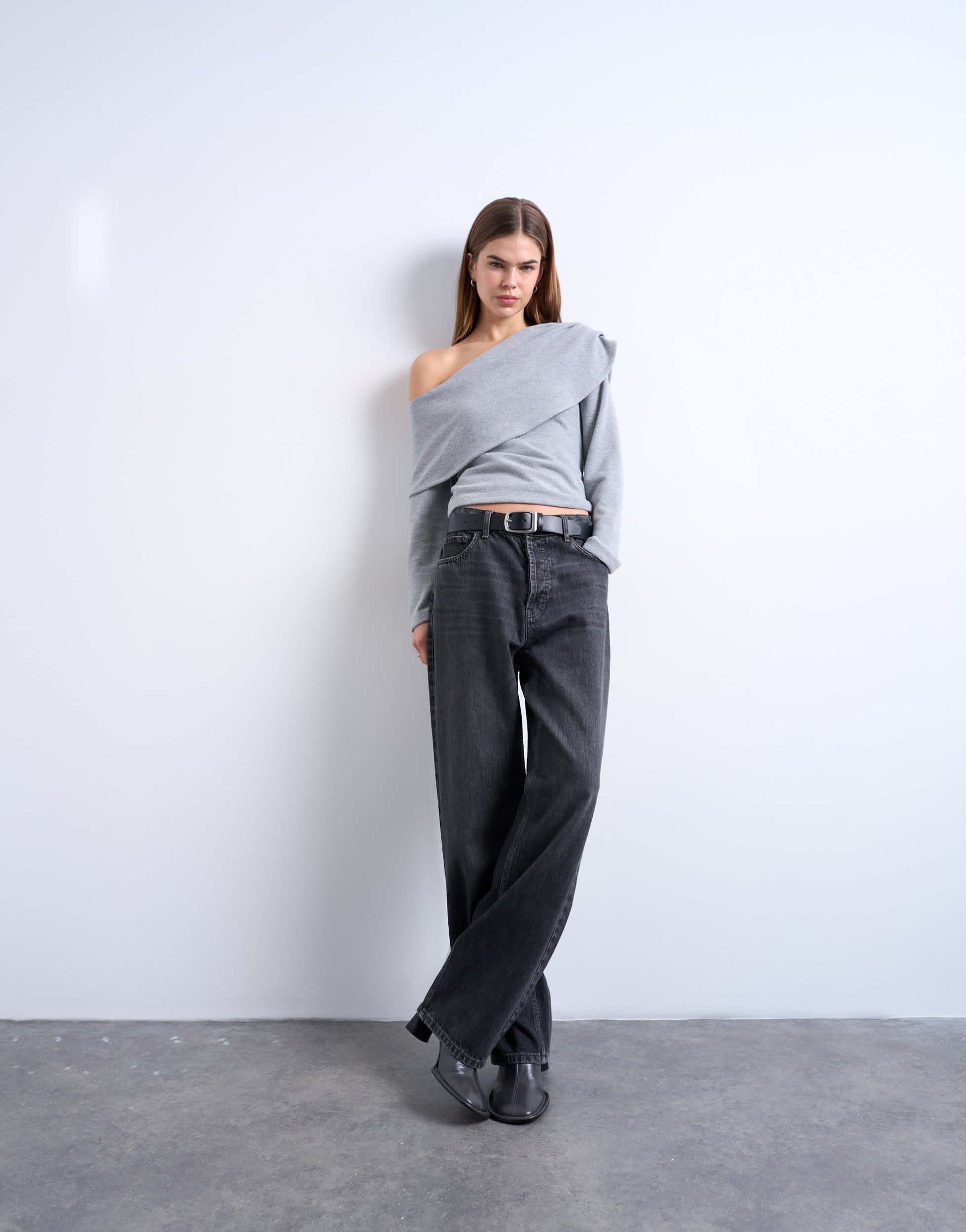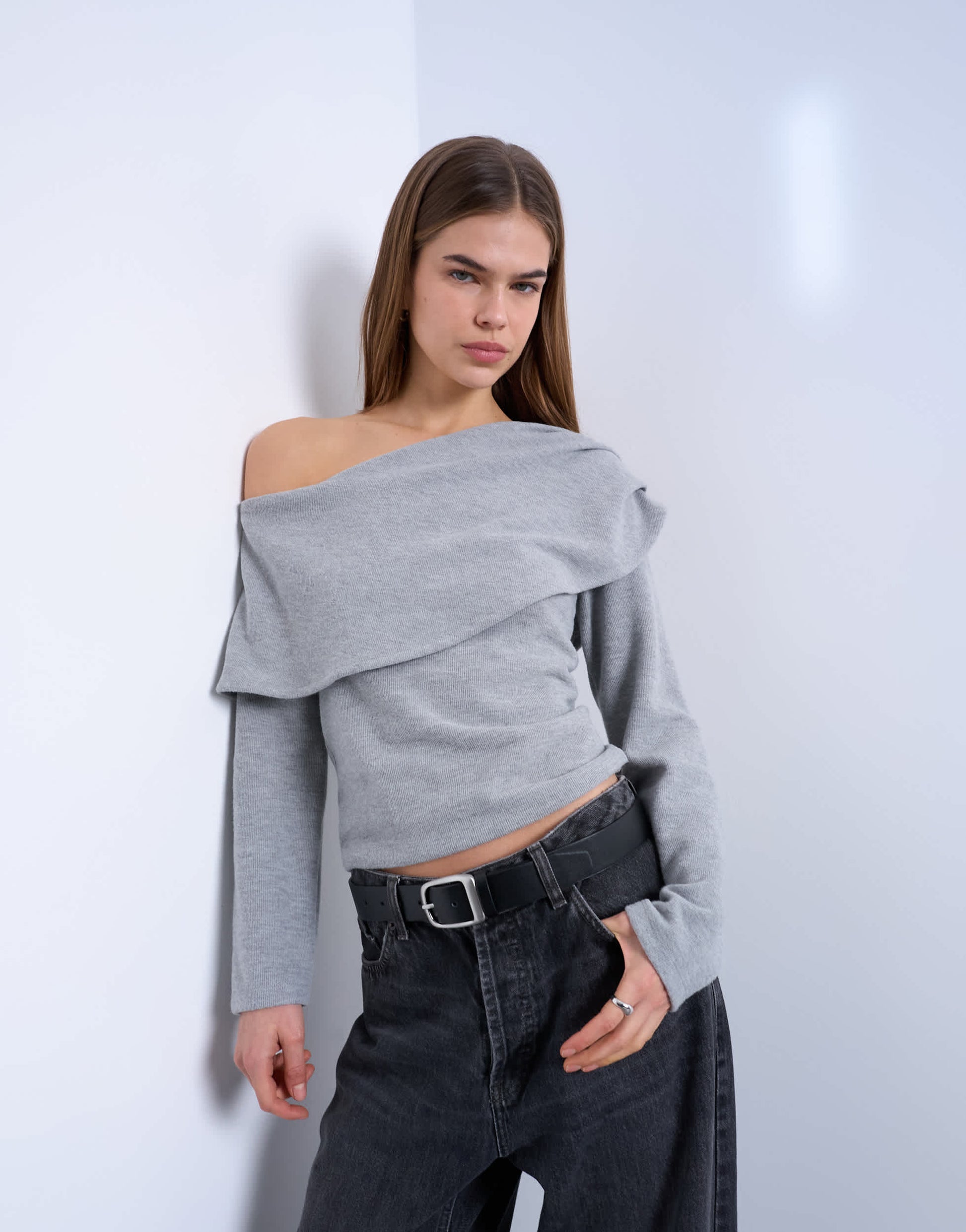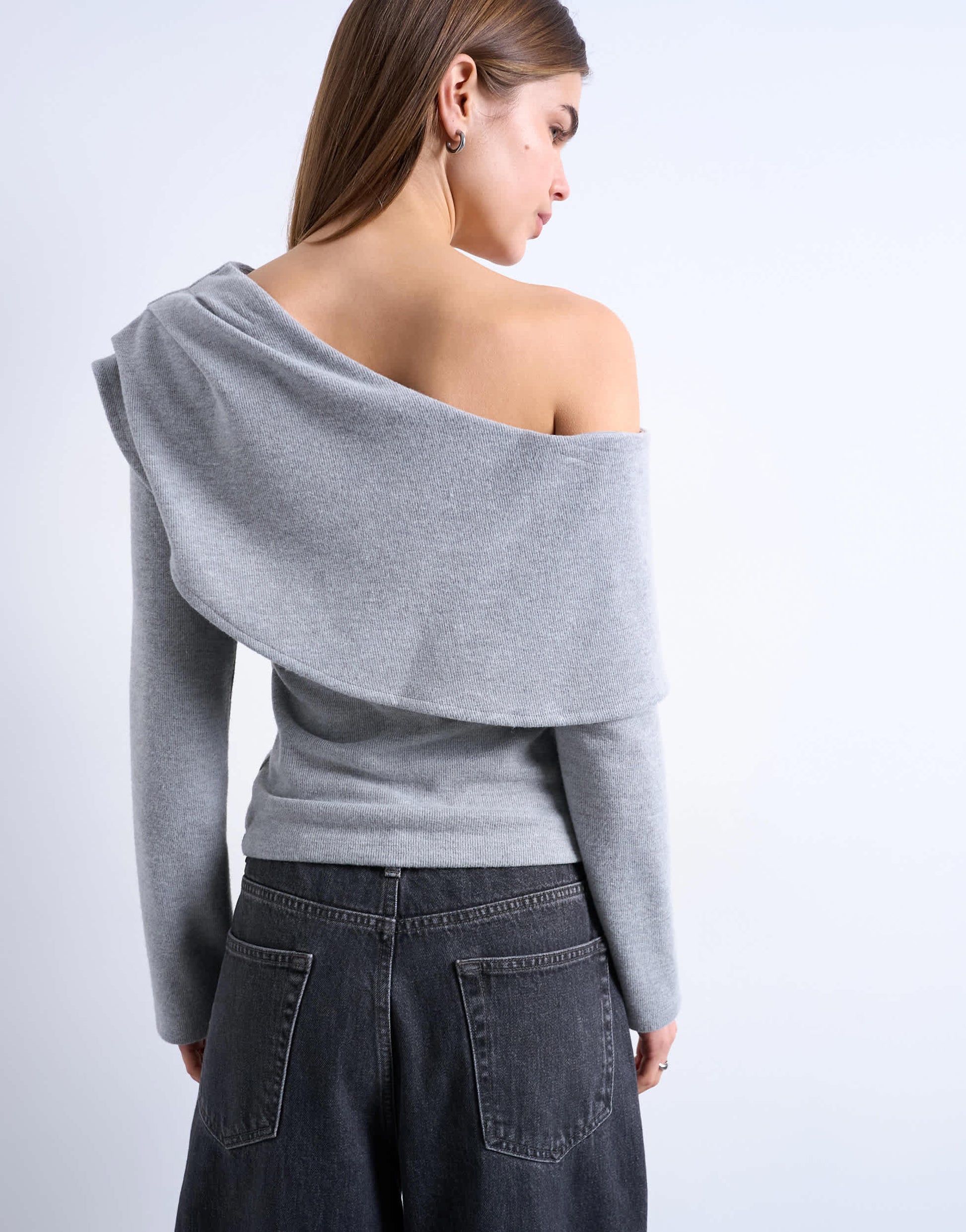 Oberteile von TopshopDieses Top ist aus geripptem Strick gefertigt und hat ein schlichtes Design. Der schulterfreie Schnitt zeichnet sich durch lange Ärmel, einen drapierten Ausschnitt und eine normale Passform aus.