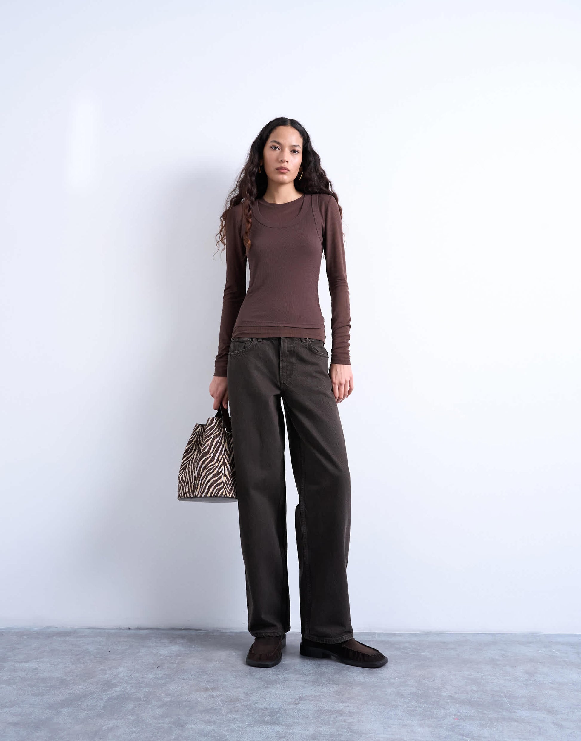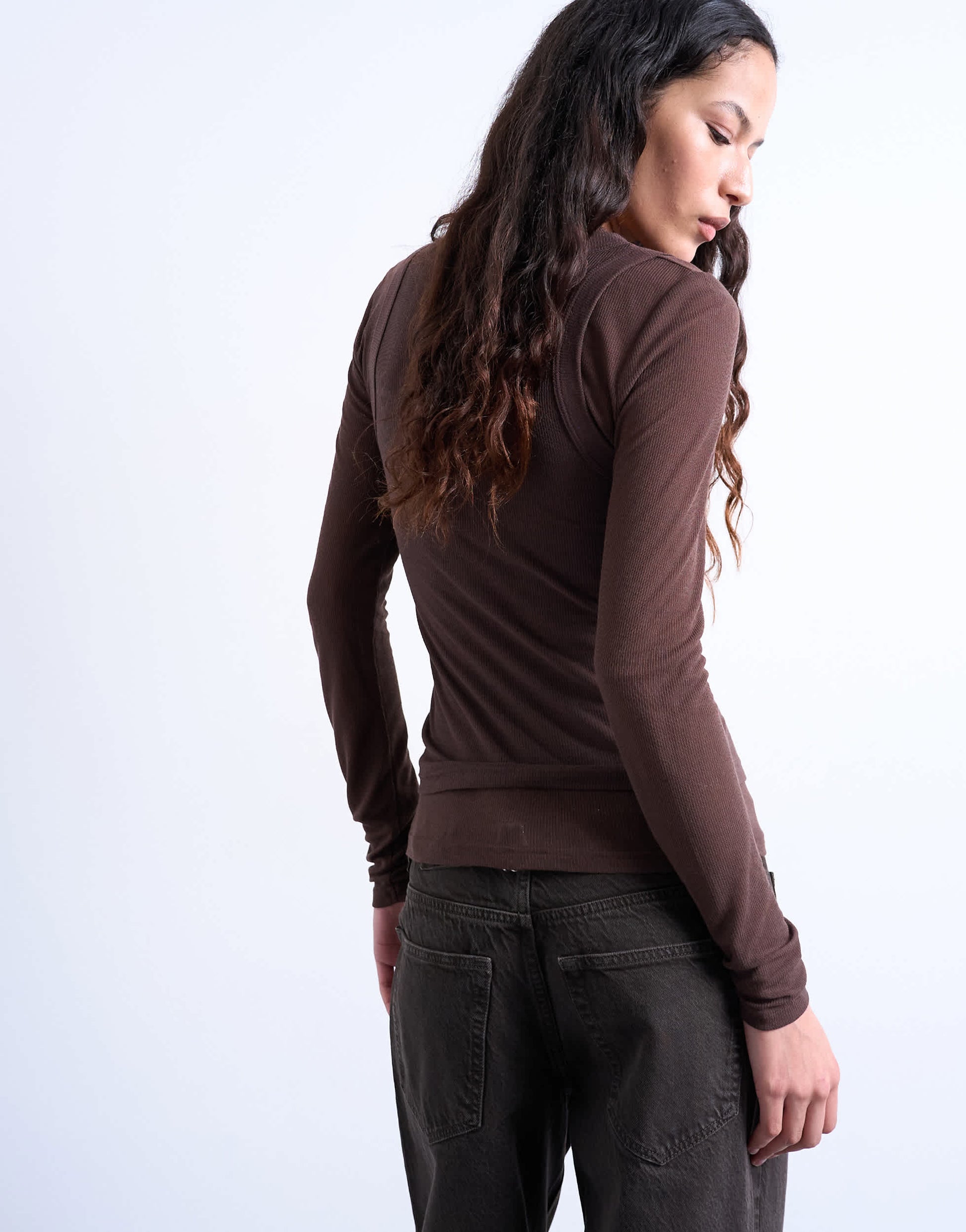Oberteile von TopshopDieses Top aus geripptem Jersey in einem schokoladenbraunen Farbton besticht durch sein Lagen-Design: Ein ärmelloses Top über einem Langarmshirt sorgt für einen einzigartigen Look. Es hat einen Rundhalsausschnitt und ist figurbetont geschnitten.