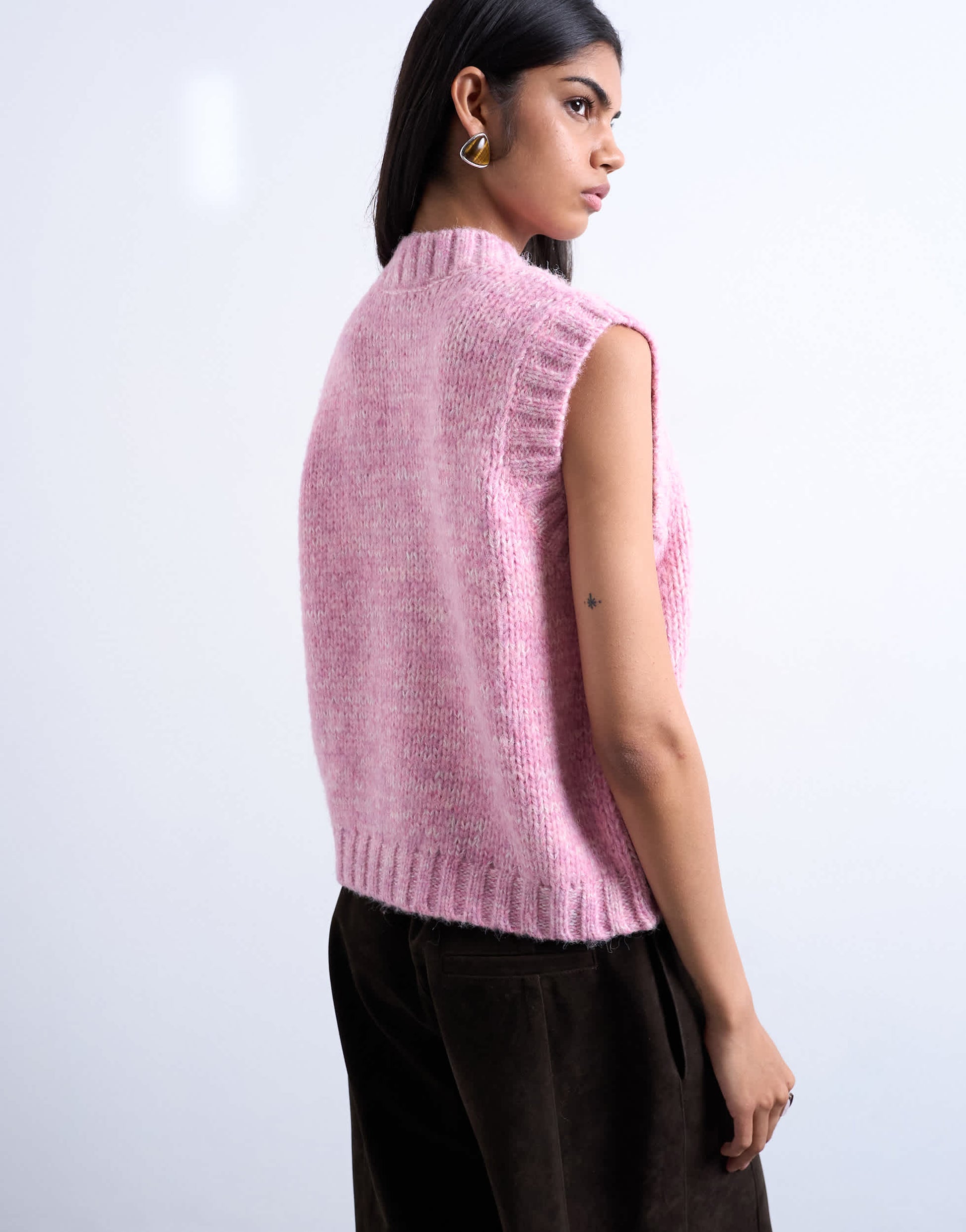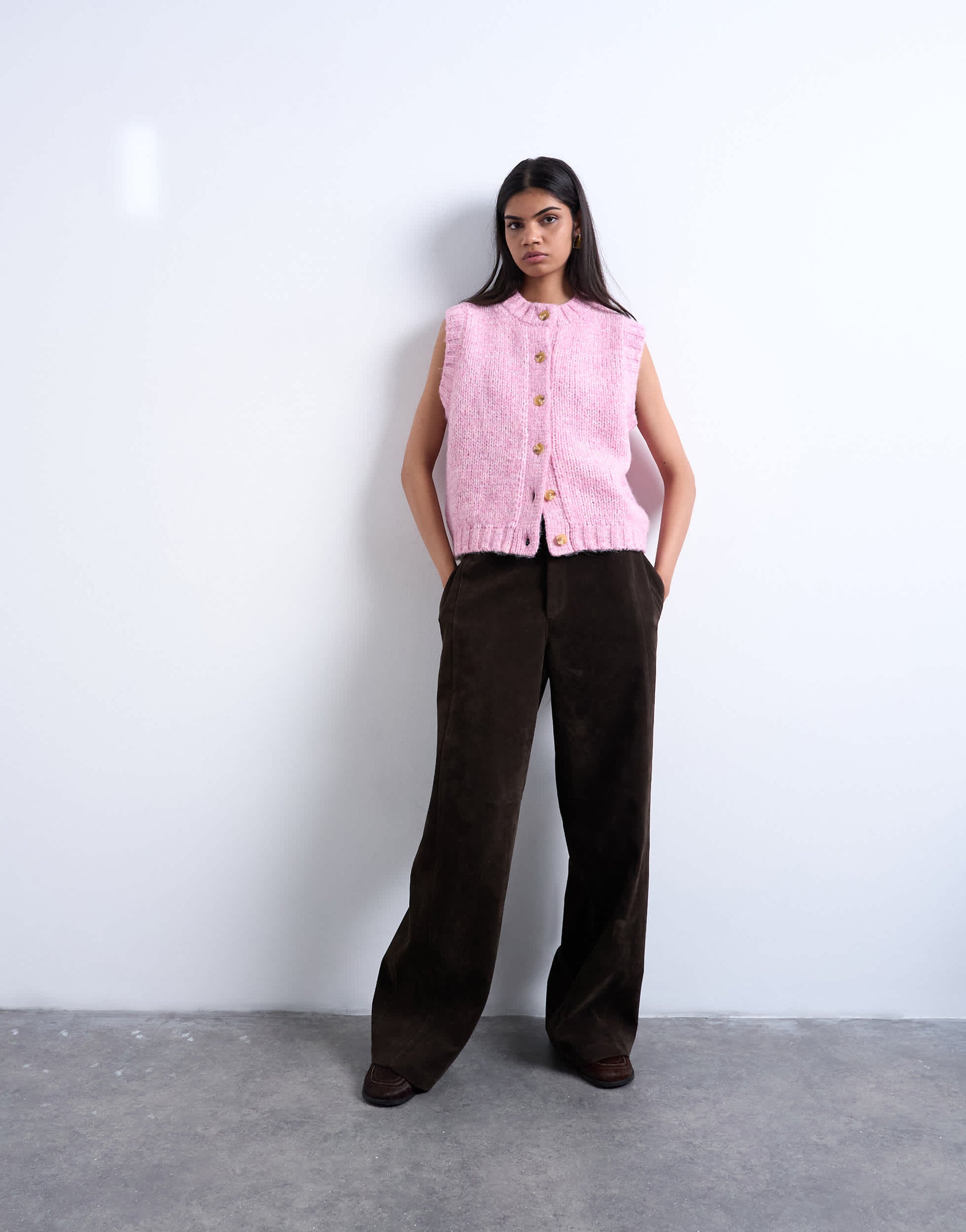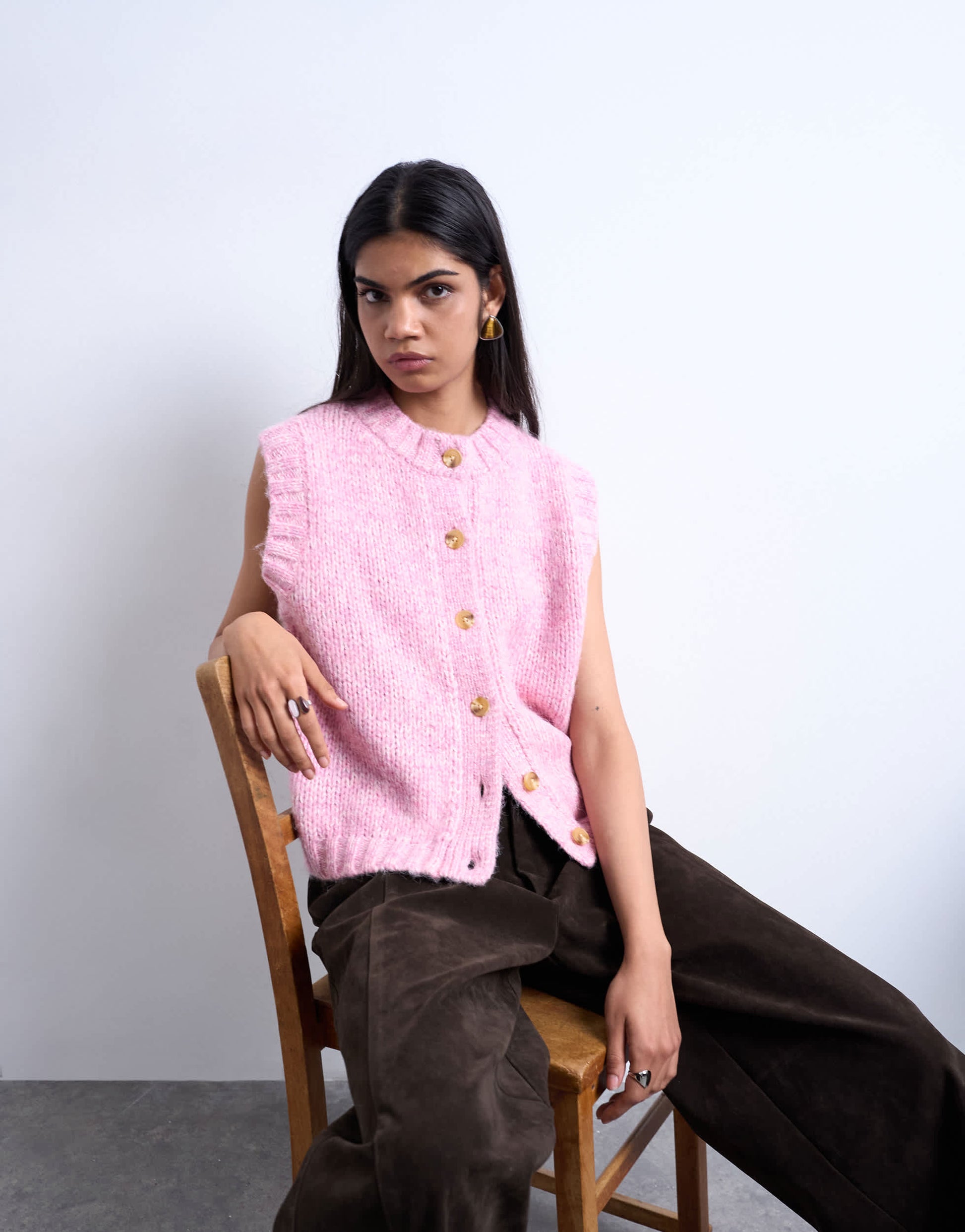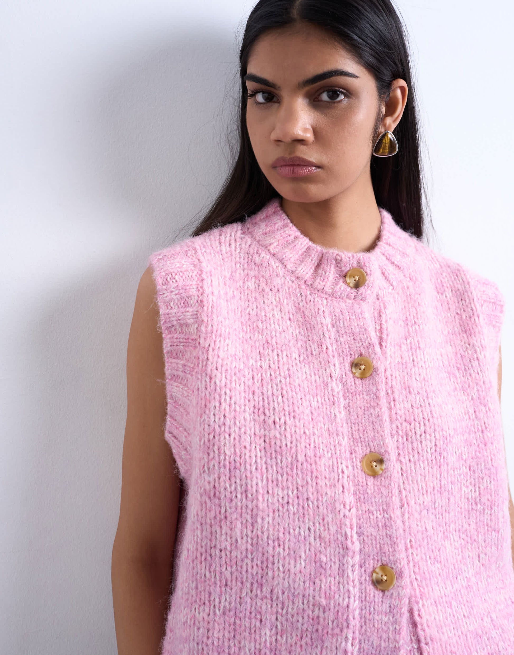 Oberteile von TopshopDiese Strickjacke ist aus weichem, flauschigem Strick gefertigt. Das ärmellose Modell hat einen Rundhalsausschnitt, eine Knopfleiste und eine normale Passform.
