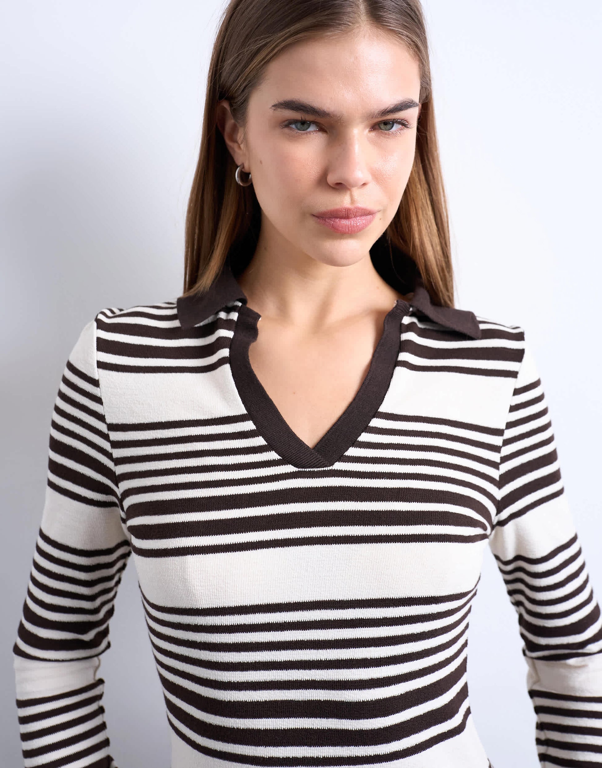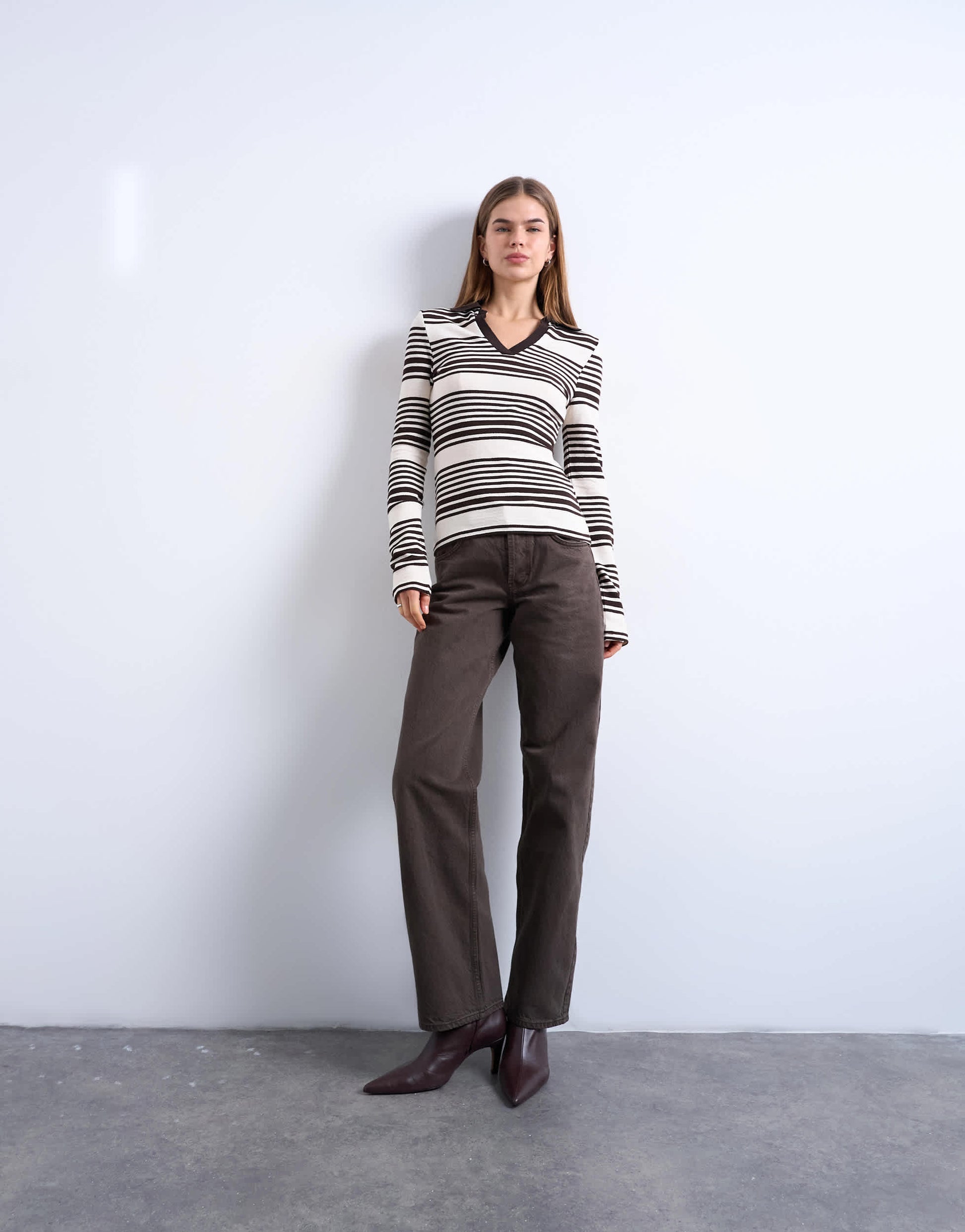 Topshop gestreiftes Polo-Langarmshirt mit V-Ausschnitt in Schokoladenbraun und Ecru