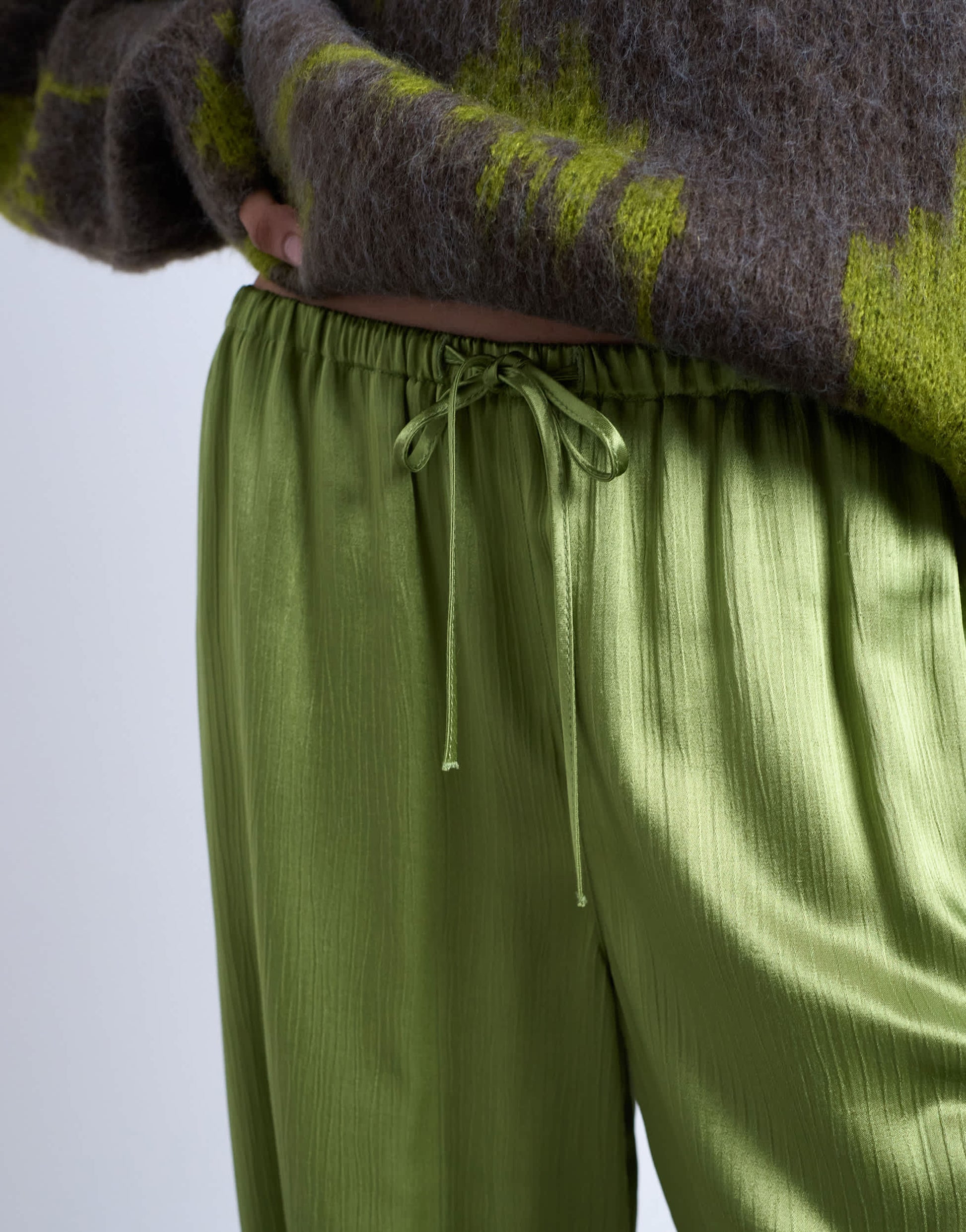 Hosen und Leggings von Topshop- Diese Hose ist aus einem glänzenden, satinartigen Stoff mit geknitterter Struktur gefertigt. Sie zeichnet sich durch einen hohen Bund, einen Kordelzug, Seitentaschen und ein weites Bein aus.
