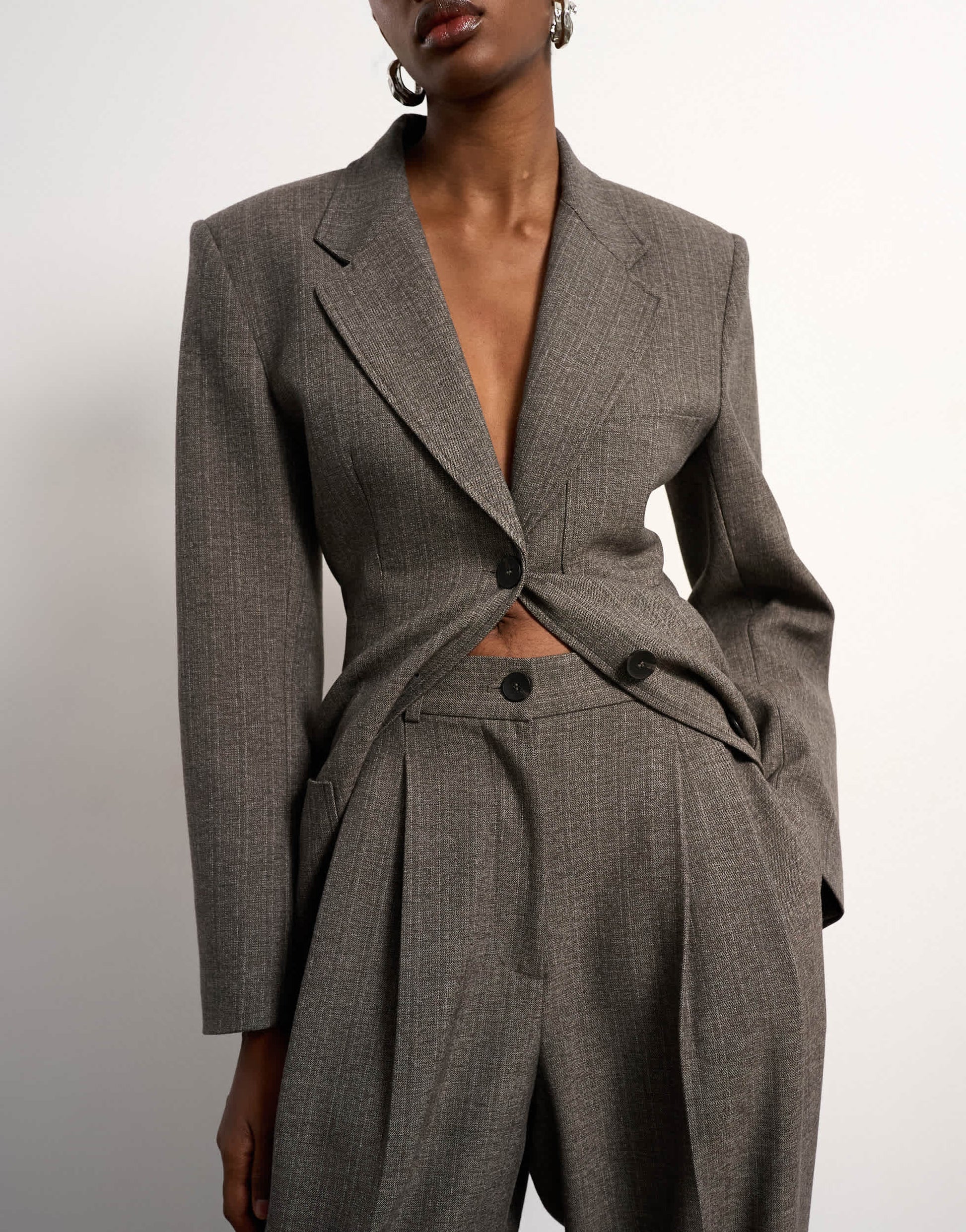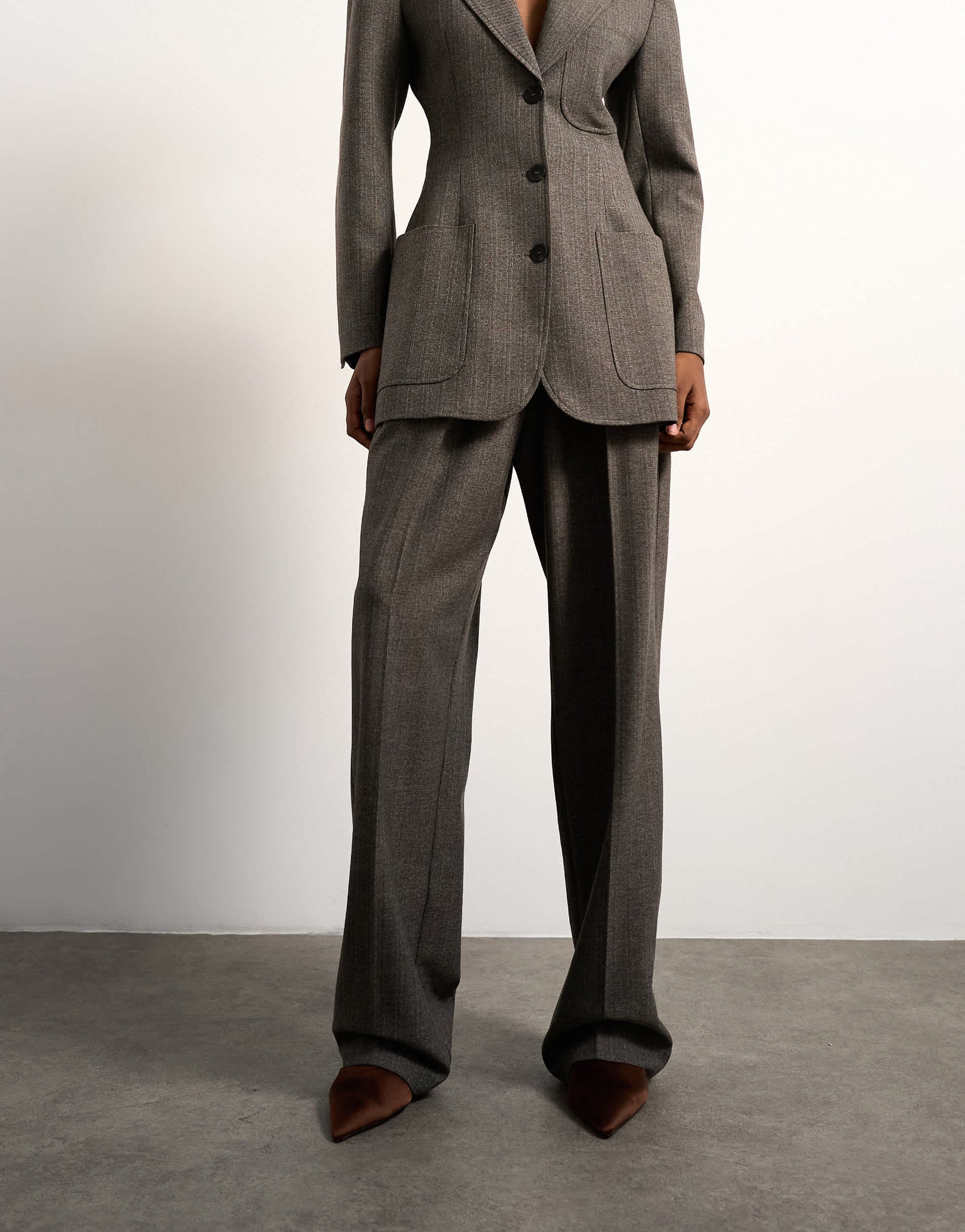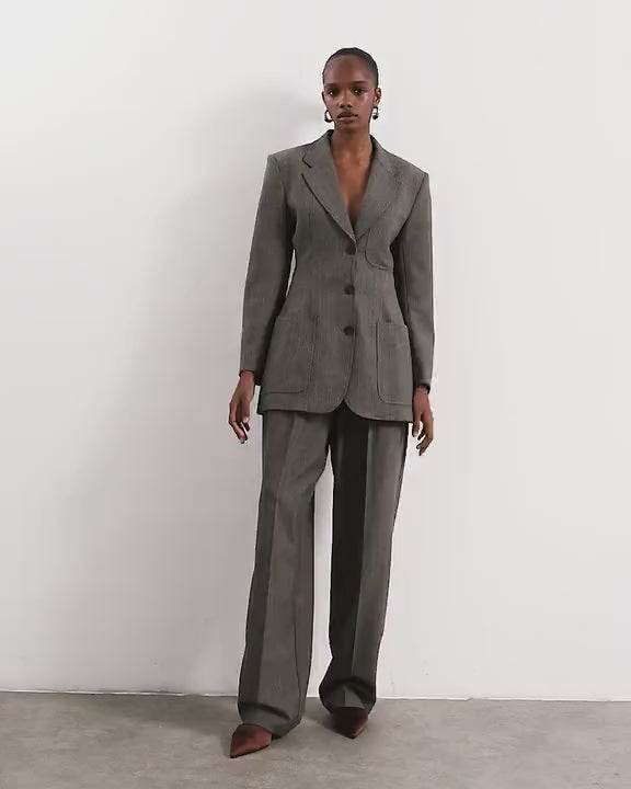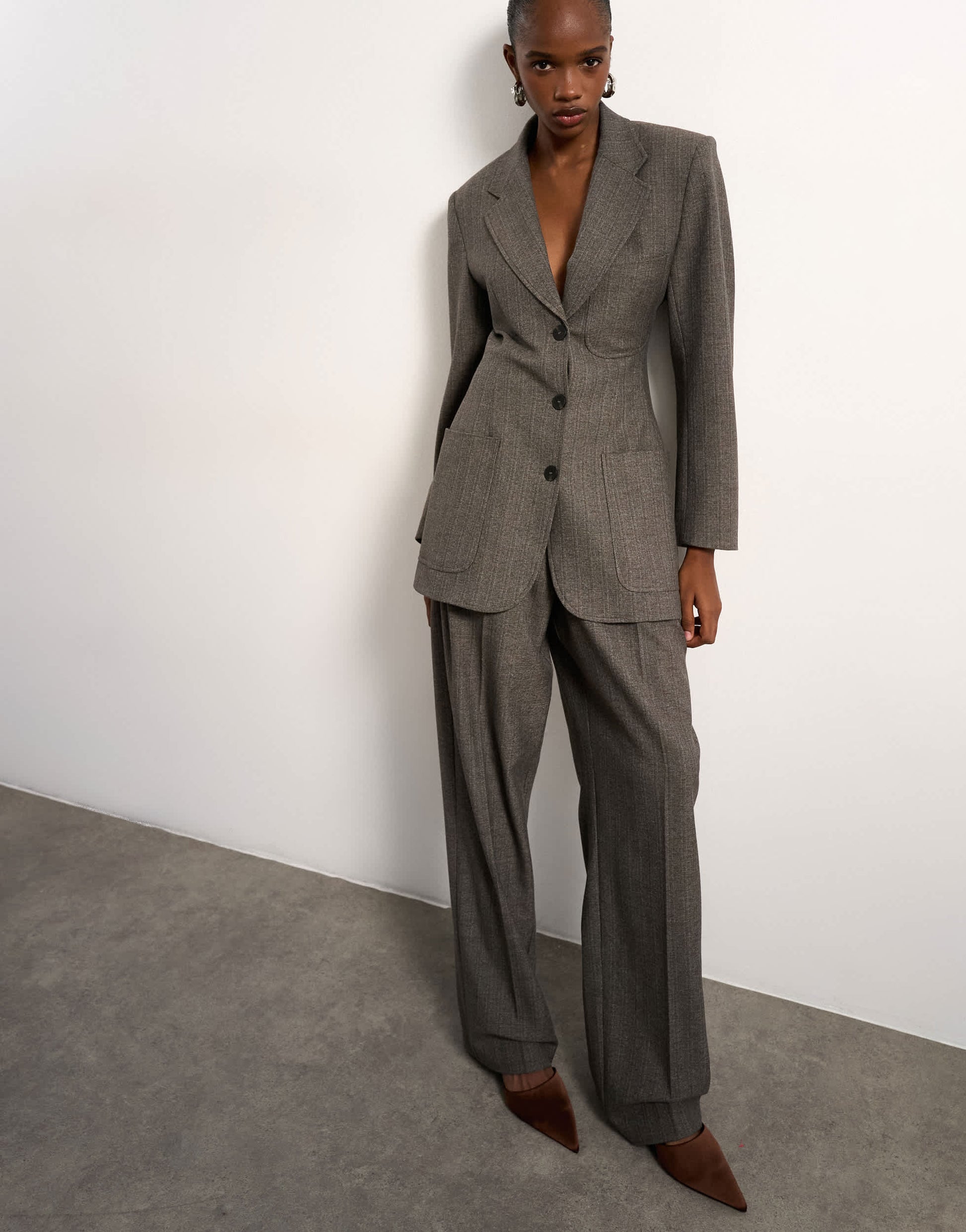 Diese Hose ist aus strukturiertem Webstoff in Taupe gefertigt. Sie hat einen mittelhohen Bund mit Gürtelschlaufen und praktischen Taschen. Abgerundet wird das Design durch Bundfalten und einen lässigen, weiten Beinschnitt.