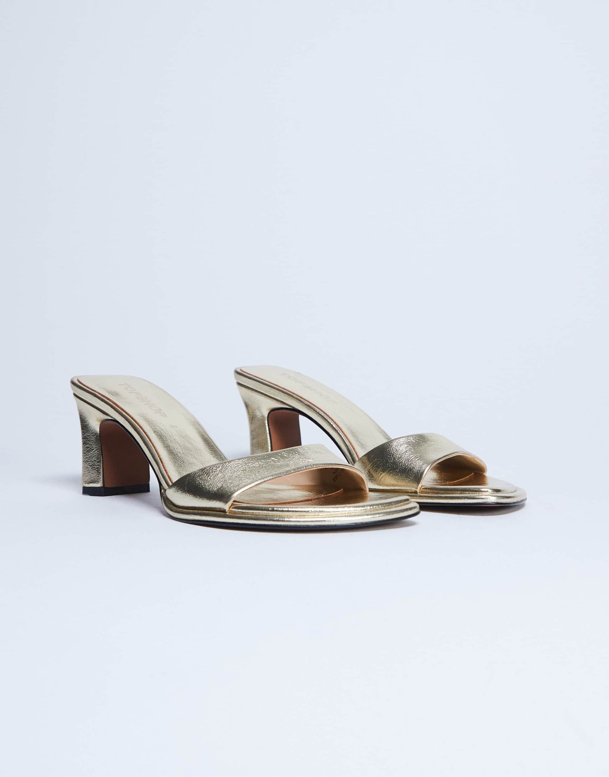 Schuhe von TopshopDie Ari-Mule ist eine Sandale mit Absatz, offener Zehenpartie und mittelhohem Blockabsatz. Dieses Modell ist aus einem goldfarbenen Metallic-Obermaterial gefertigt und eignet sich ideal für den Abend.