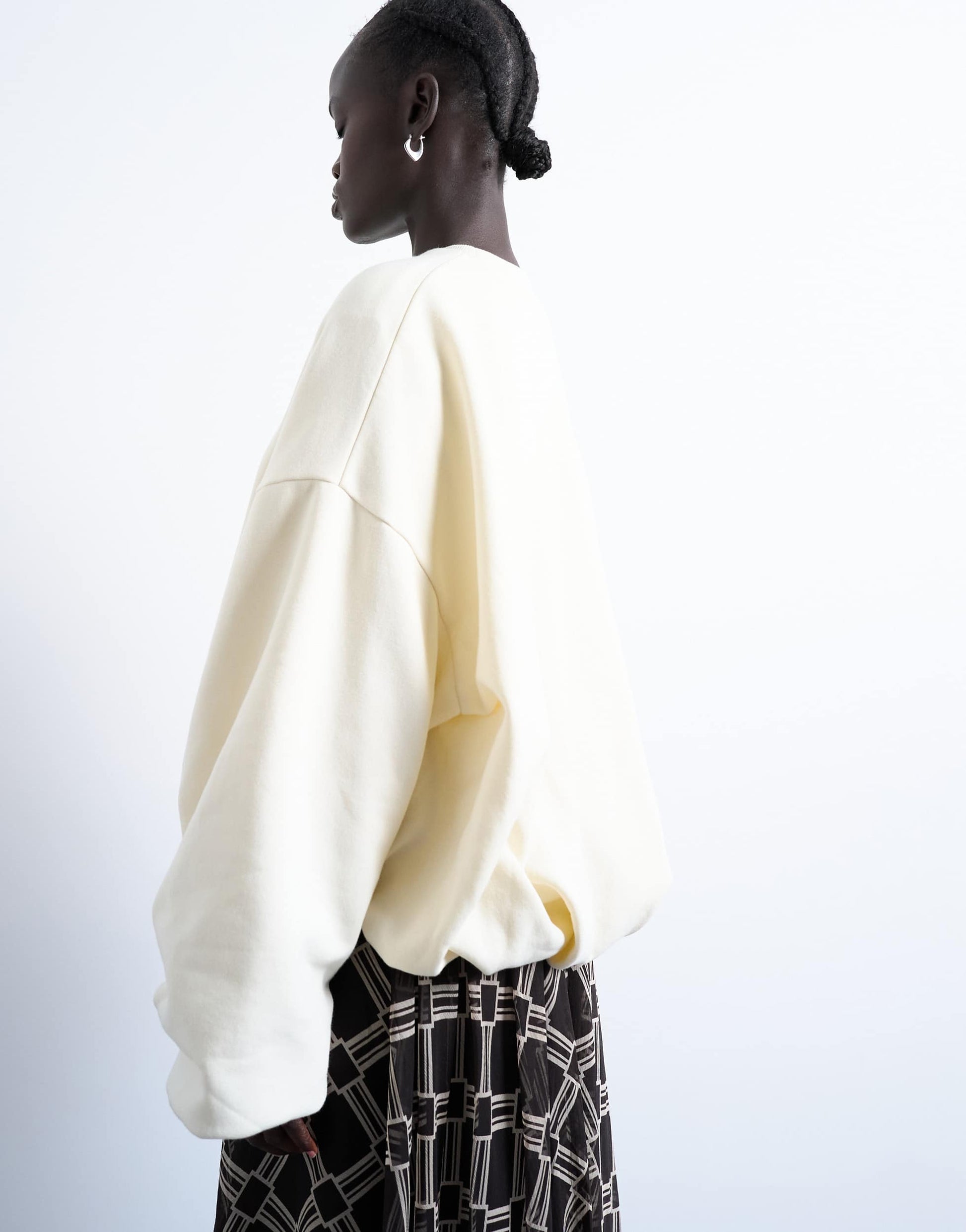 Dieses klassische Sweatshirt wurde mit einem voluminösen Ballon-Saum neu interpretiert. Es hat einen Rundhalsausschnitt, verlängerte Ärmel und eine lässige, lockere Passform.