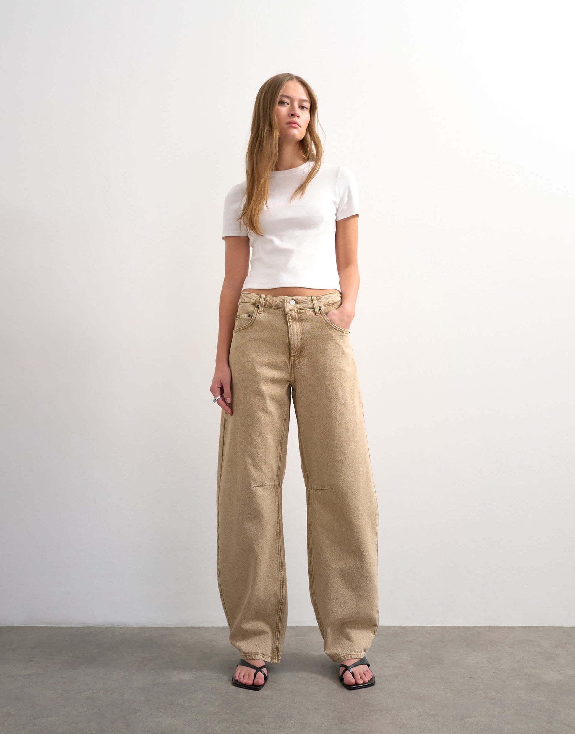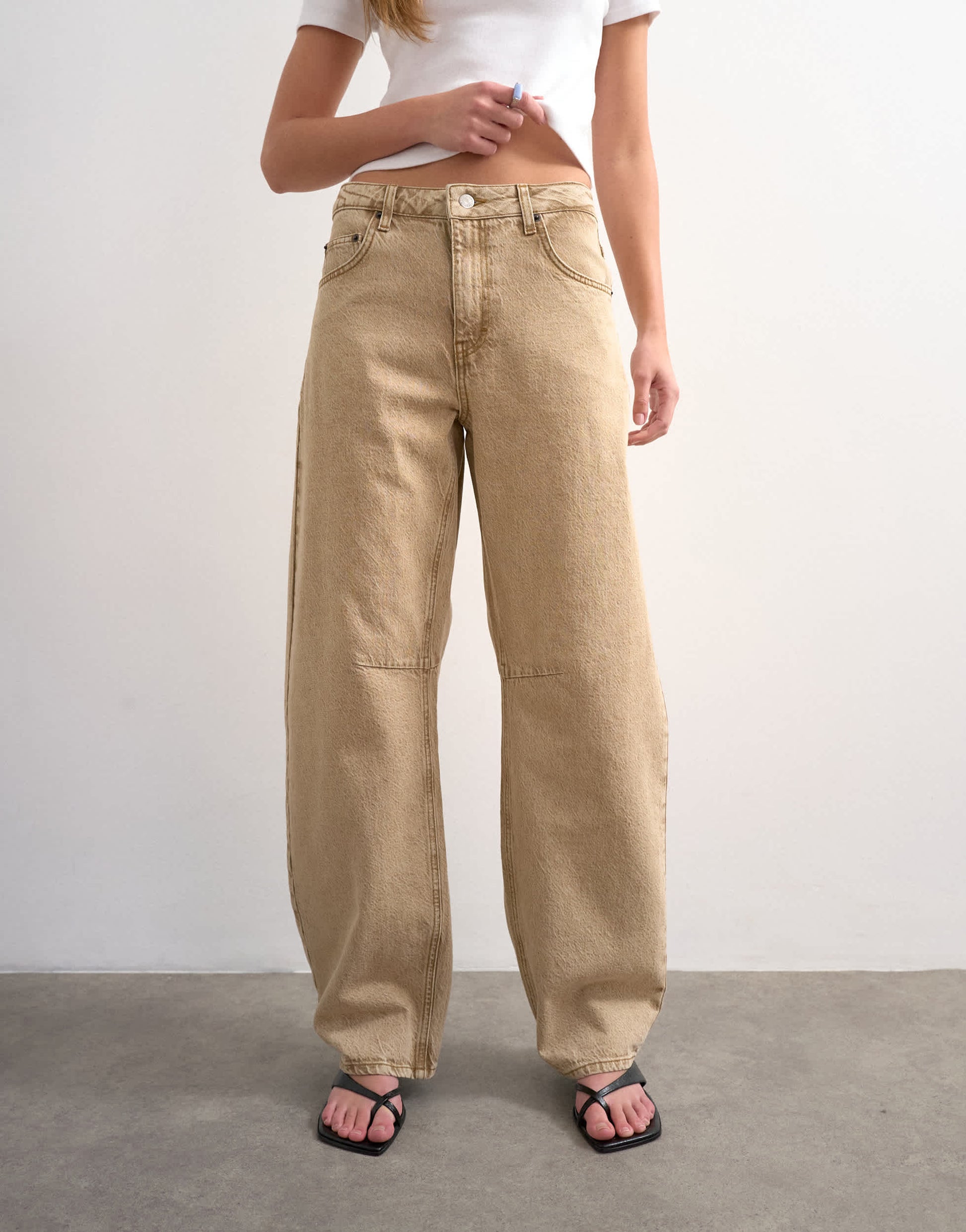 Jeans von TopshopDie Barrel-Jeans ist mit einer mittelhohen Taille und einem locker geschnittenen Bein, das zum Knöchel hin schmaler wird, versehen. Mit Reißverschluss, fünf Taschen und Gürtelschlaufen ist dieser Stil aus nicht dehnbarem Denim gefertigt, der sich klassisch anfühlt und in einem Used-Beige-Ton gewaschen ist.