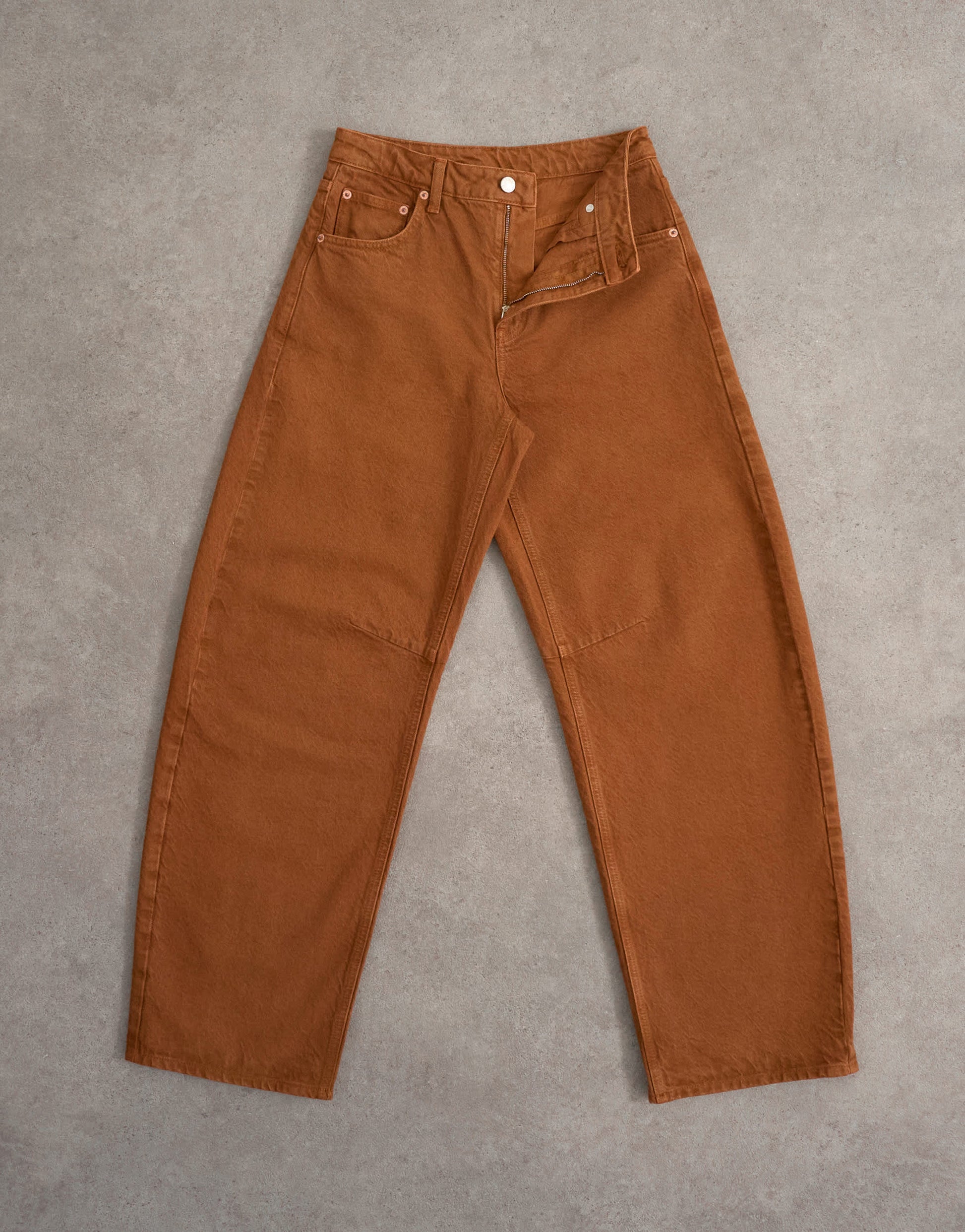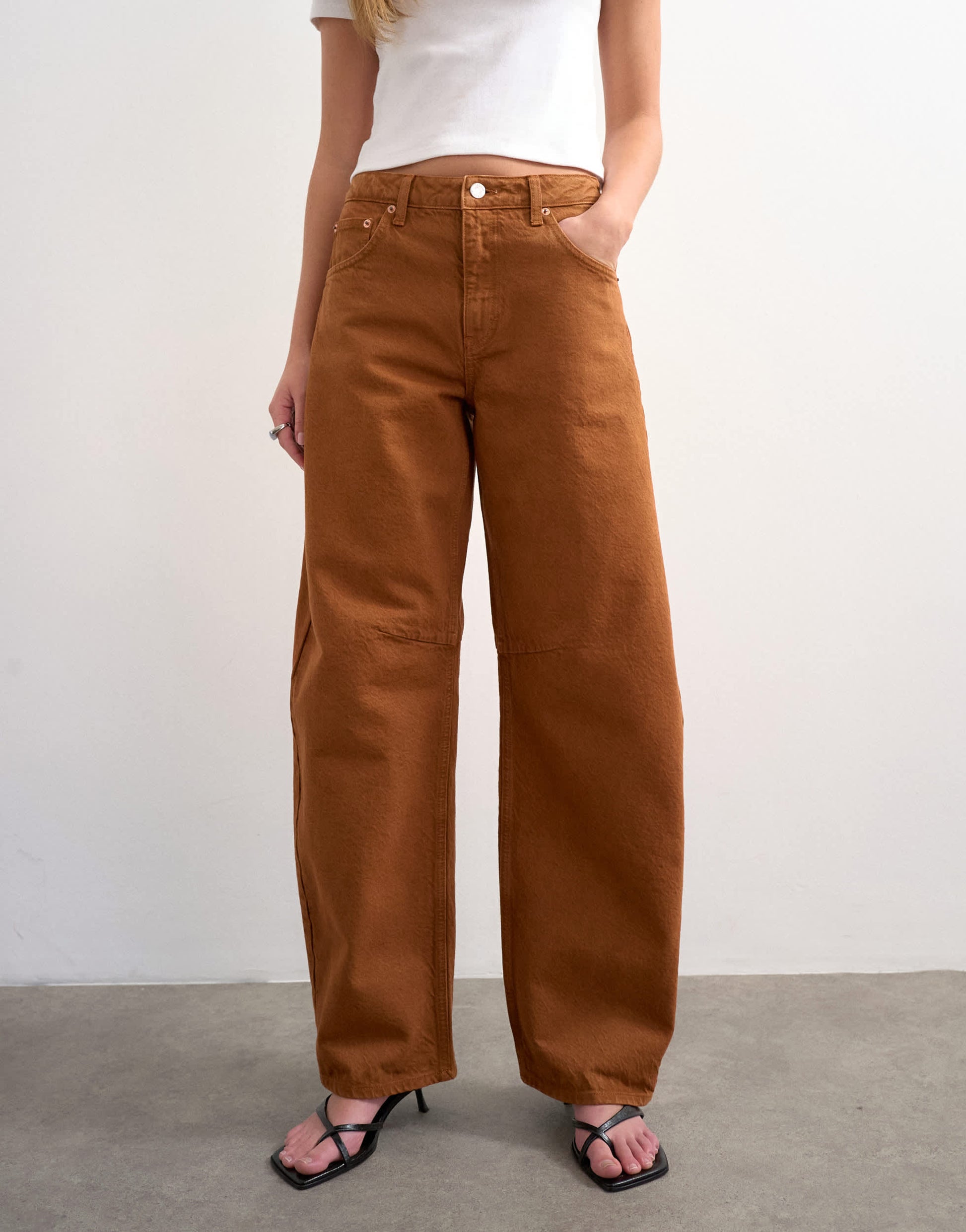 Jeans by TopshopThe Barrel jeans are cut with a mid-rise waist and a loose-fit leg that tapers at the ankle. Featuring a zip fly, five pockets and belt loops, this style is crafted from non-stretch denim for a classic feel in a toffee-brown wash.
