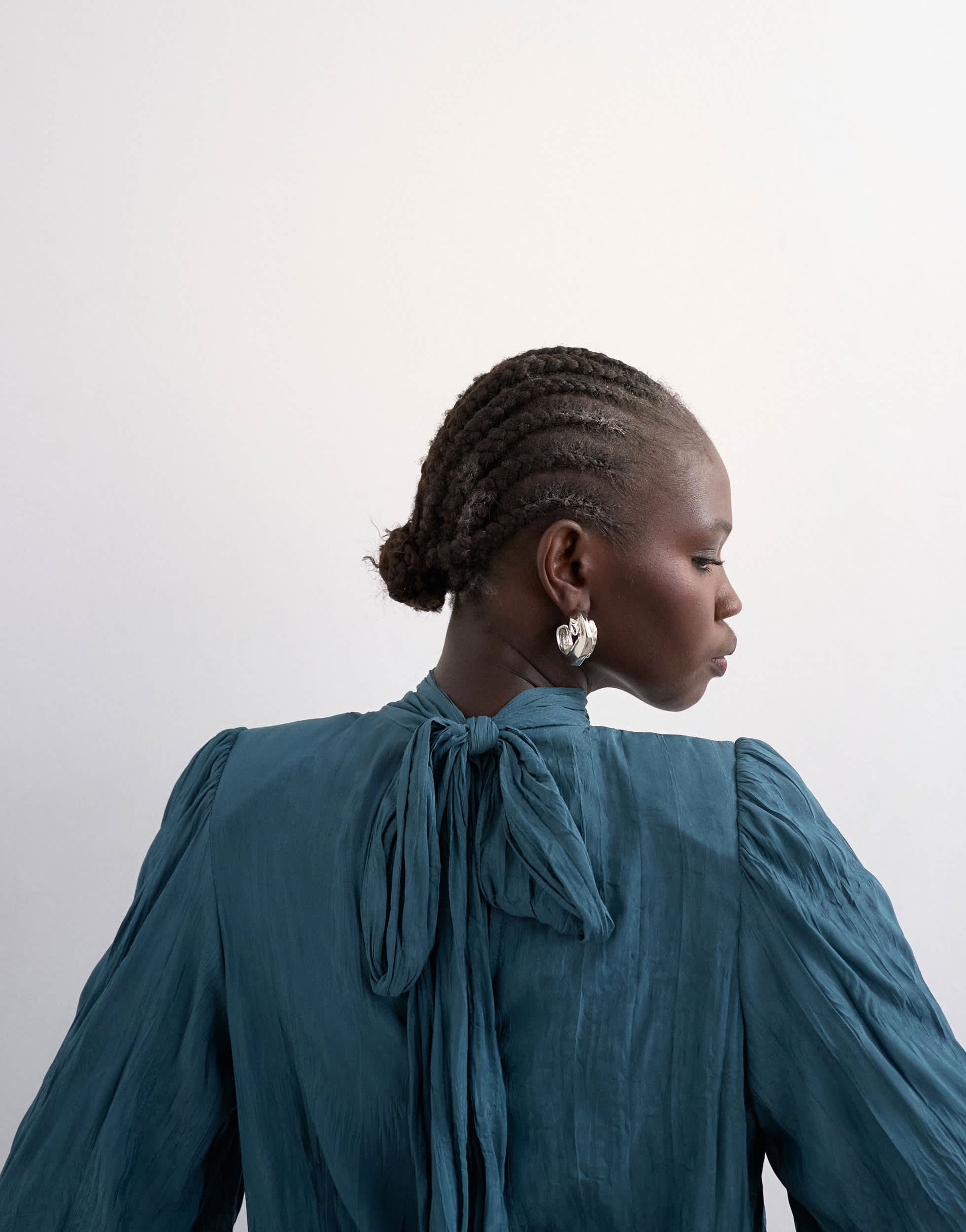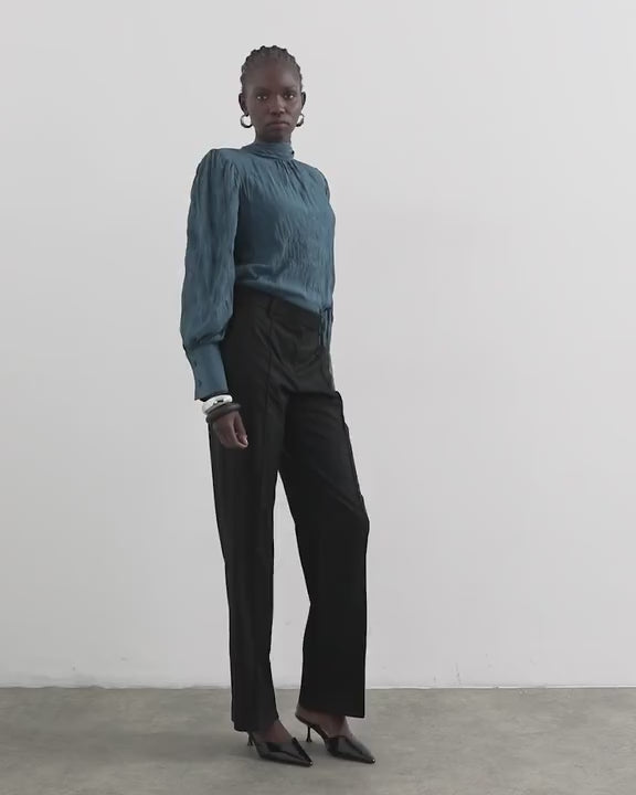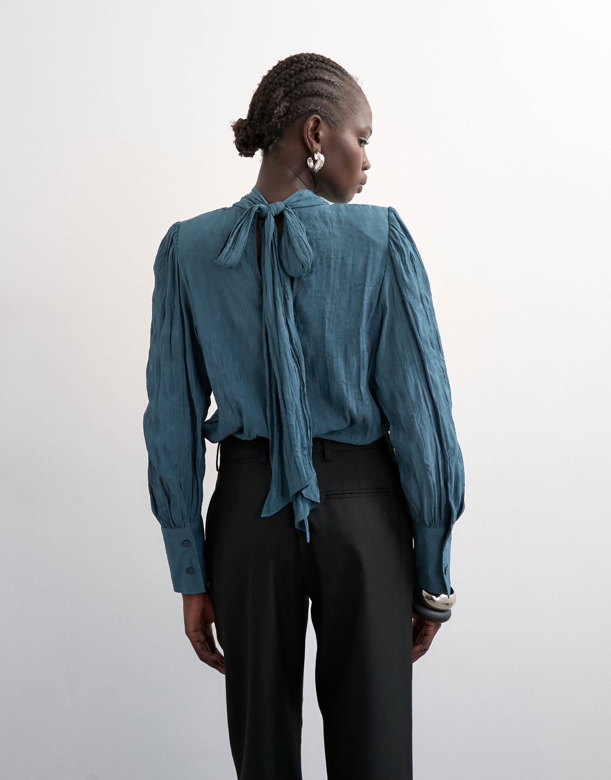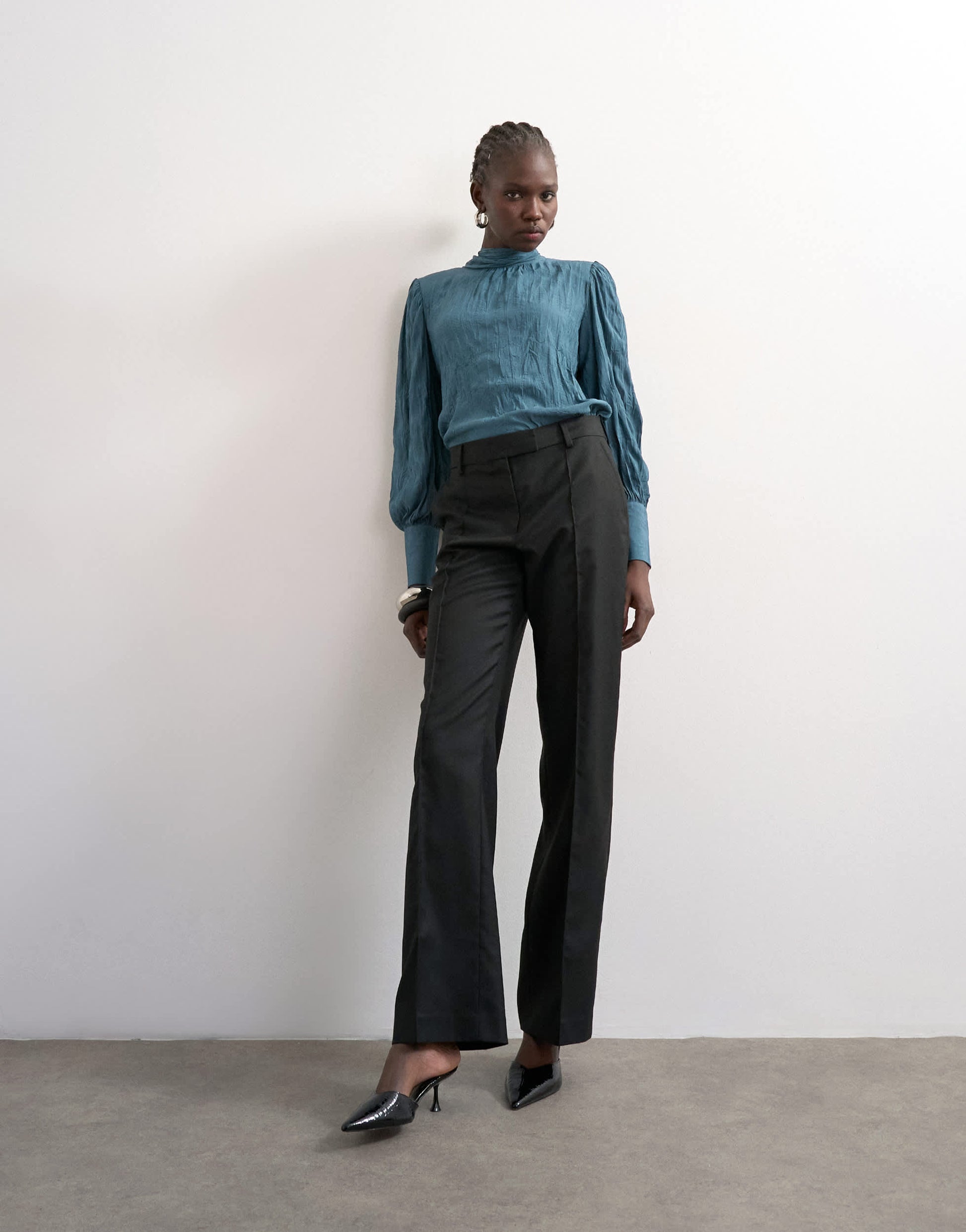Oberteile von TopshopDiese Bluse ist aus einem strukturierten Webstoff in einem Blauton gefertigt. Sie hat einen hohen Kragen, lange Ärmel, einen Bindegürtel im Rücken und eine normale Passform.