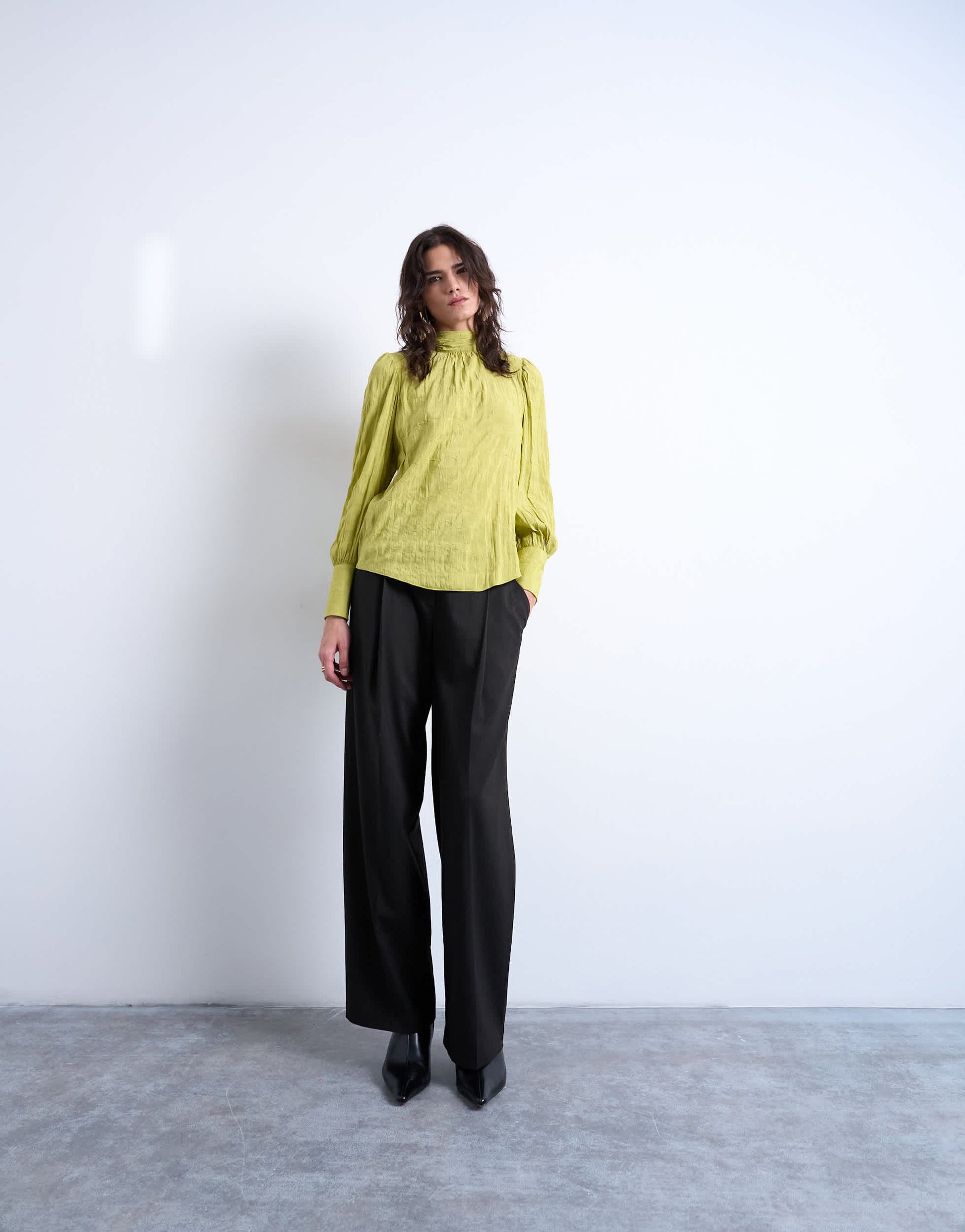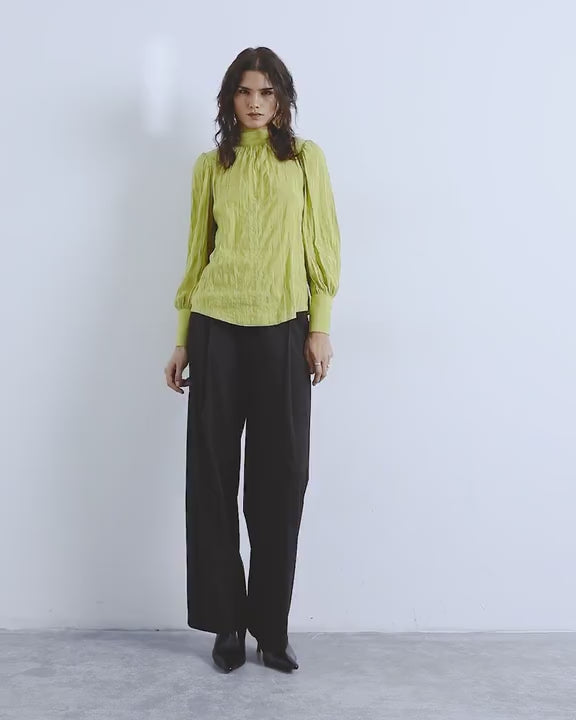 Diese Bluse ist aus einem strukturierten Webstoff in Grün gefertigt. Sie hat einen hohen Kragen, lange Ärmel, einen Bindegürtel im Rücken und eine normale Passform.