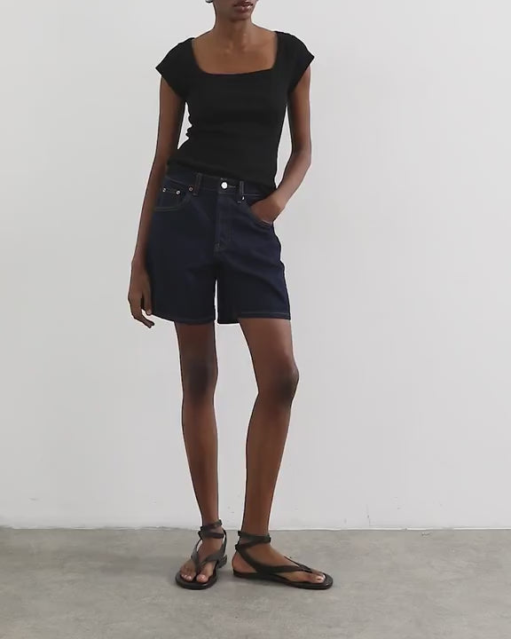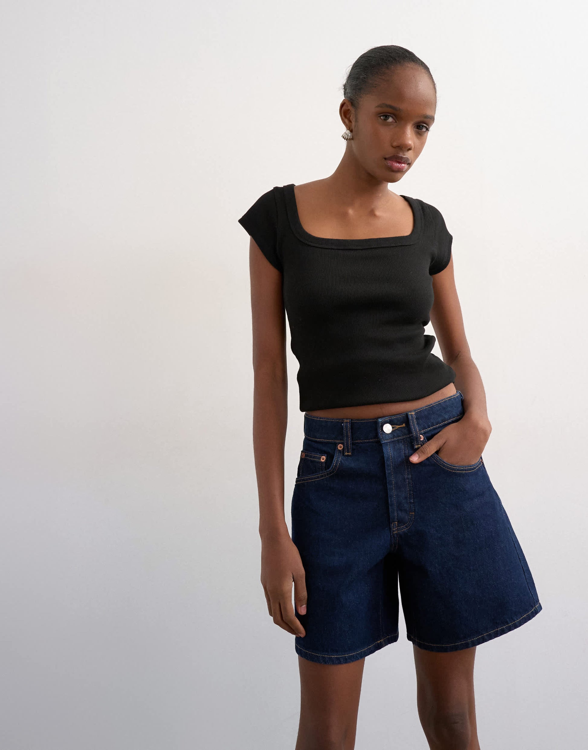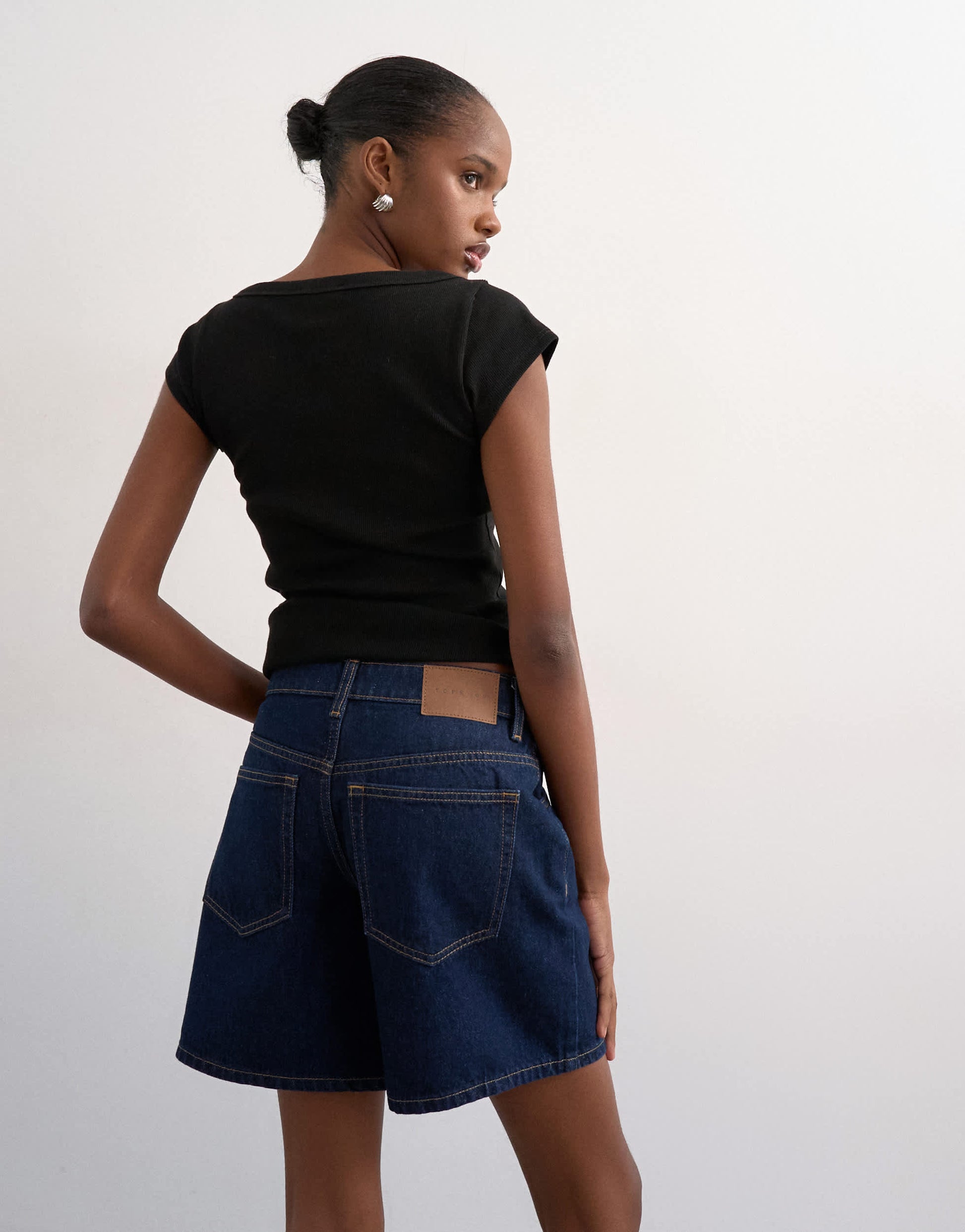 Shorts von TopshopDiese Shorts sind aus nicht dehnbarem Denim in Dunkelblau gefertigt. Sie haben einen hohen Bund, Gürtelschlaufen, praktische Taschen und einen Markenaufnäher auf der Rückseite. Die Passform ist regulär.