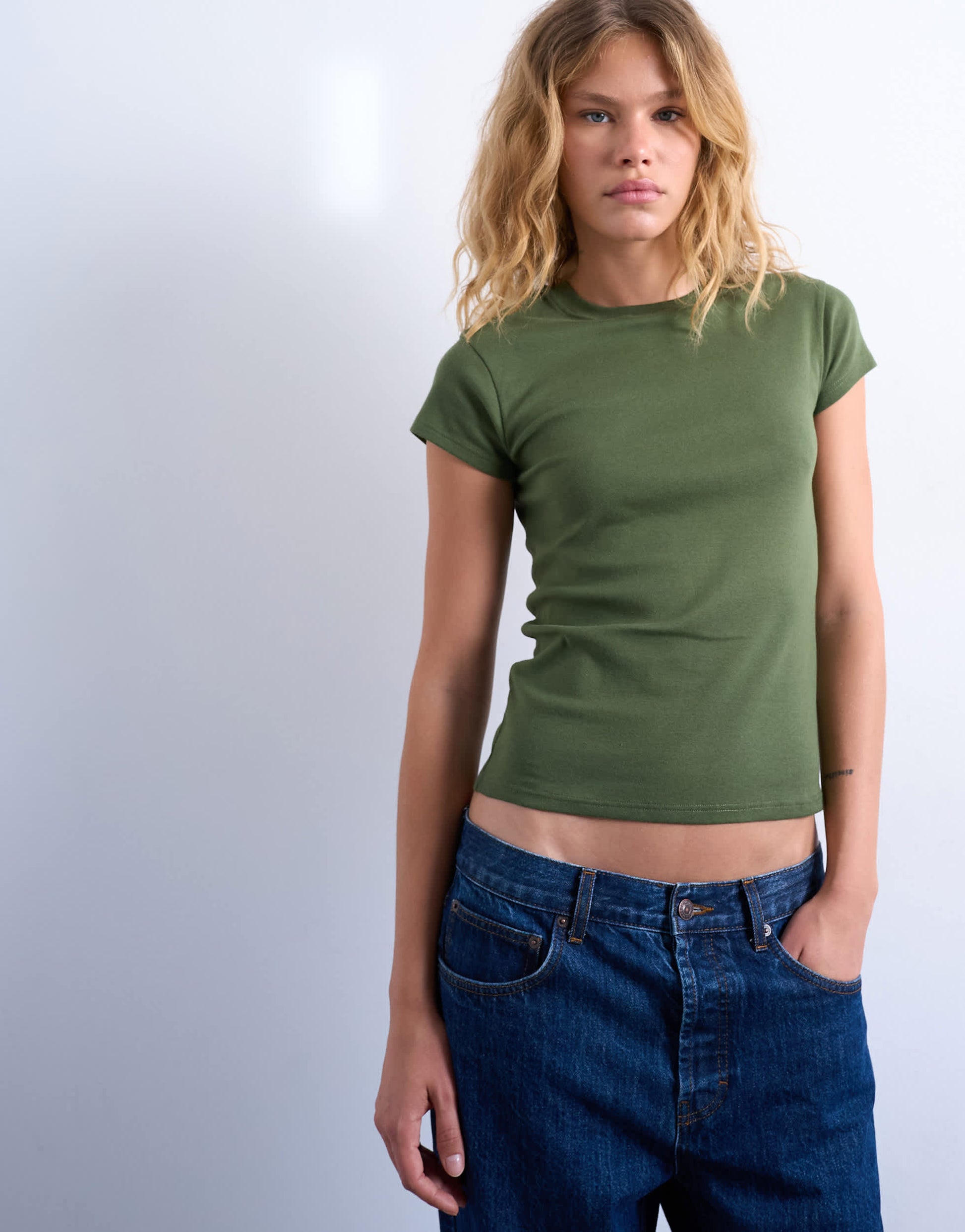 Oberteile von TopshopDieses alltagstaugliche T-Shirt ist aus weichem, dehnbarem Jersey in einem dunklen Khakiton gefertigt. Es hat einen Rundhalsausschnitt, kurze Ärmel und ist schmal geschnitten.