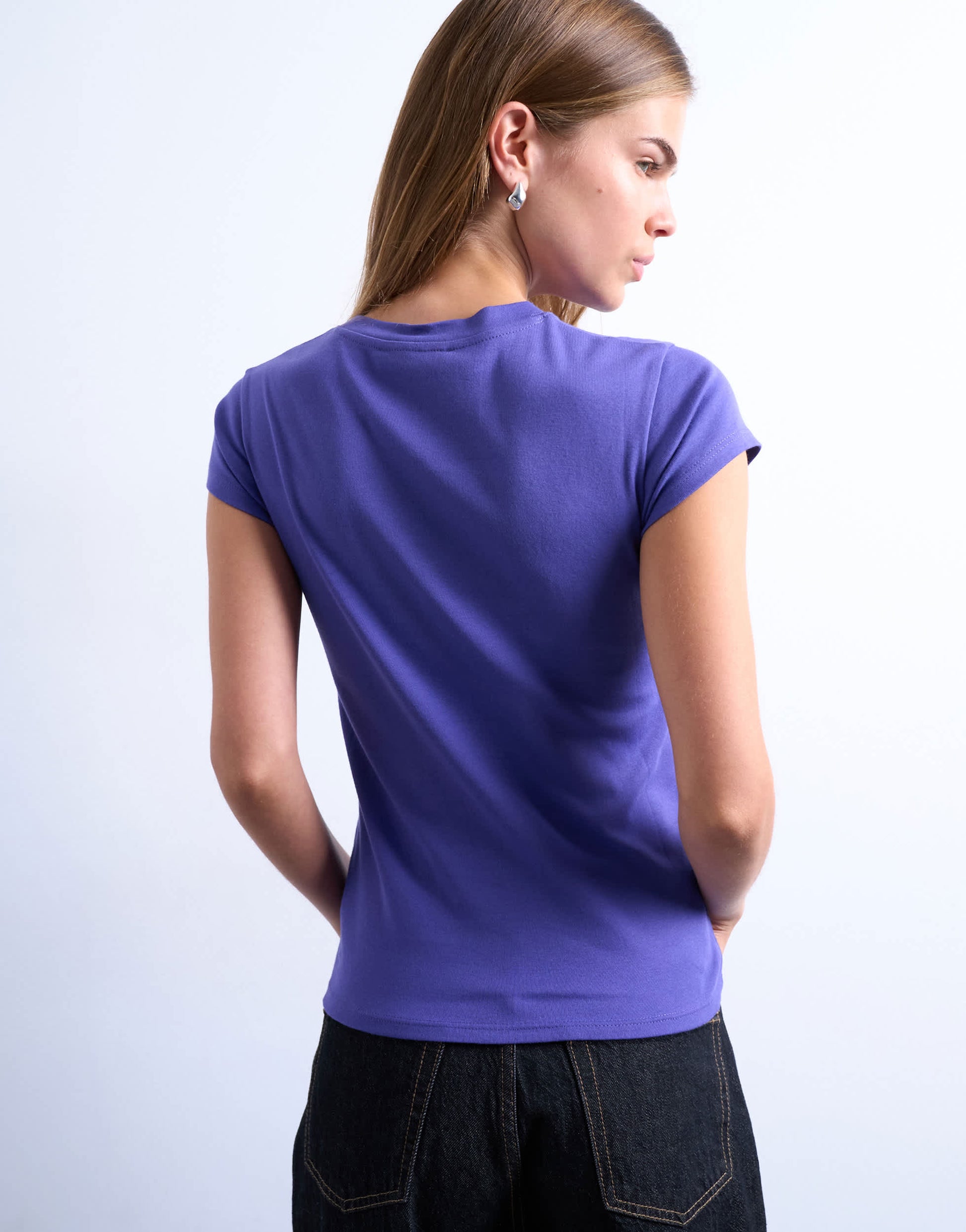Oberteile von TopshopDieses alltagstaugliche T-Shirt ist aus weichem, dehnbarem Jersey in einem Lilaton gefertigt. Es hat einen Rundhalsausschnitt, kurze Ärmel und ist schmal geschnitten.