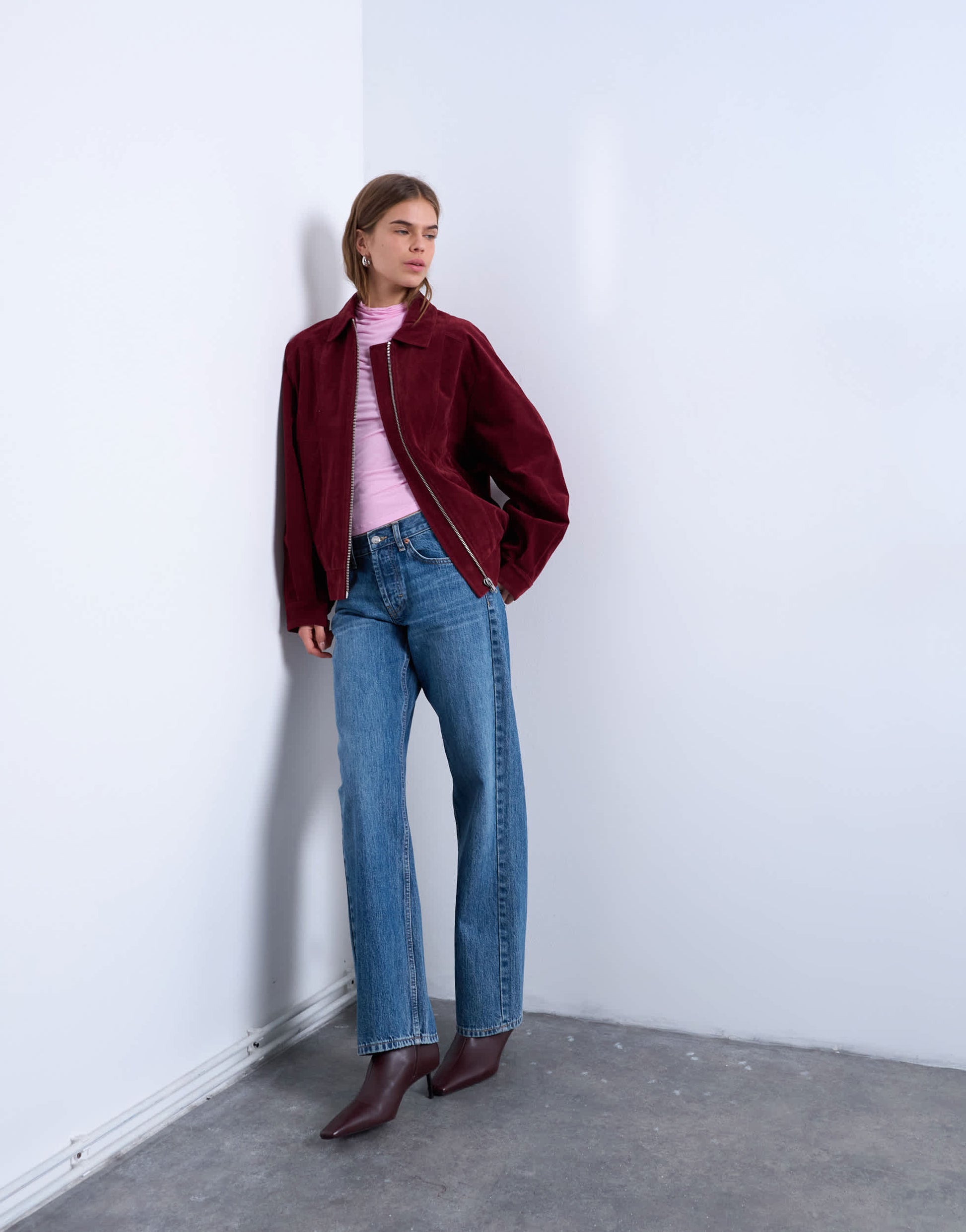 Mäntel und Jacken von TopshopDiese Jacke aus weich strukturiertem Stoff in einem tiefen Rotton verfügt über einen spitzen Kragen, einen silberfarbenen Reißverschluss, zwei Taschen und eine Oversized-Passform.
