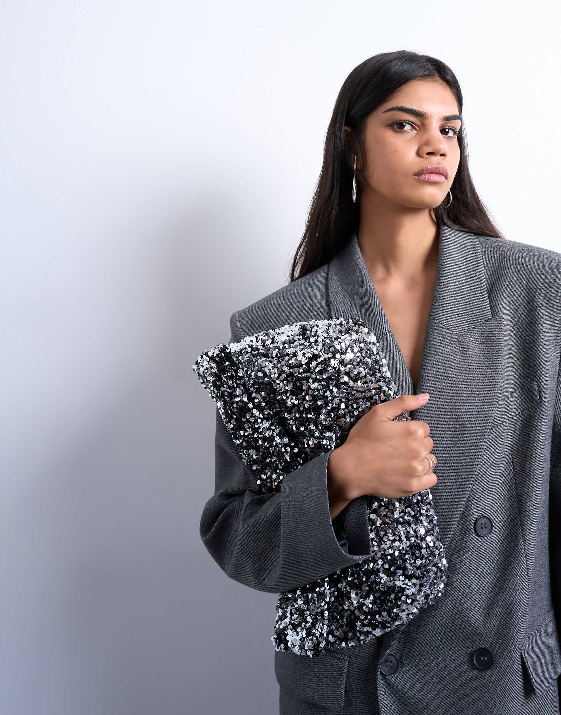 Accessoires von TopshopDiese auffällige Handtasche ist mit silbernen Pailletten übersät. Sie hat eine übergroße, umklappbare Form und ist als Clutch konzipiert.