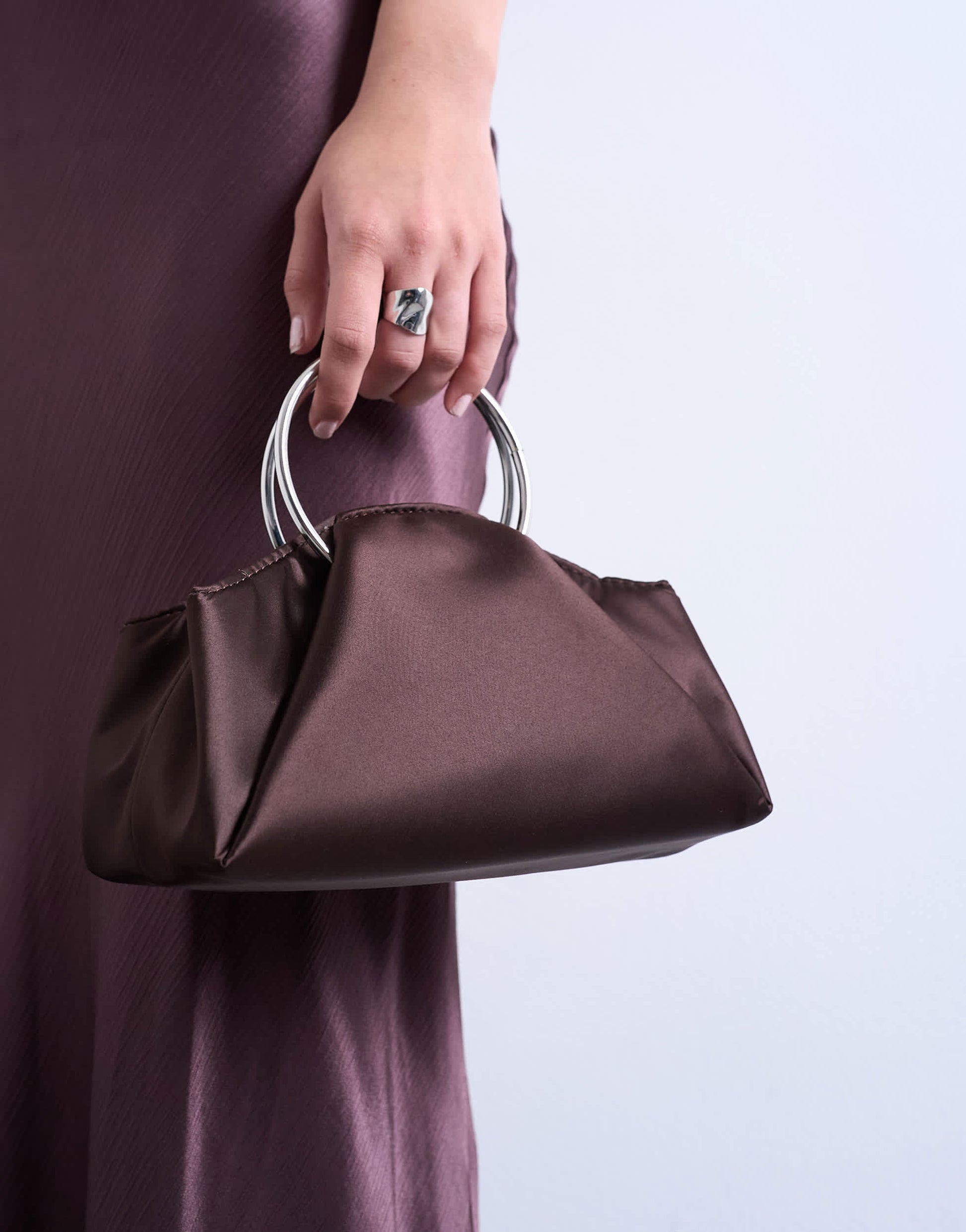 Accessoires von TopshopDie Ginny-Tasche ist aus glänzendem, satinartigem Stoff in einem schokoladenbraunen Farbton gefertigt. Mit ihren abgerundeten Metallgriffen und den Raffungen ist sie ein unverzichtbares Accessoire für den Abend.