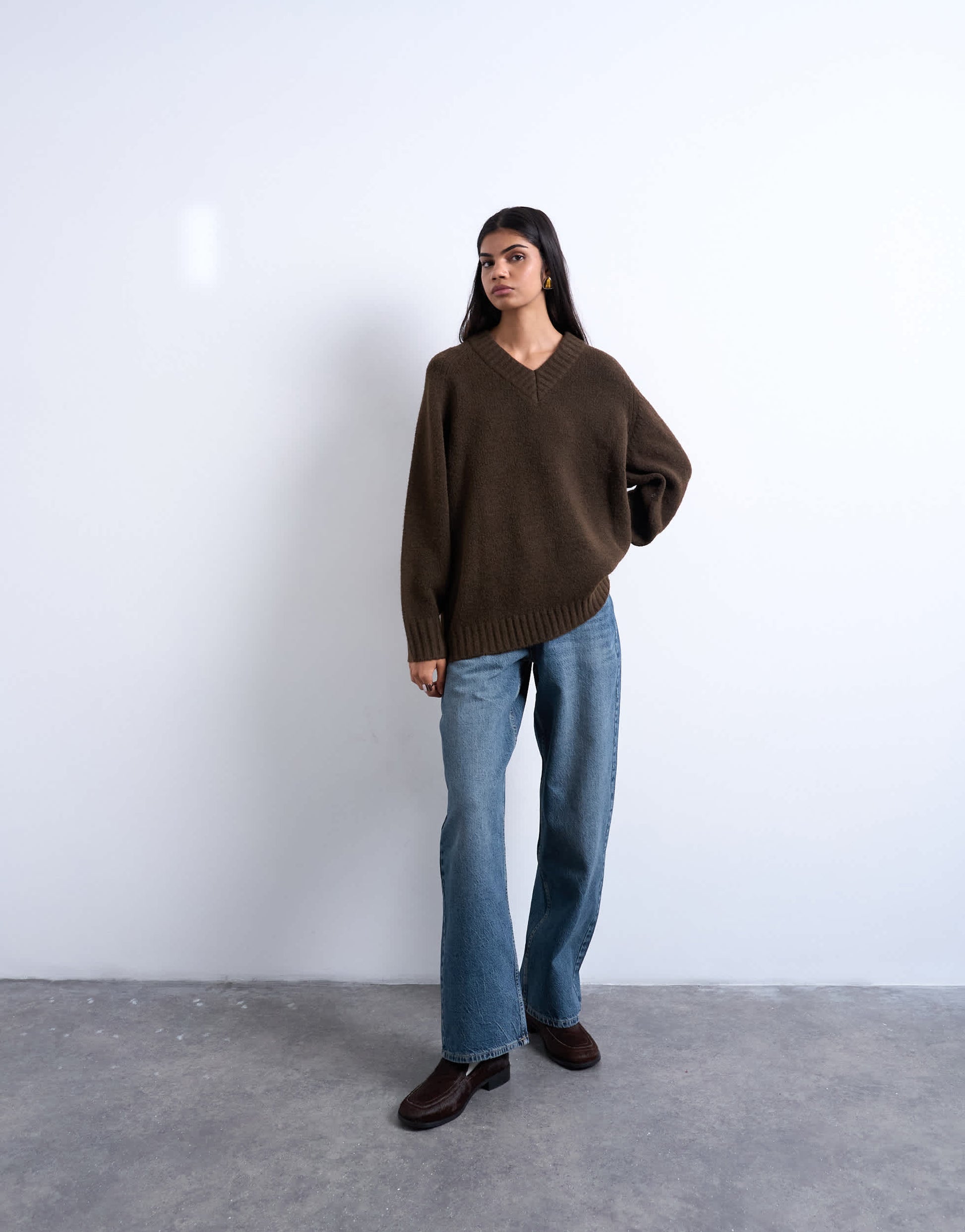 Pullover und Strickjacken von TopshopDieser Pullover ist aus weichem Strick in einem schokoladenbraunen Farbton gefertigt. Er hat einen V-Ausschnitt und Raglanärmel und ist locker geschnitten für einen lässigen Look.