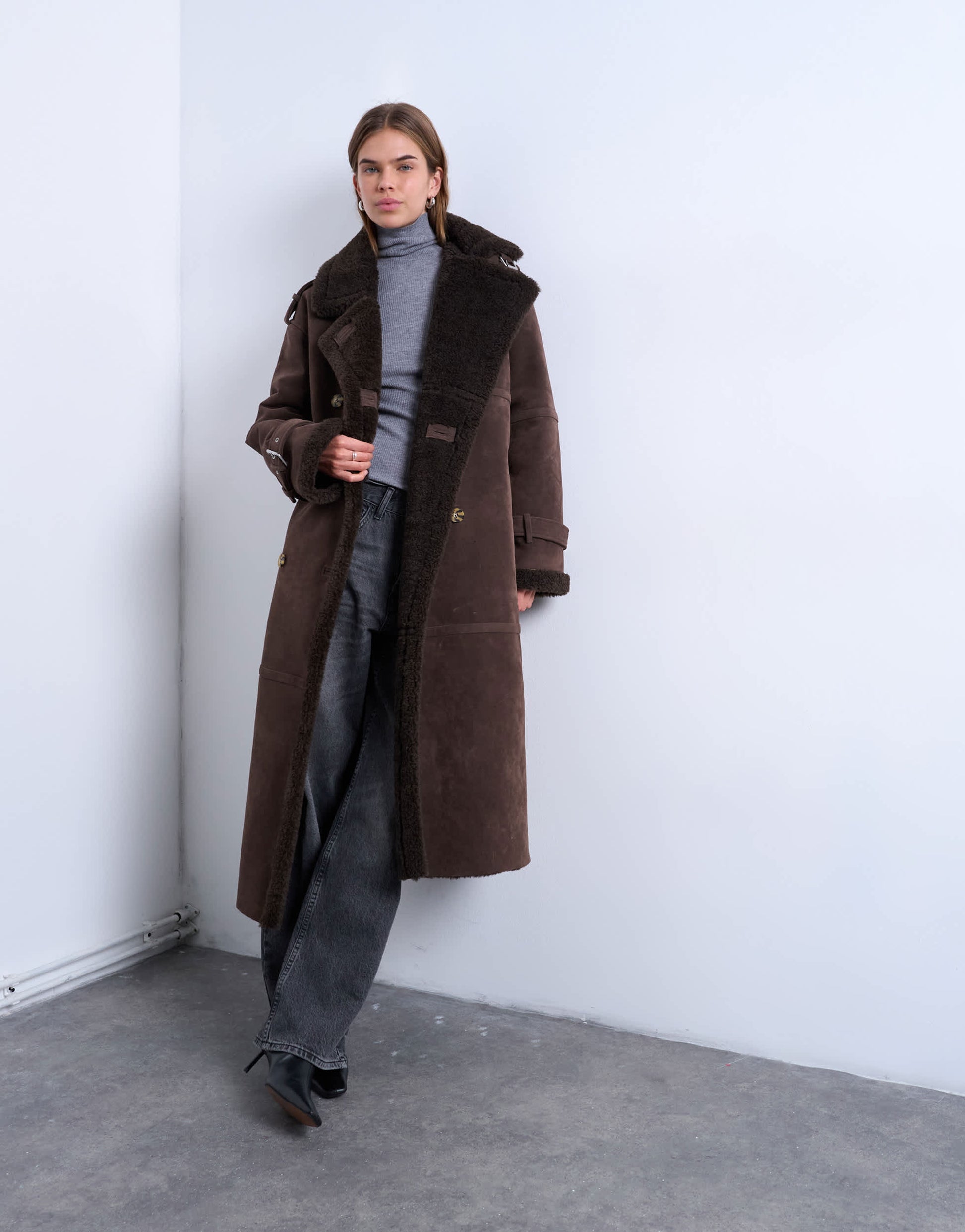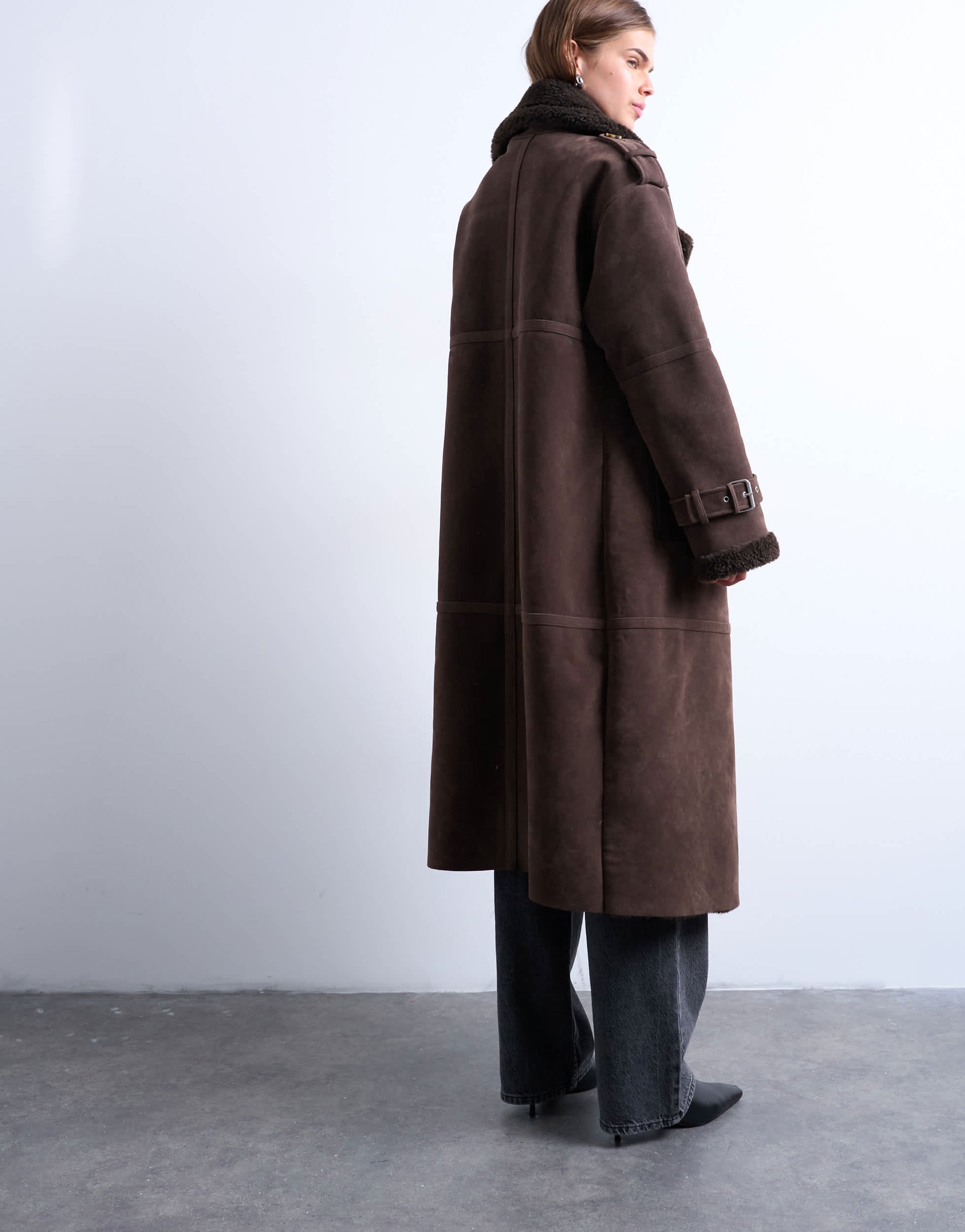 Mäntel und Jacken von TopshopDiese doppelreihige Fliegerjacke besticht durch einen hohen Kragen, eine Knopfleiste, Seitentaschen und eine lange Silhouette. Sie ist aus weichem, strukturiertem Stoff gefertigt und mit Borg-Fleece gefüttert.