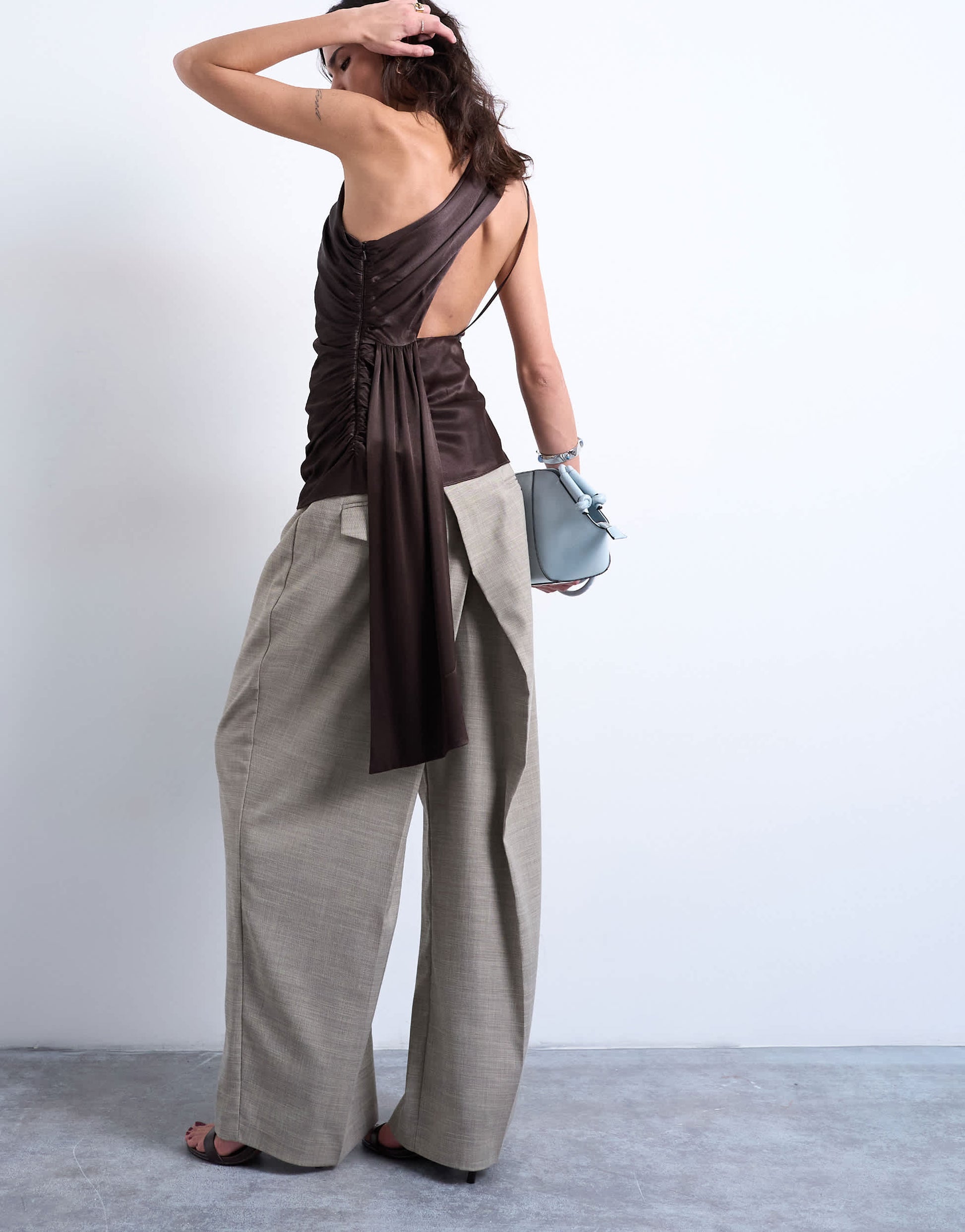 Oberteile von TopshopDieses elegante, schokoladenbraune Top besticht durch sein asymmetrisches Design, den offenen Rücken und den drapierten Schal. Es ist aus glänzendem, satinartigem Stoff gefertigt und fühlt sich dadurch besonders edel an.