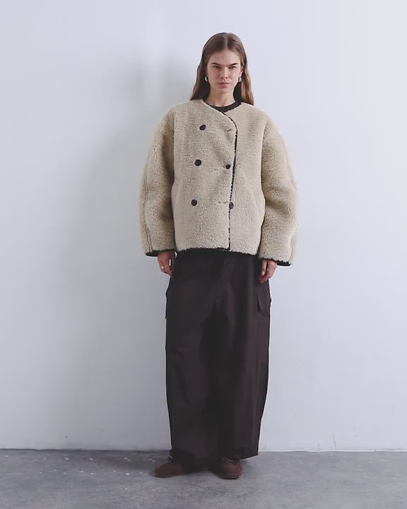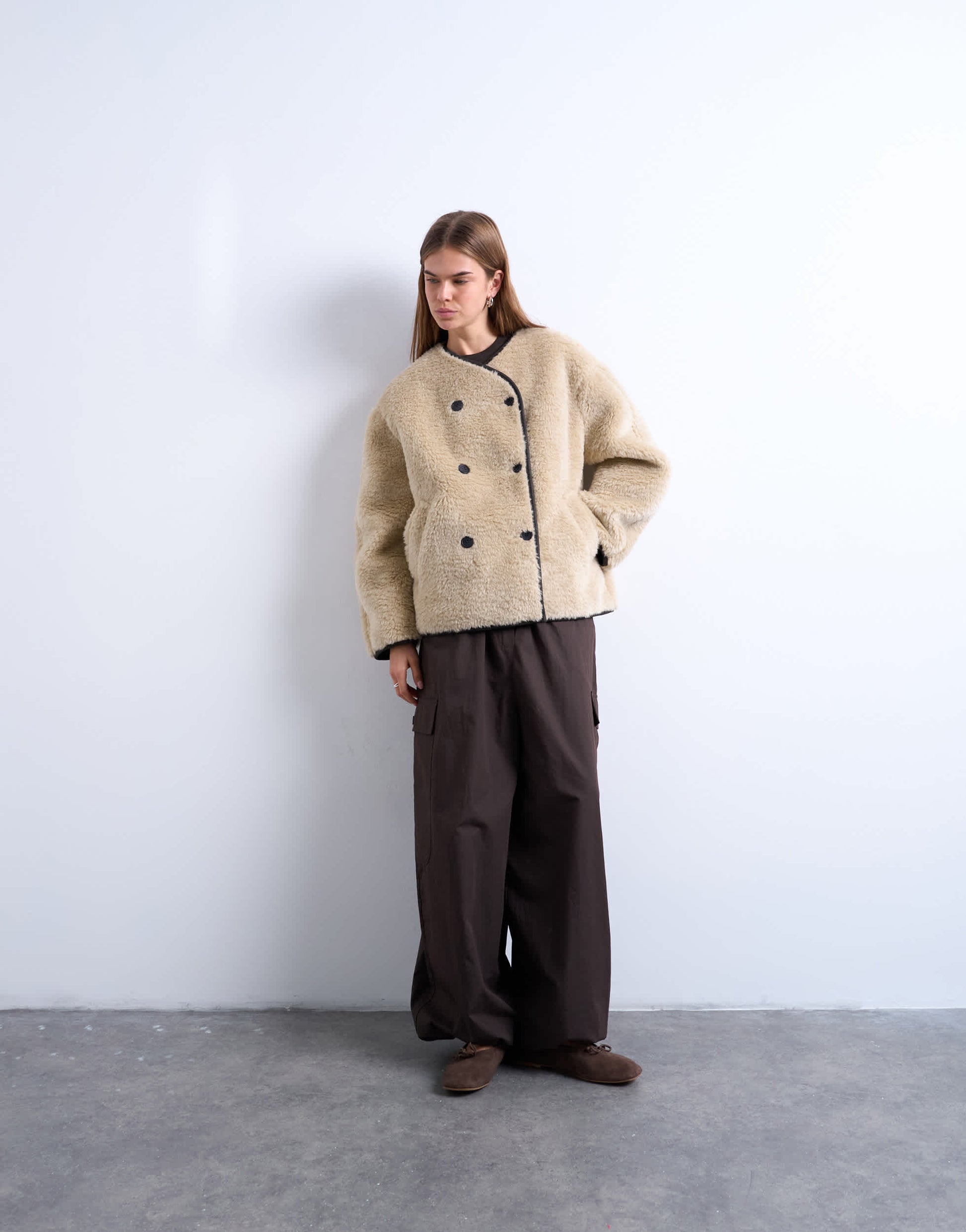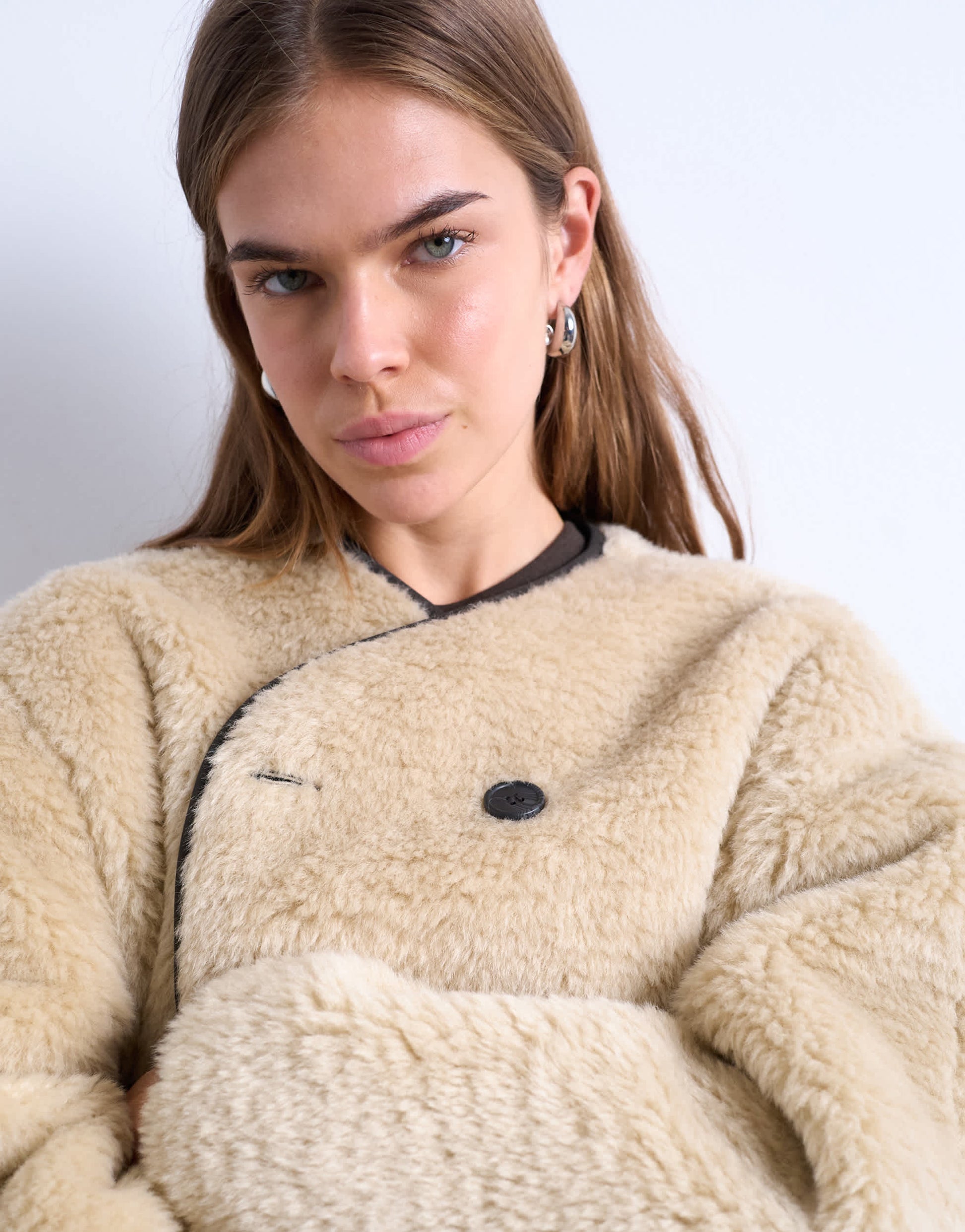 Mäntel und Jacken von TopshopDiese Jacke aus kuscheligem Borg-Stoff besticht durch einen V-Ausschnitt, eine doppelreihige Knopfleiste, voluminöse Ärmel und Seitentaschen. Sie ist leicht strukturiert und oversized geschnitten.