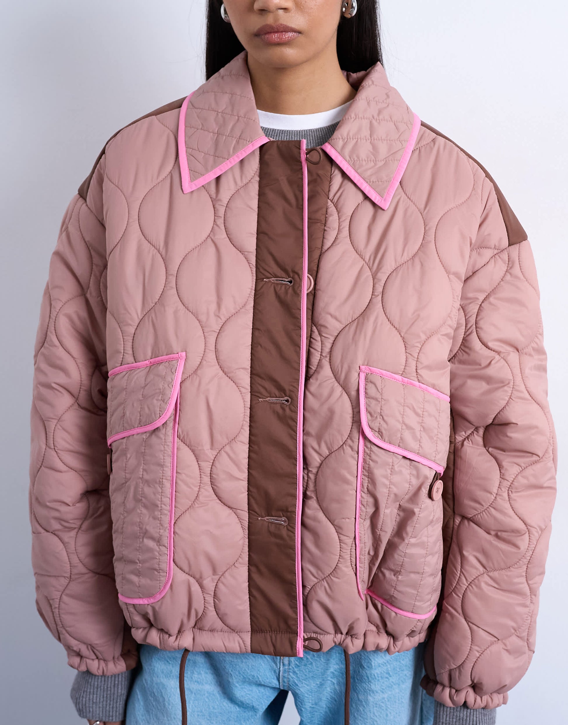 Mäntel und Jacken von TopshopDiese Jacke ist aus gewebtem Stoff in einem Rosaton gefertigt. Sie verfügt über einen Kentkragen, eine Knopfleiste und aufgesetzte Taschen, ist locker geschnitten und mit kontrastierenden Paspeln versehen.