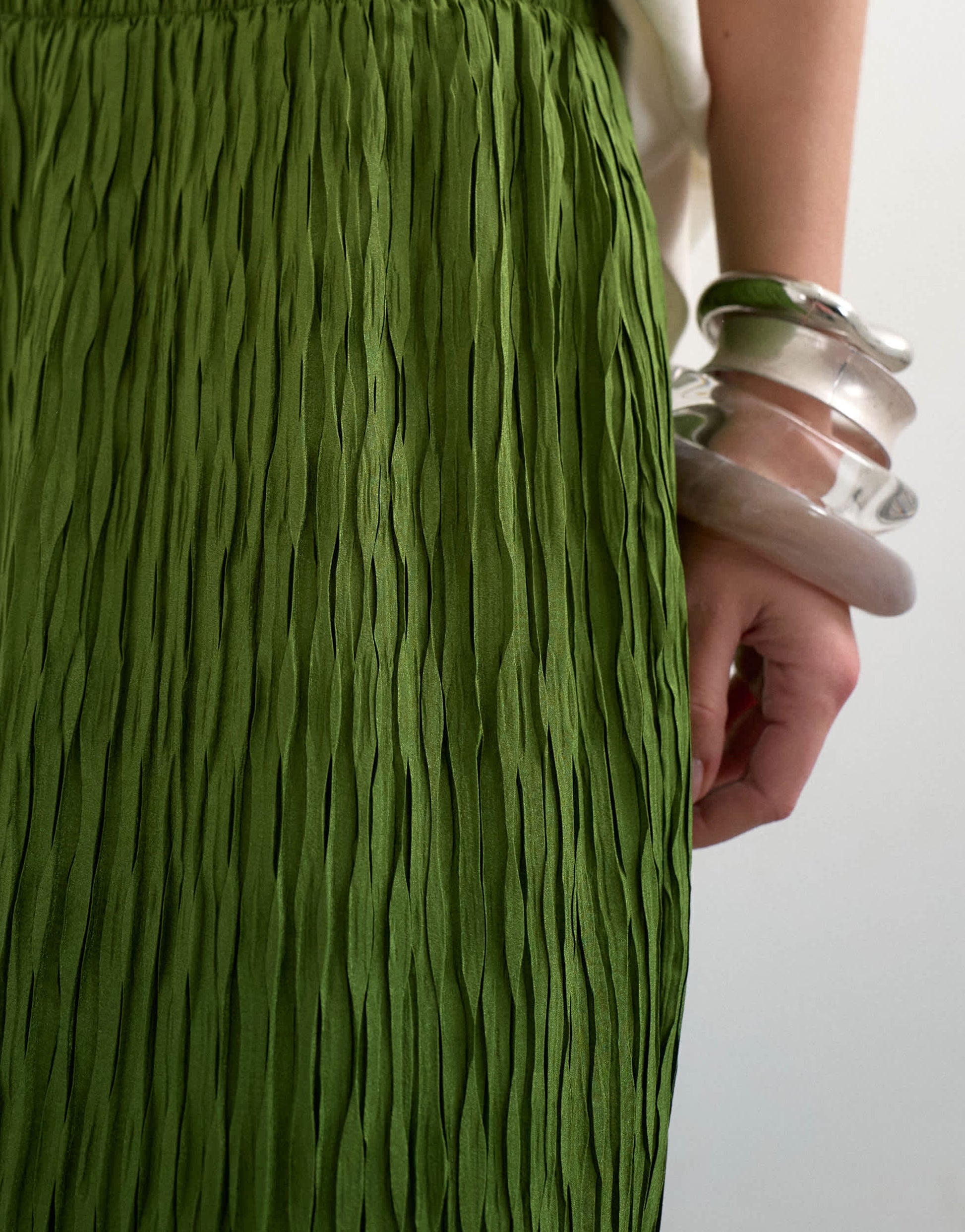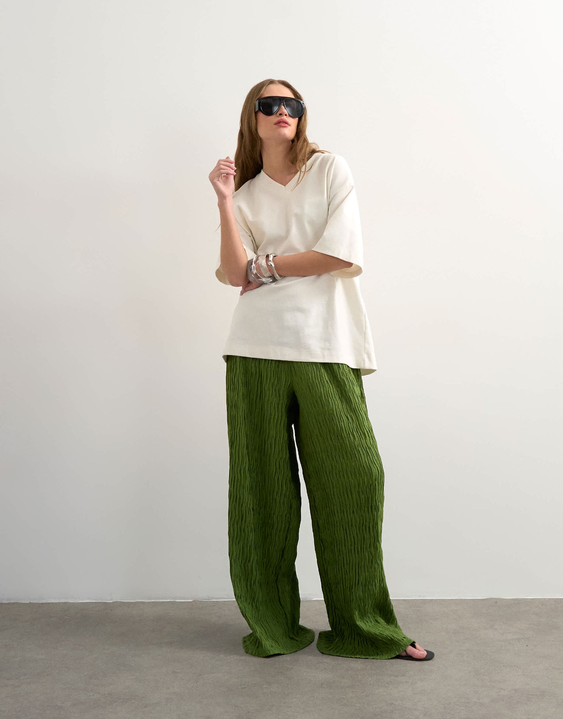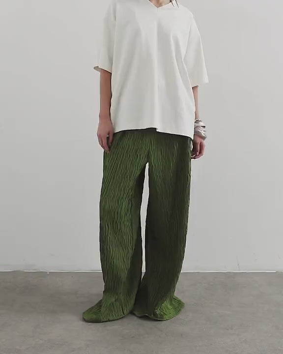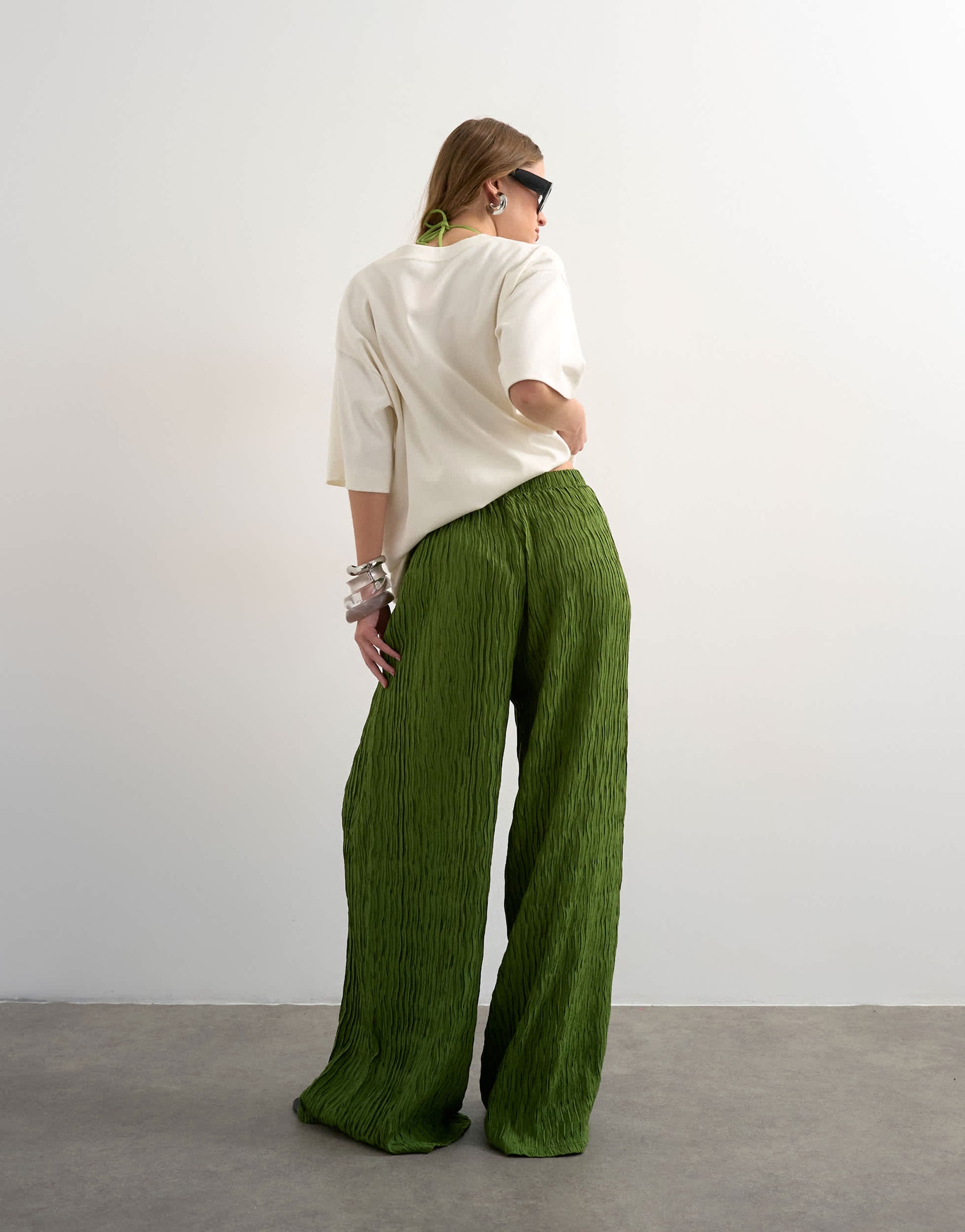 Diese Hose ist aus leichtem Plissee in Grün gefertigt. Sie hat einen elastischen, mittelhohen Bund und ist für einen lässigen Tragekomfort weit geschnitten.