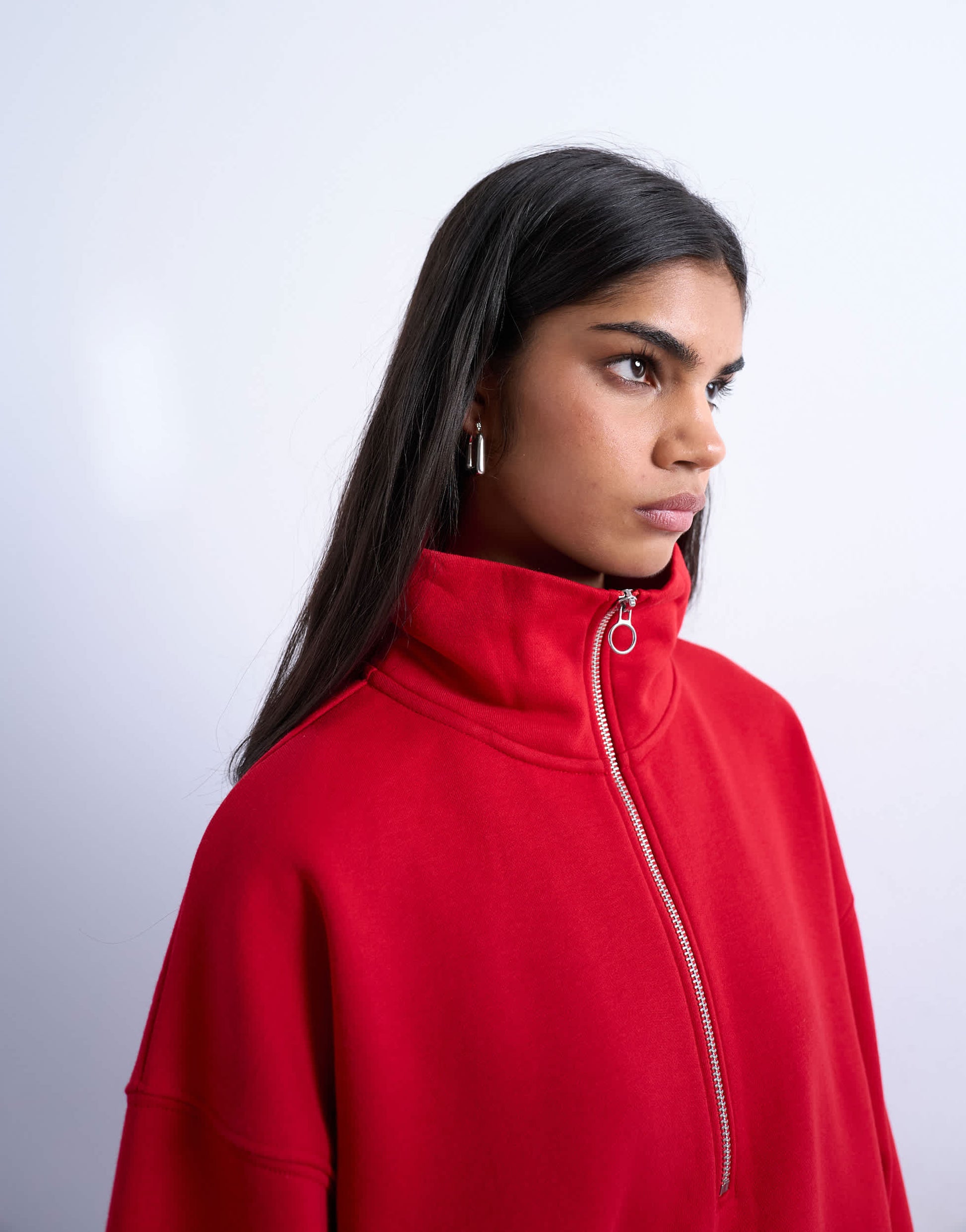 Hoodies & Sweatshirts von TopshopDieses Sweatshirt aus dickem, rotem Jersey hat einen Stehkragen, einen teilweisen Reißverschluss und überschnittene Schultern. Der lockere Schnitt sorgt für einen lässigen Look.