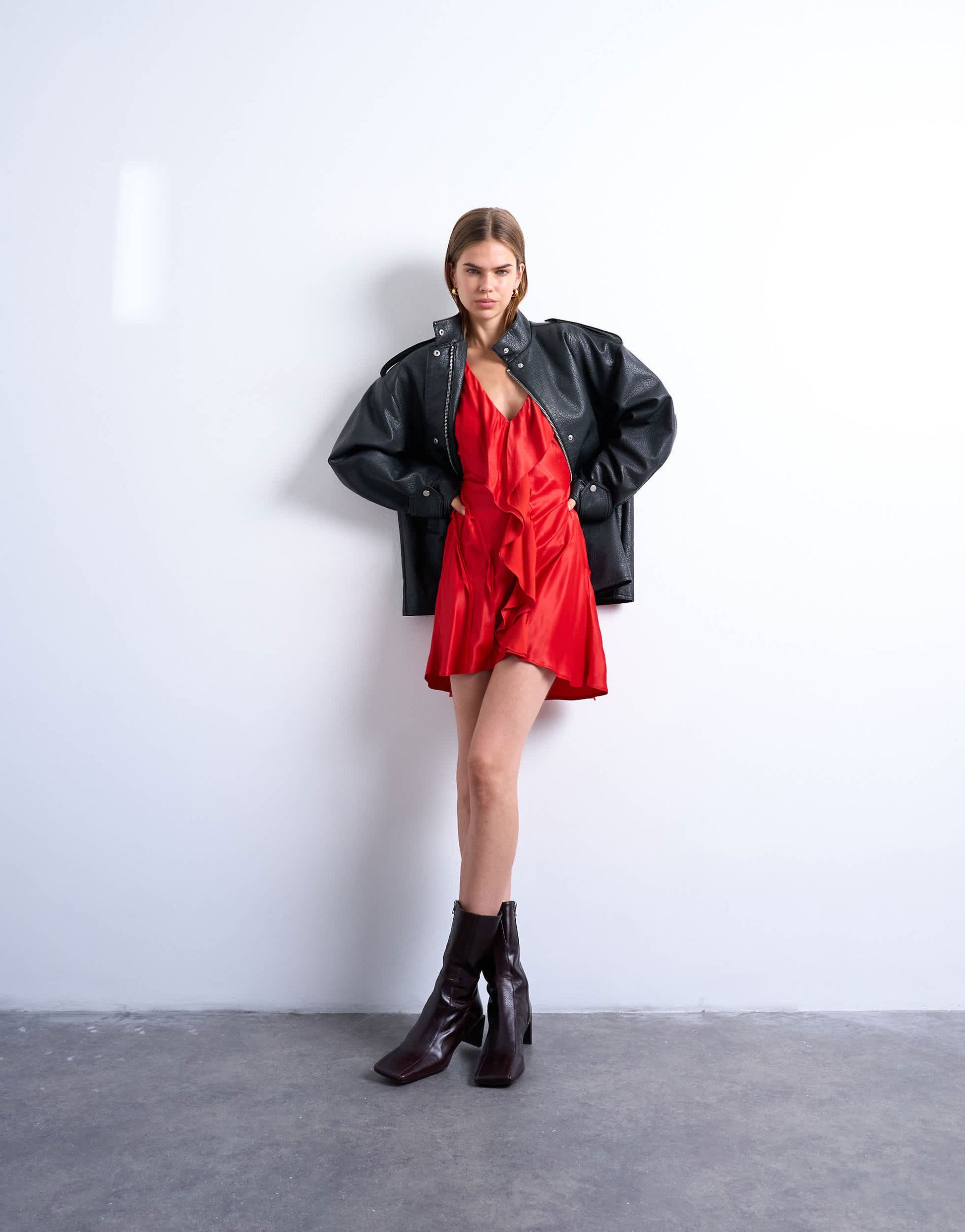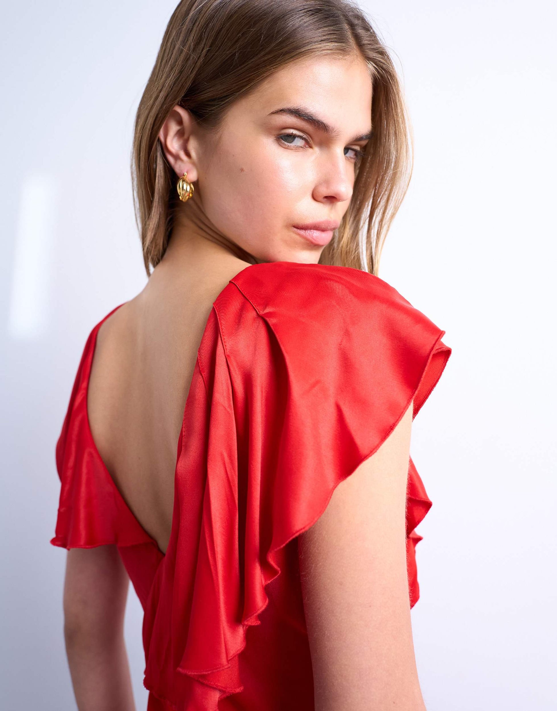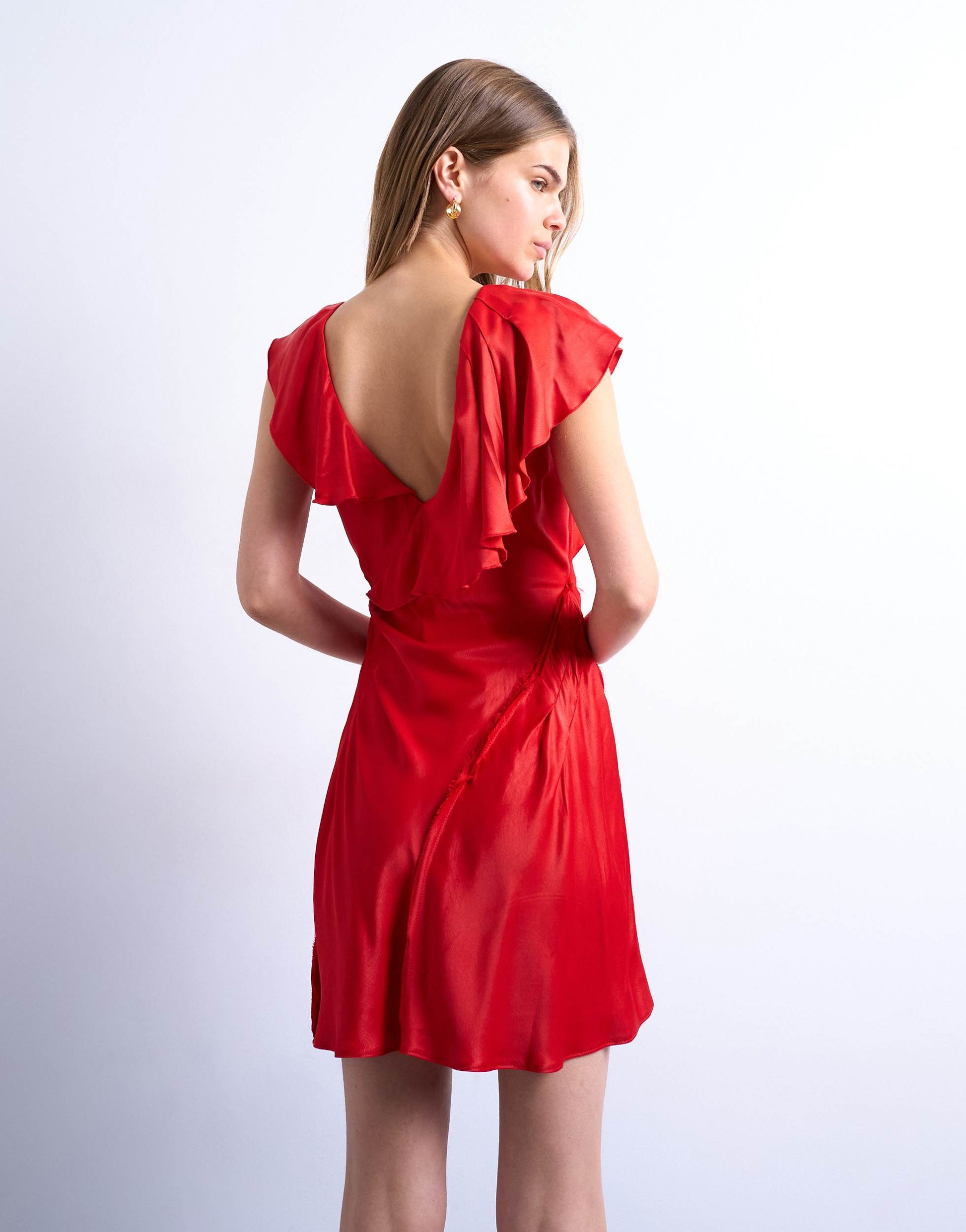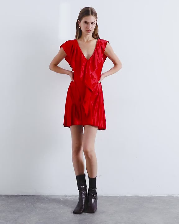 Kleider von TopshopDieses Kleid ist aus einem gewebten, satinartigen Stoff in einem leuchtenden Rot gefertigt. Das ärmellose Design wird durch Rüschen und einen V-Ausschnitt ergänzt. Es hat eine reguläre Passform und ist kurz geschnitten.